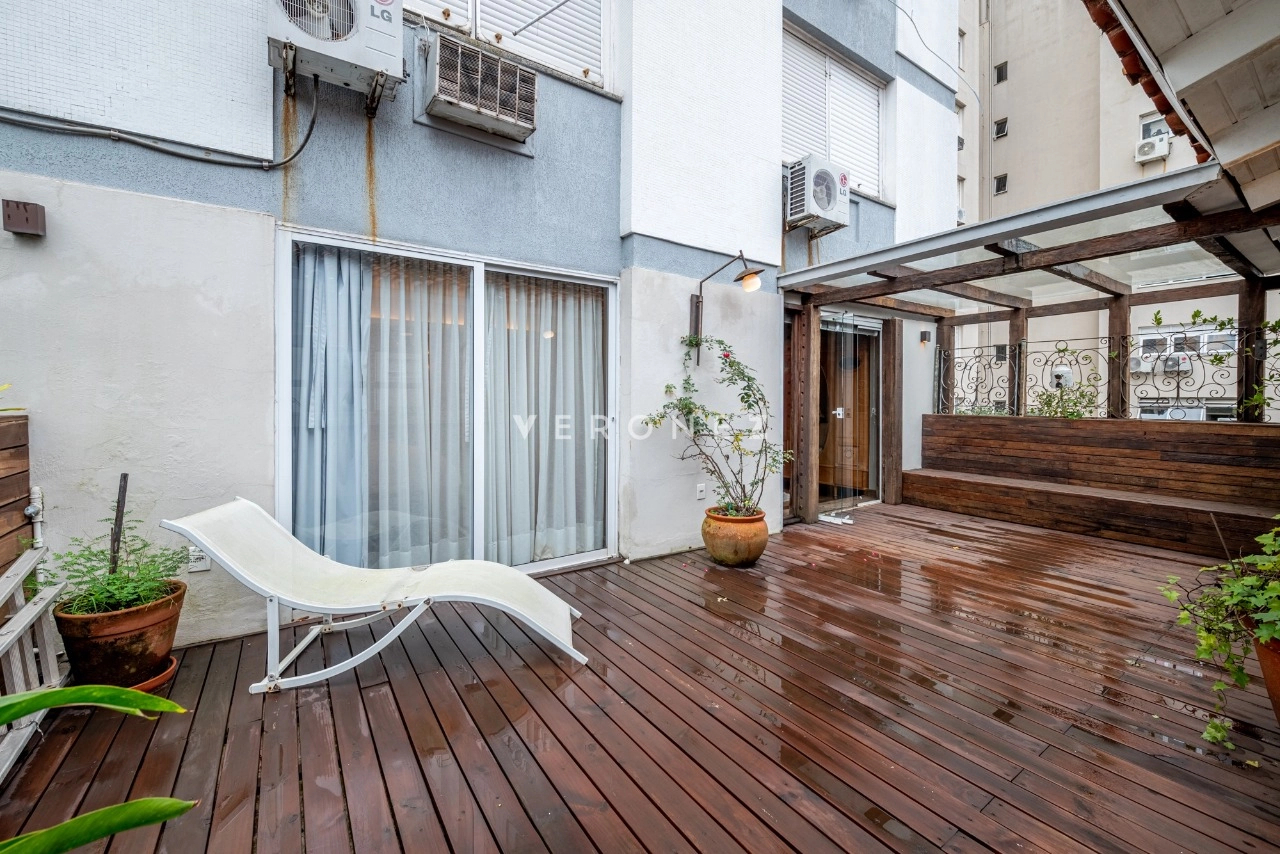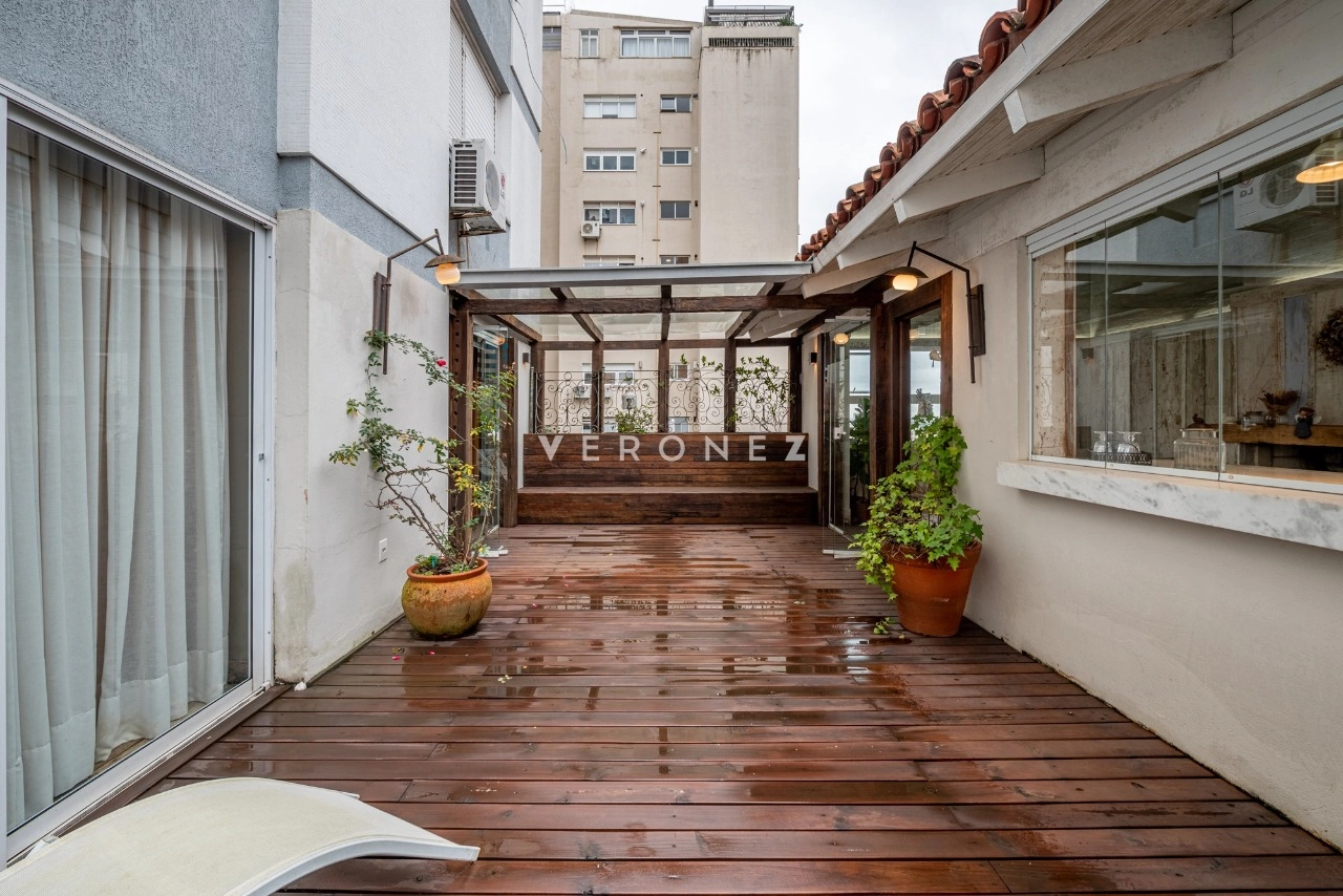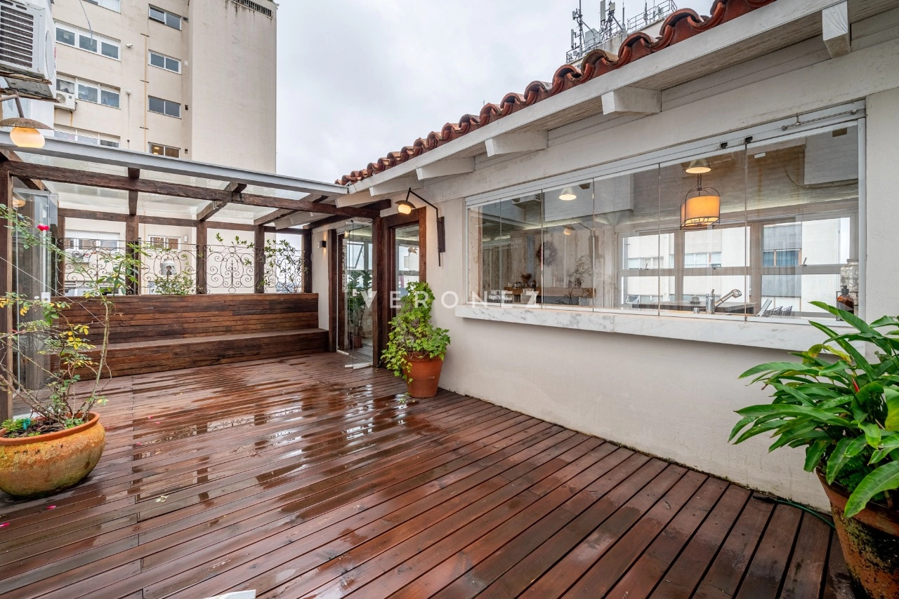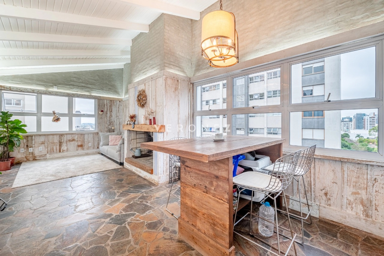 Apartamento garden reformada, de 145m² privativos com living para 2 ambientes, lavabo, cozinha integrada, área de serviço separada e amplo terraço com 2 ambientes, um externo e outro fechado com lareira e uma linda área gourmet com churrasqueira.