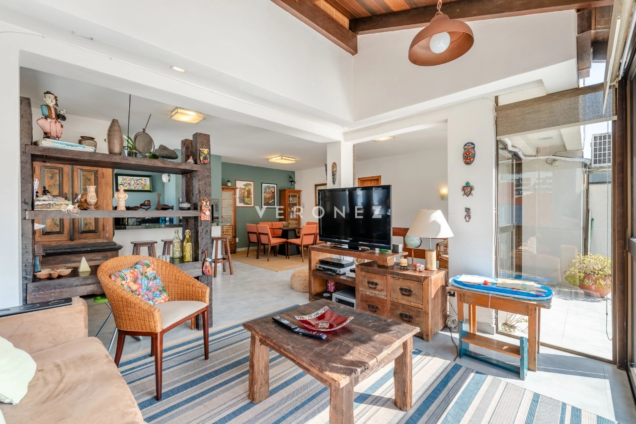 Na parte superior: amplo terraço, sala de estar e jantar, espaço gourmet com churrasqueira e banheiro completo.