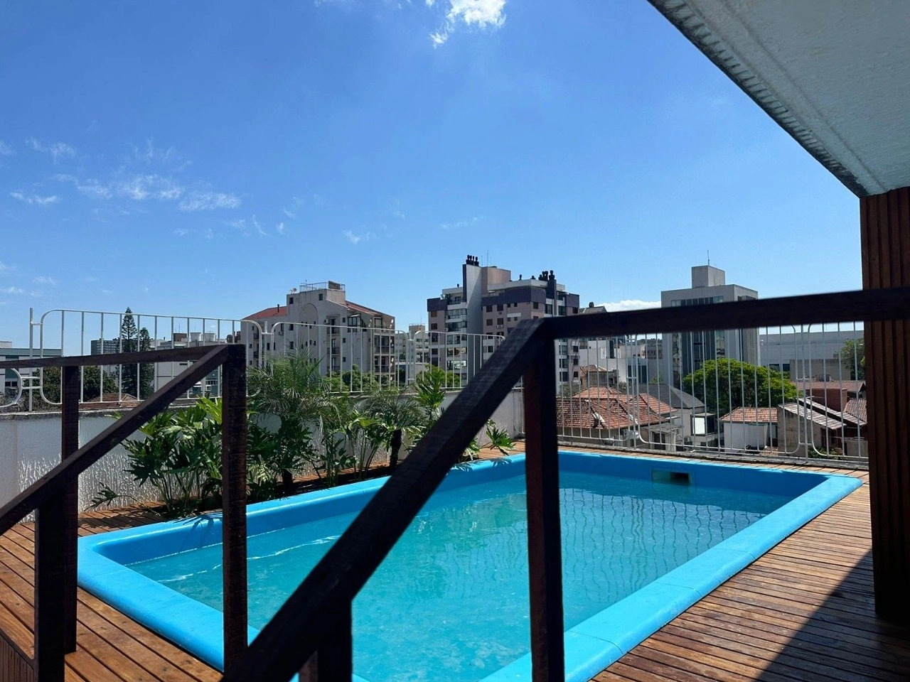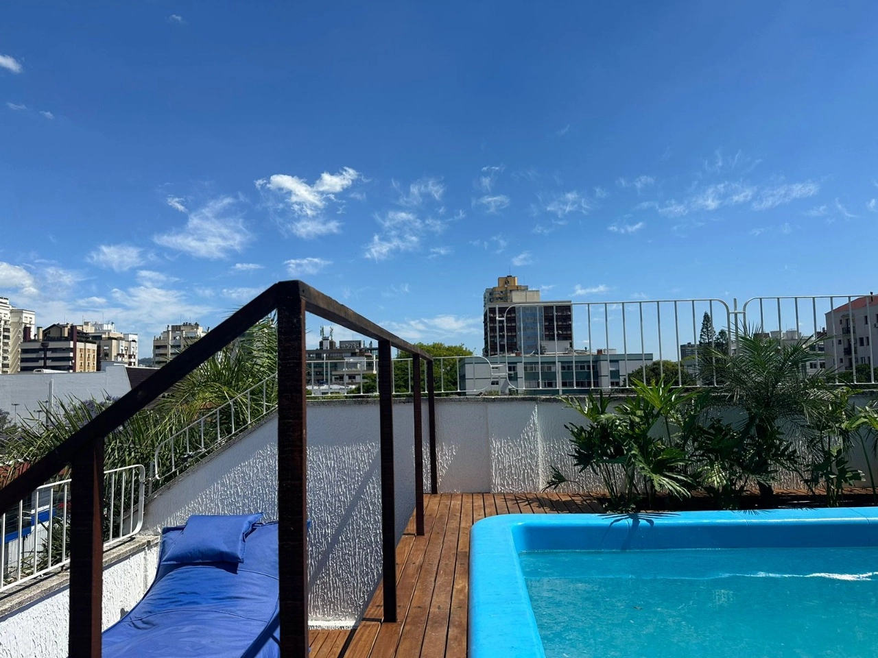 Linda Cobertura no coração do Menino Deus, moderna, 100% reformada por arquiteto, semimobiliada, bem arejada e ensolarada, no andar de baixo com 3 dormitórios sendo 2 suítes uma com hidromassagem, sala de estar intimo e cozinha completa. No segundo andar sala de estar com lareira , área gourmet com churrasqueira, Piscina com deck e um acesso para o terraço particular.