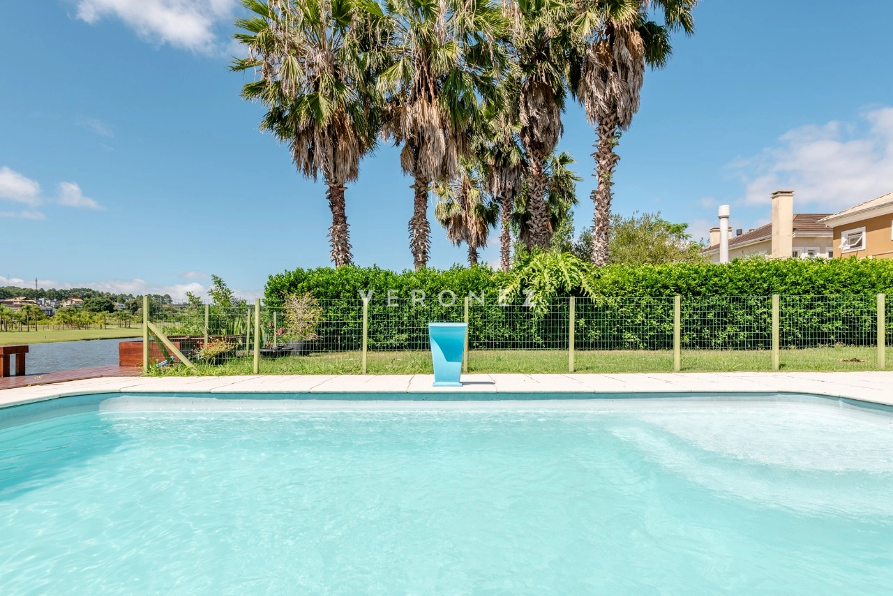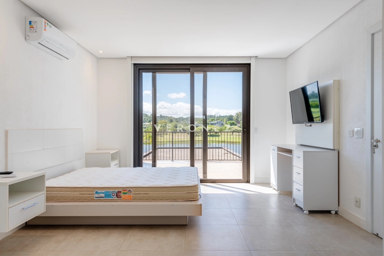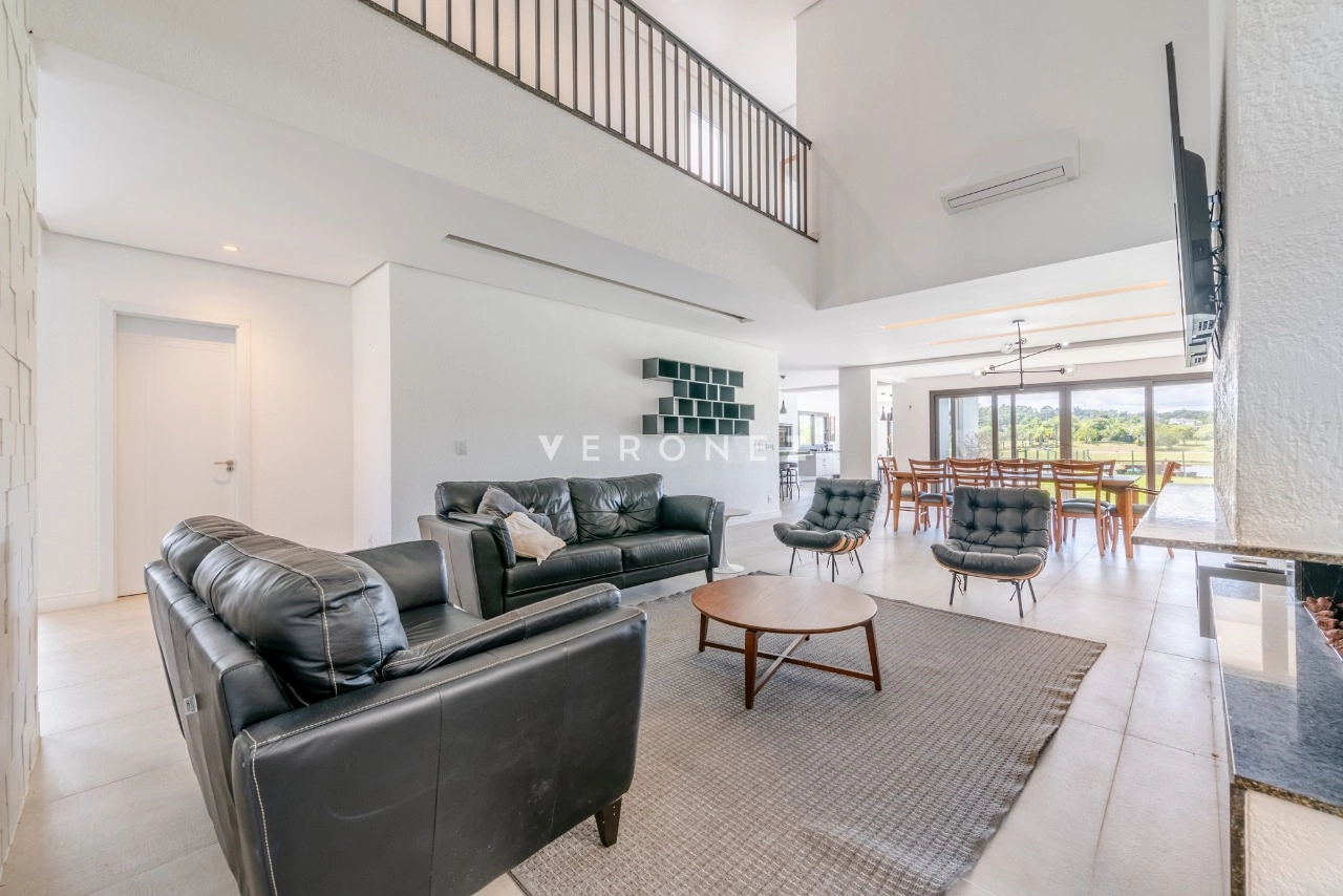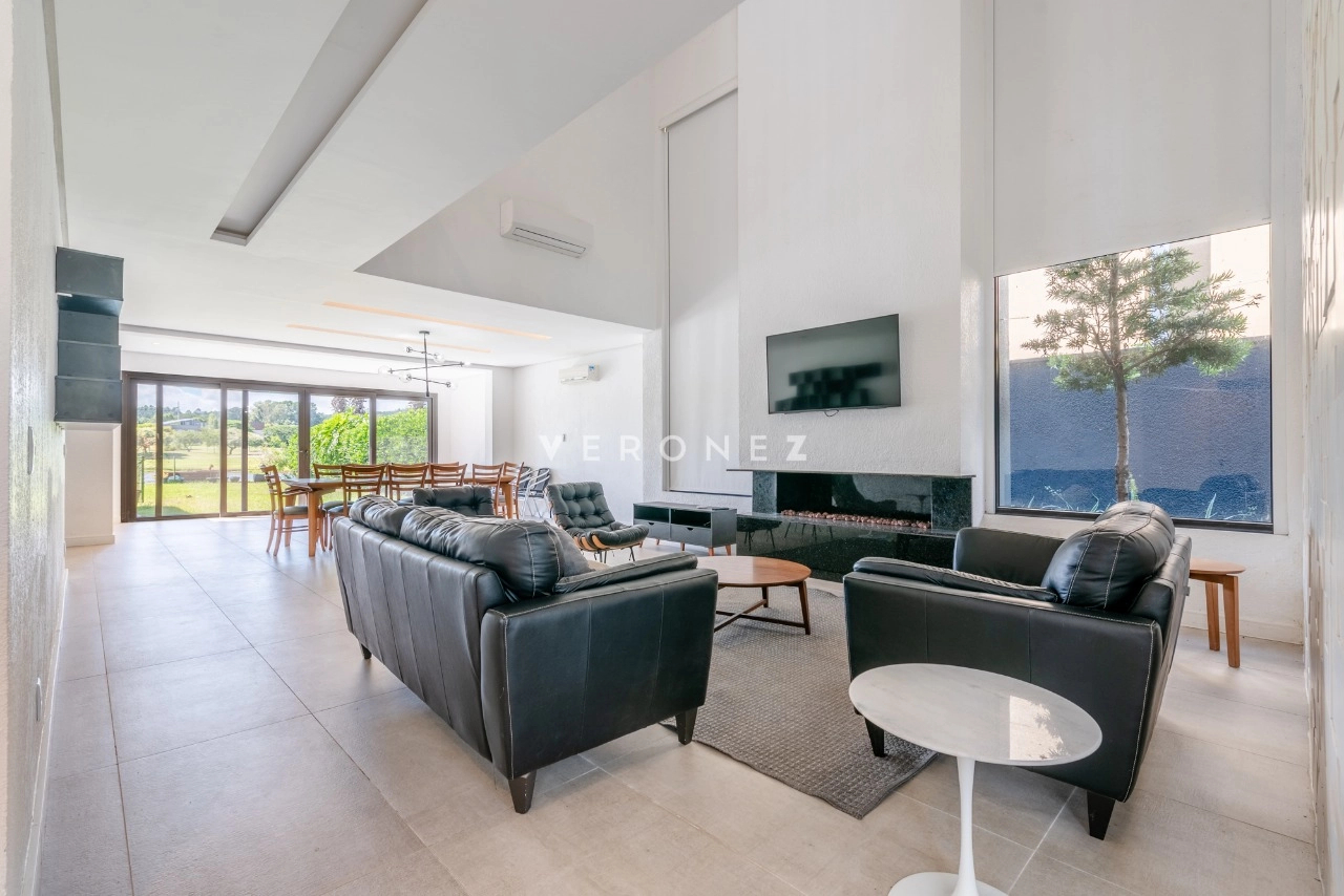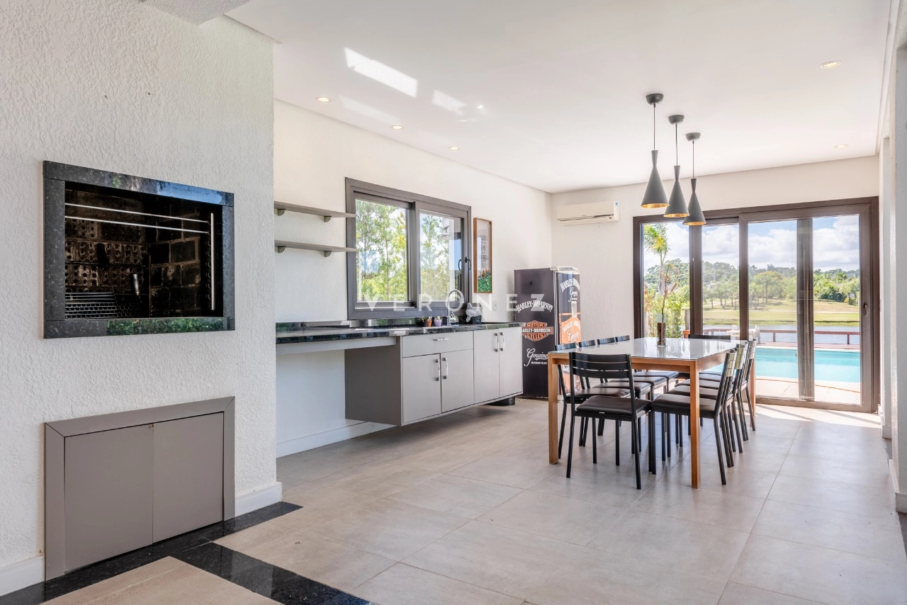Você pode contar também com hall de entrada, lavabo, amplo living com lareira e que integra a sala de estar à sala de jantar, cozinha em conceito aberto, espaço gourmet com churrasqueira, área de serviço/lavanderia independente, dependência de empregada completa (com banheiro), amplo jardim com piscina e uma linda vista para o lago e campo de golfe, além de 4 vagas de garagem (duas cobertas).