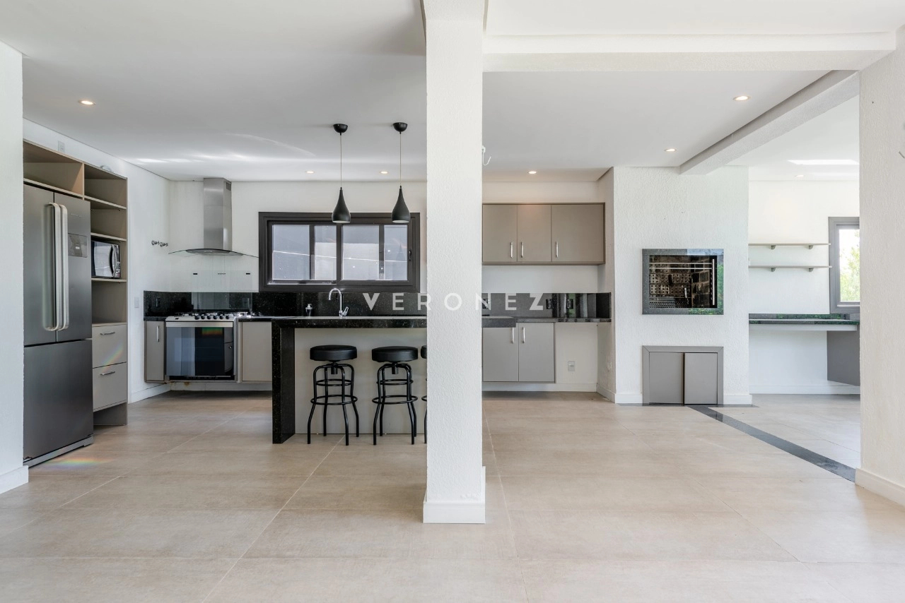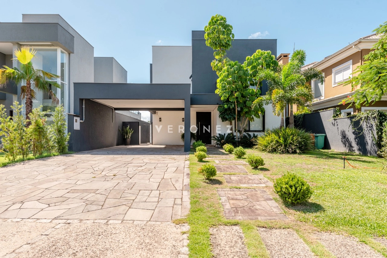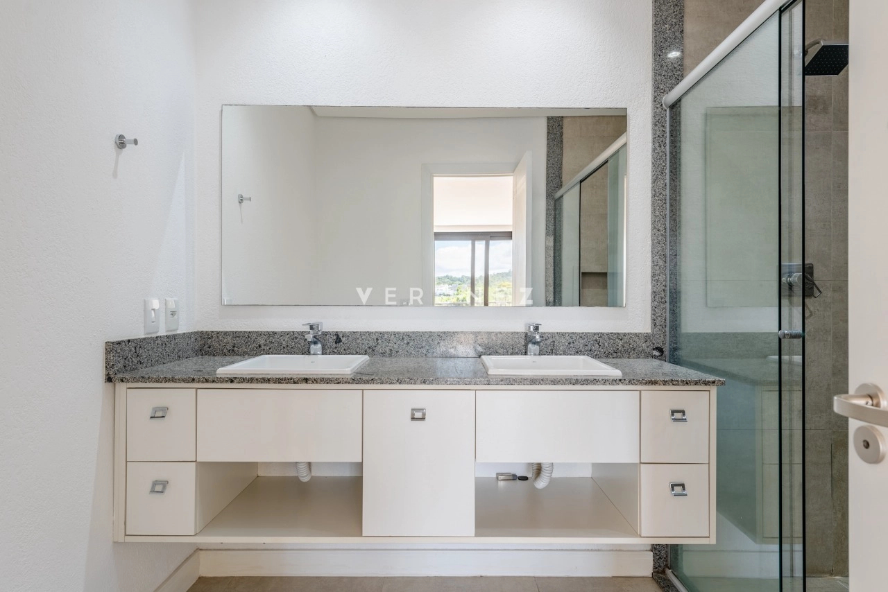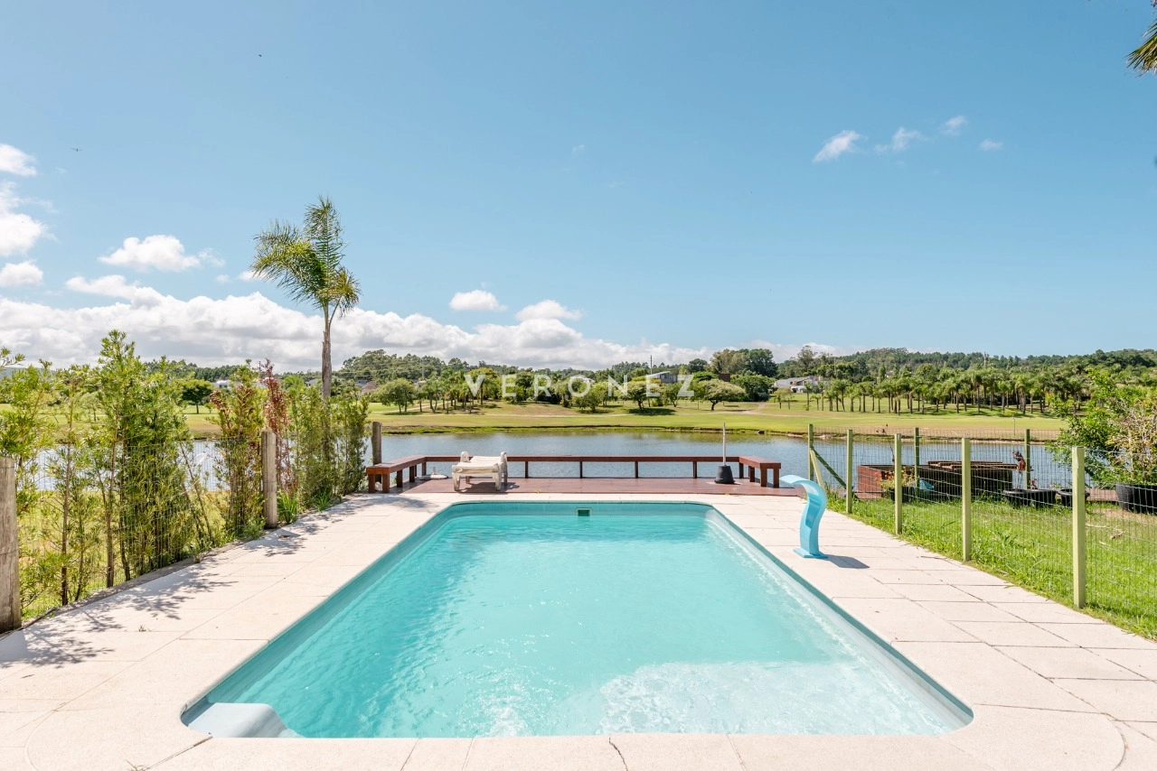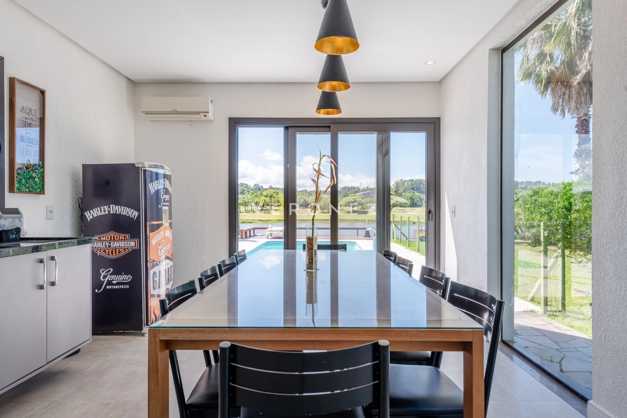 Você pode contar também com hall de entrada, lavabo, amplo living com lareira e que integra a sala de estar à sala de jantar, cozinha em conceito aberto, espaço gourmet com churrasqueira, área de serviço/lavanderia independente, dependência de empregada completa (com banheiro), amplo jardim com piscina e uma linda vista para o lago e campo de golfe, além de 4 vagas de garagem (duas cobertas).
