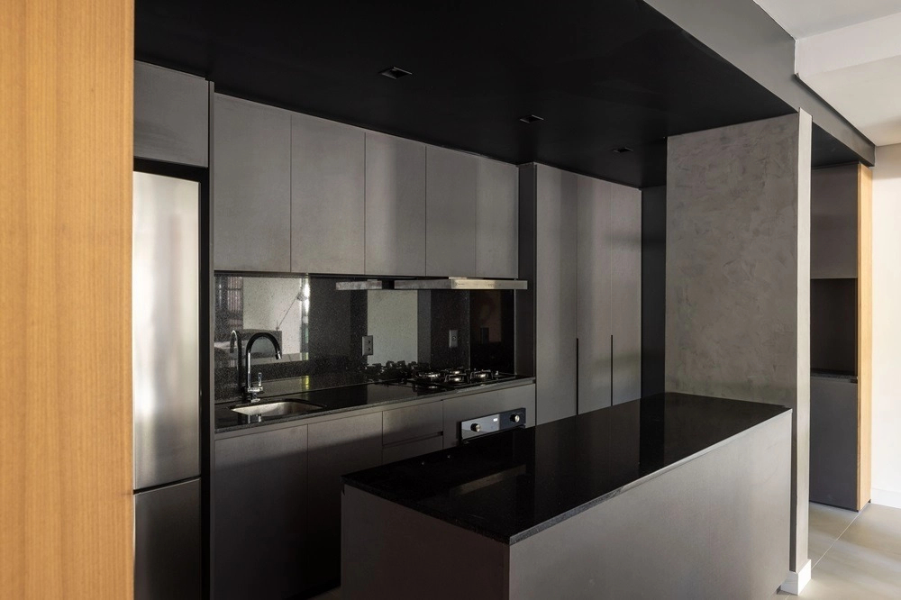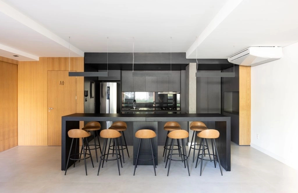 Amplo e super bem arejado com esquadrias grandes, cozinha integrada com churrasqueira e banheiro com ventilação mecânica.