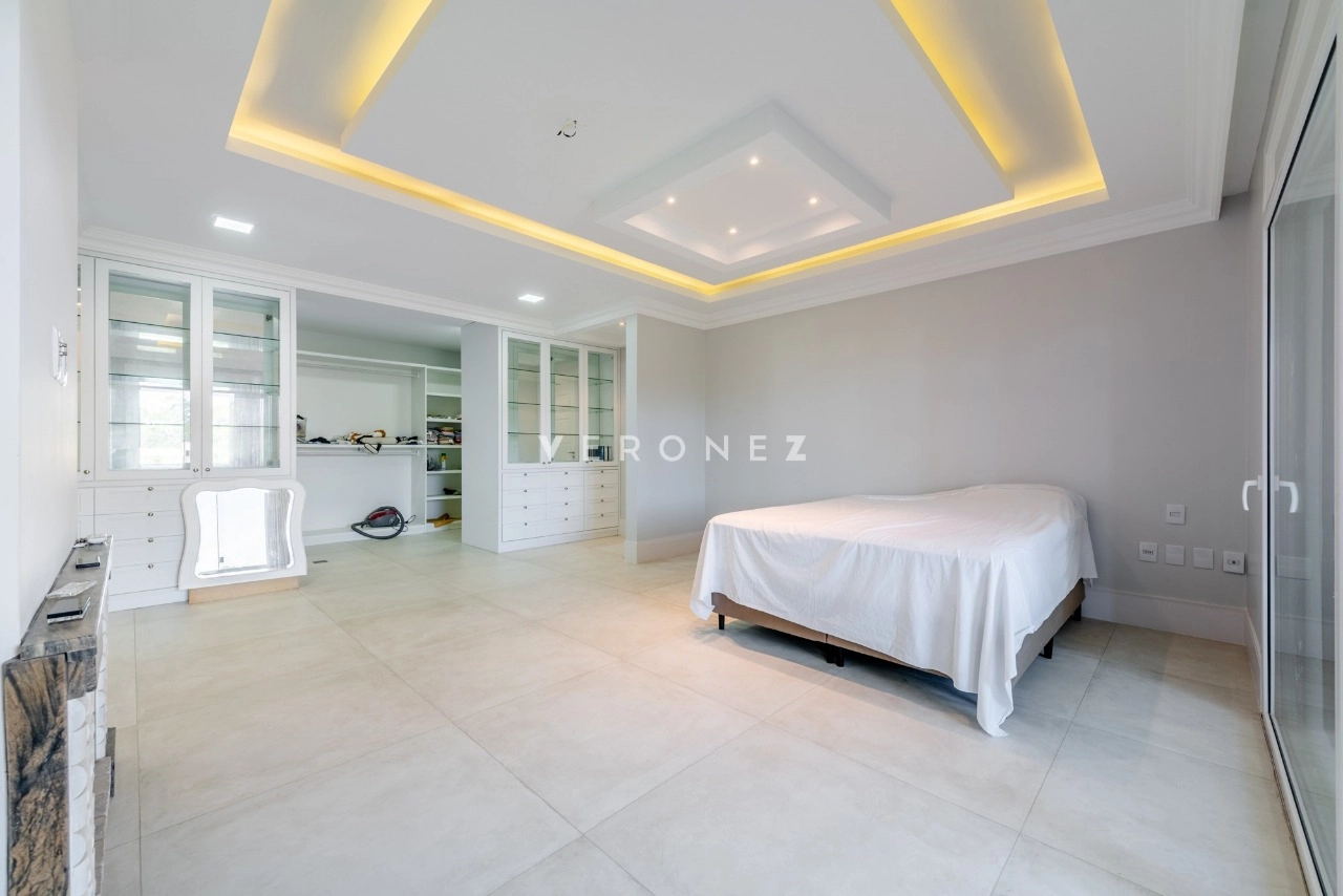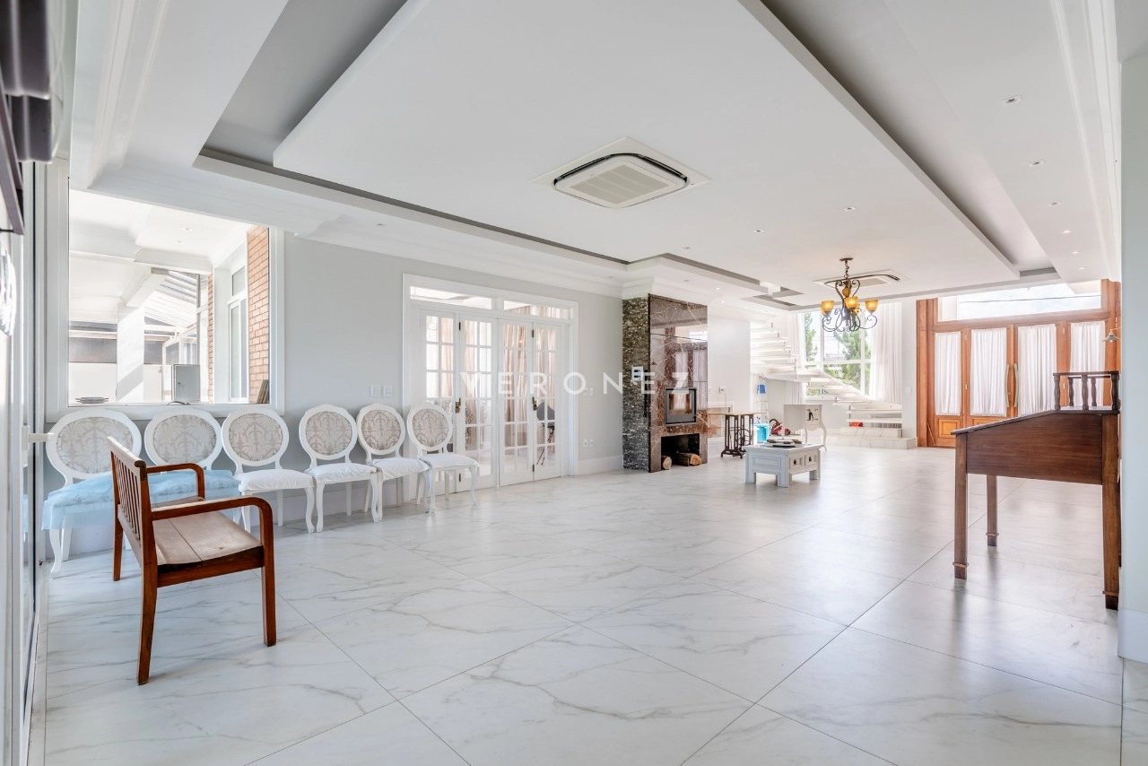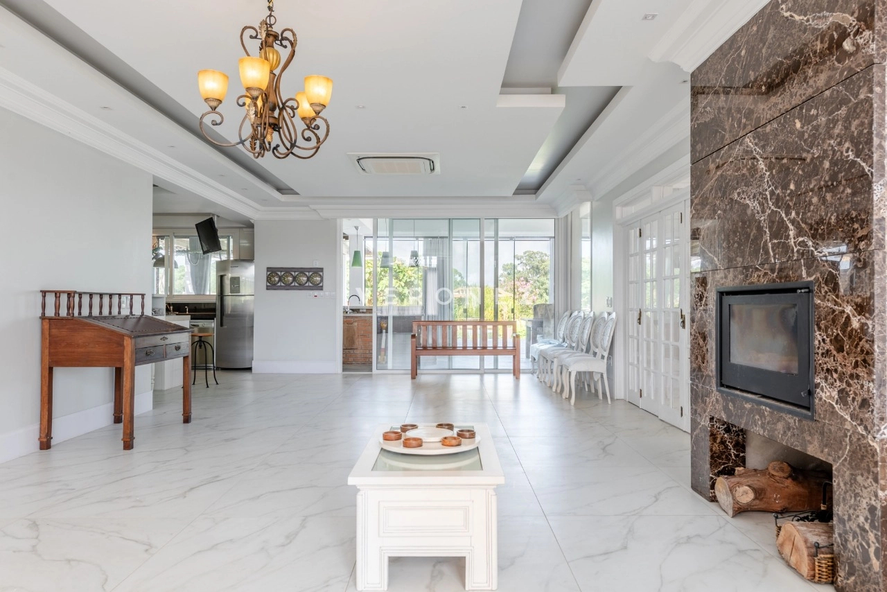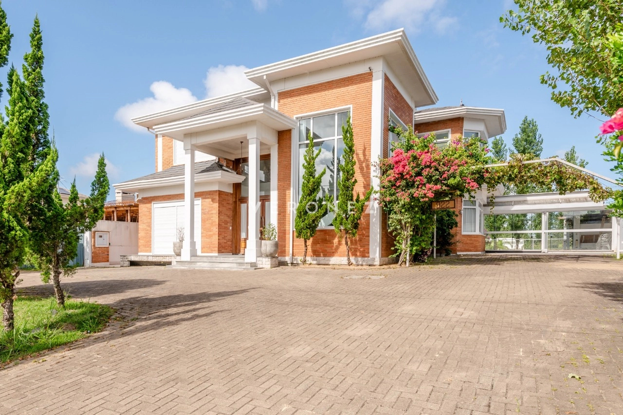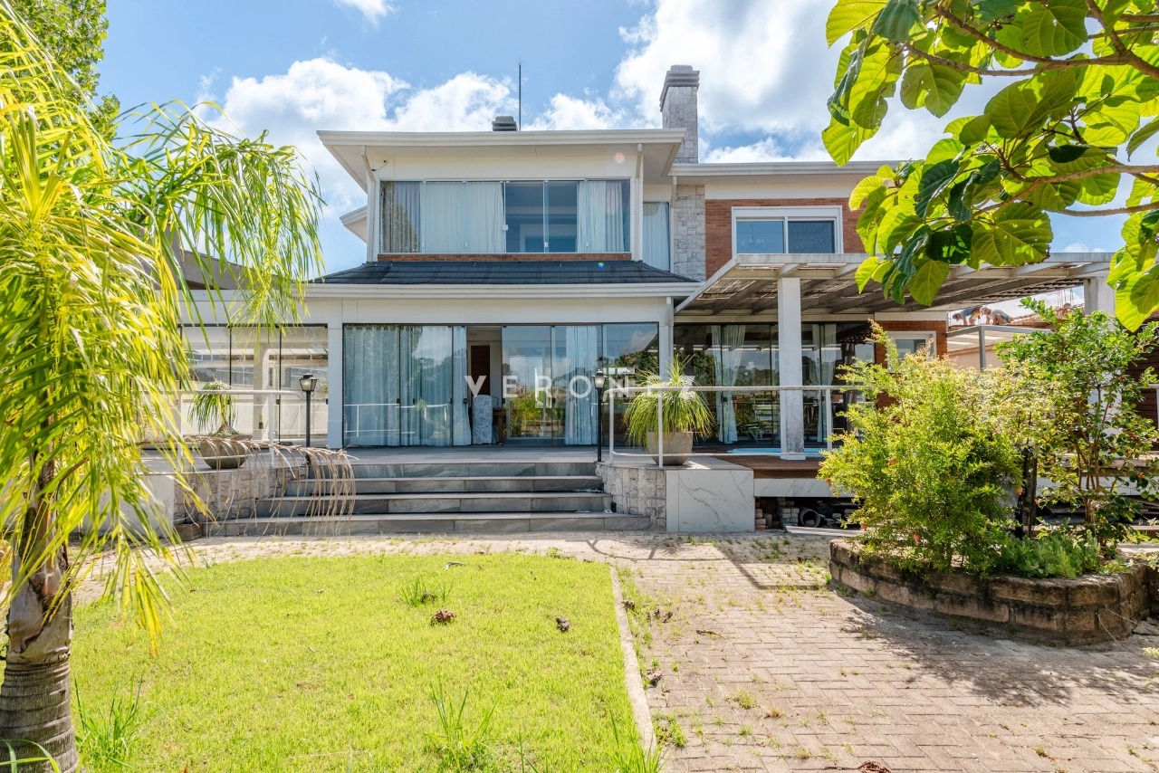Hall de entrada com pé direito duplo, gabinete com banheiro, living com 3 ambientes e piso em porcelanato. A residência conta com lareira e aquecimento por água circulante em todos os ambientes, proporcionando conforto térmico. O estar íntimo é reservado e separado do living principal. A copa-cozinha é integrada, finamente semi-mobiliada, com móveis fixos e eletros de altíssima qualidade. A área social inclui churrasqueira rotativa, forno de pizza, fogão à querosene, e acesso direto à piscina aquecida e ao jardim com irrigação automatizada, abastecido diretamente pelo lago. O imóvel ainda conta com depósito e dependência completa de funcionários.
