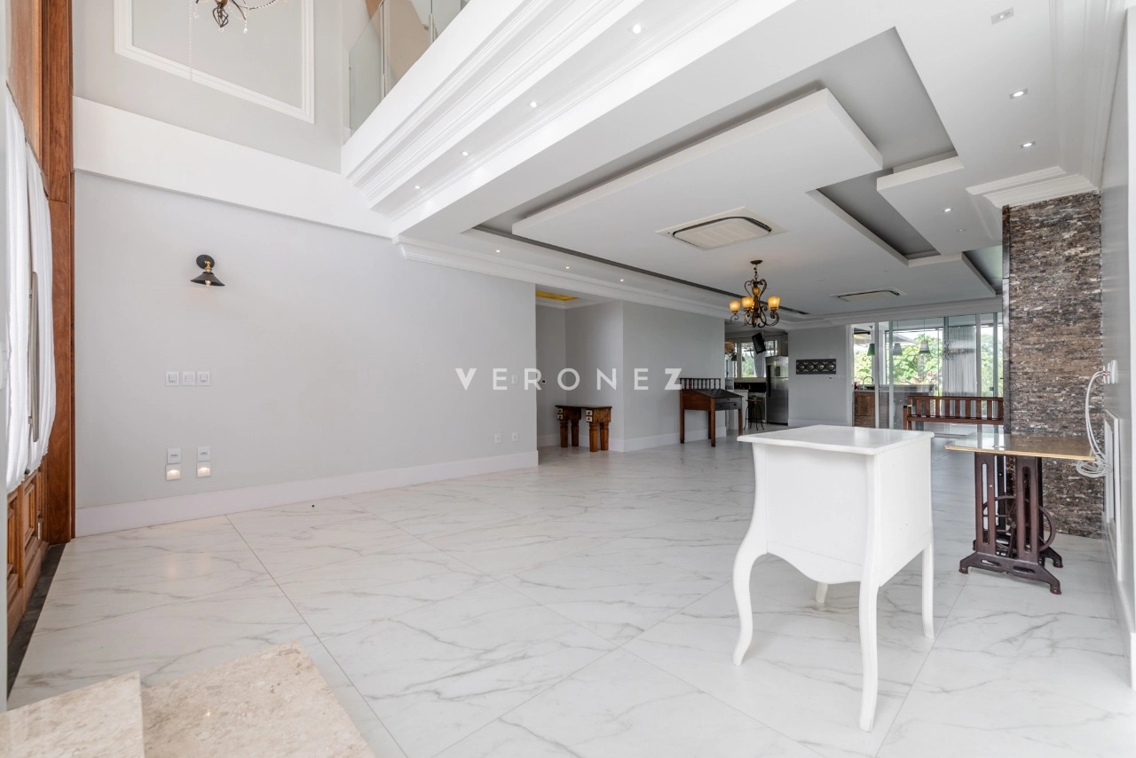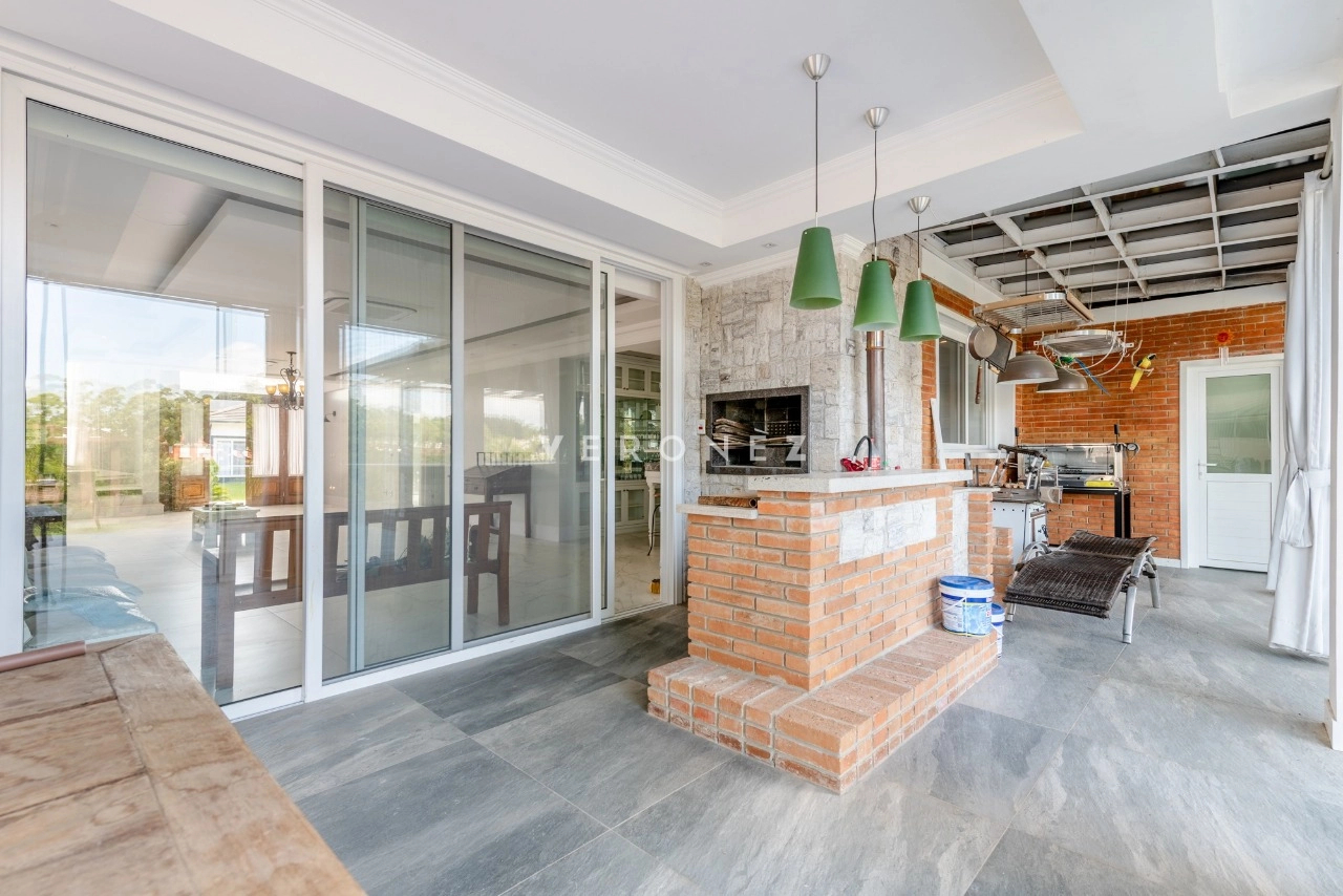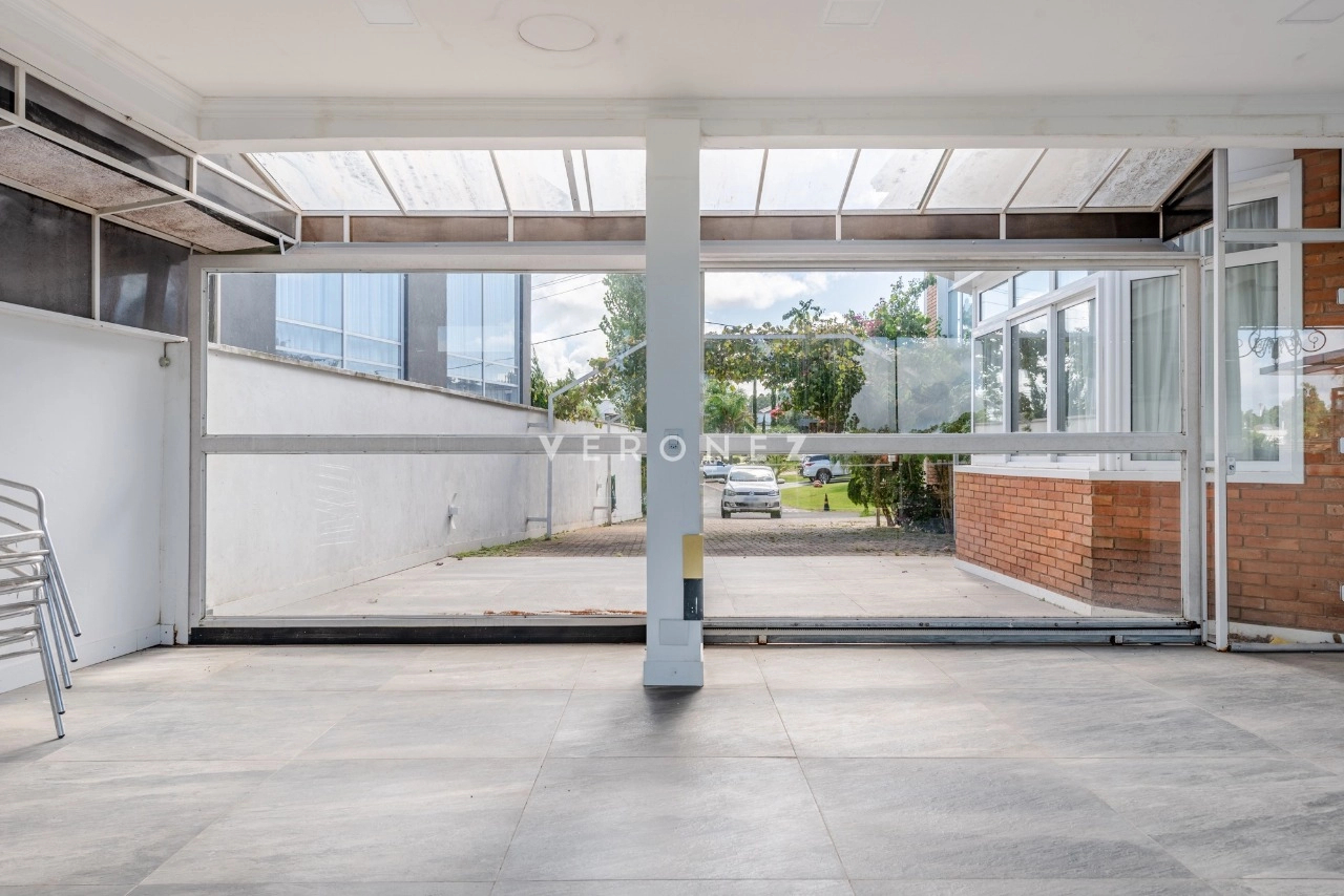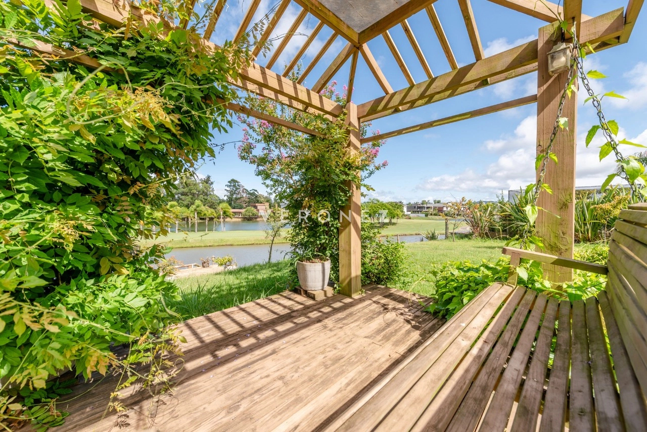 Hall de entrada com pé direito duplo, gabinete com banheiro, living com 3 ambientes e piso em porcelanato. A residência conta com lareira e aquecimento por água circulante em todos os ambientes, proporcionando conforto térmico. O estar íntimo é reservado e separado do living principal. A copa-cozinha é integrada, finamente semi-mobiliada, com móveis fixos e eletros de altíssima qualidade. A área social inclui churrasqueira rotativa, forno de pizza, fogão à querosene, e acesso direto à piscina aquecida e ao jardim com irrigação automatizada, abastecido diretamente pelo lago. O imóvel ainda conta com depósito e dependência completa de funcionários.