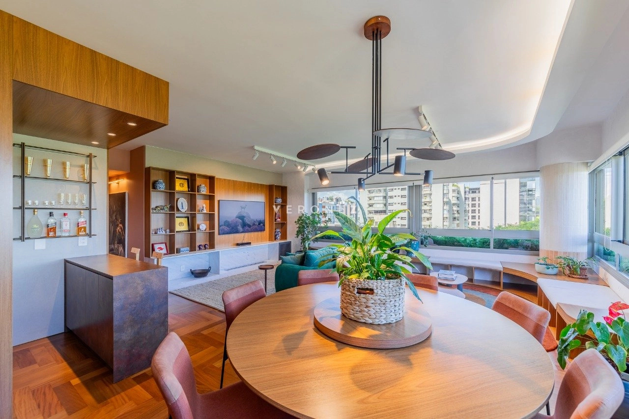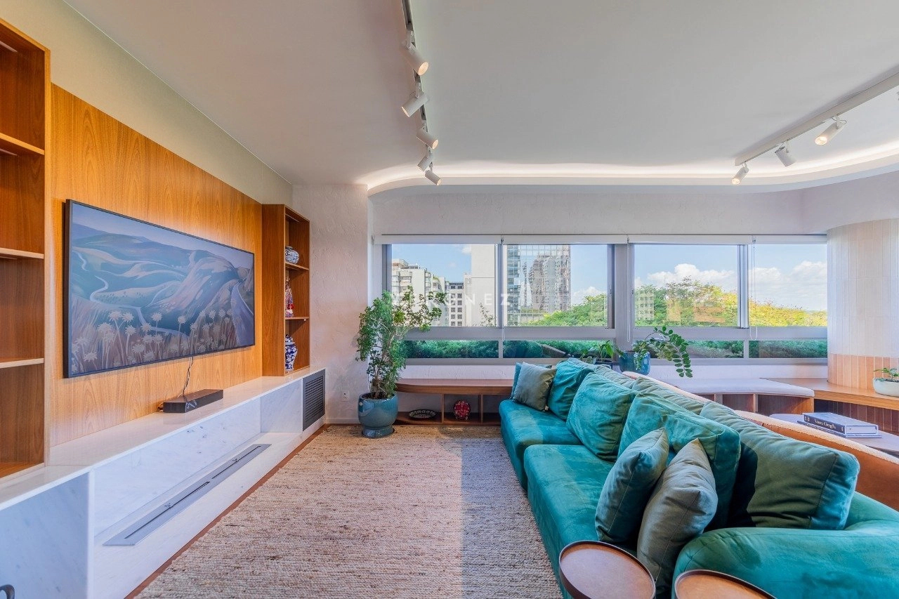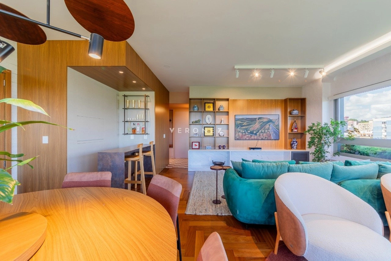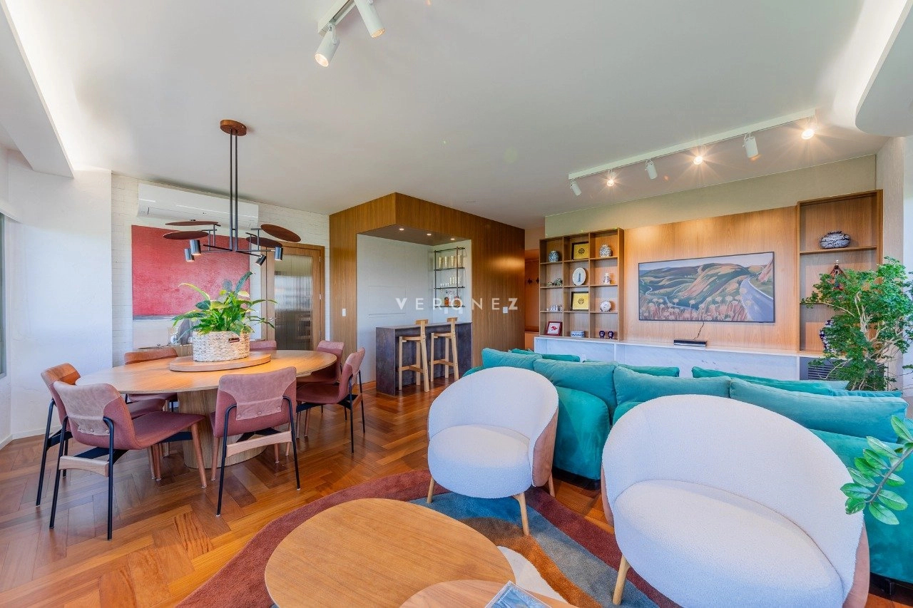 Apartamento mobiliado de 164 m², 3 dormitórios, sendo 3 suítes, living para 3 ambientes com espaço churrasco, lavabo, copa-cozinha com entrada auxiliar e área de serviço separada.