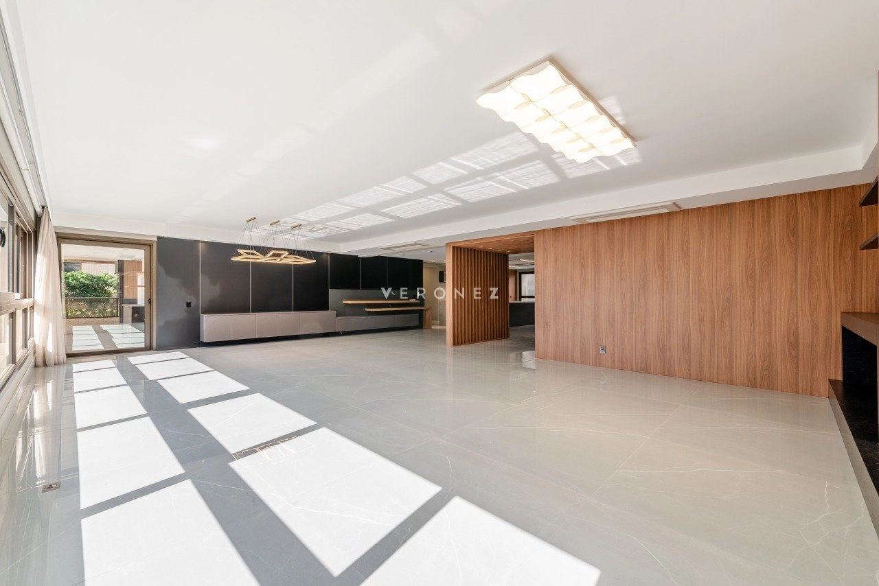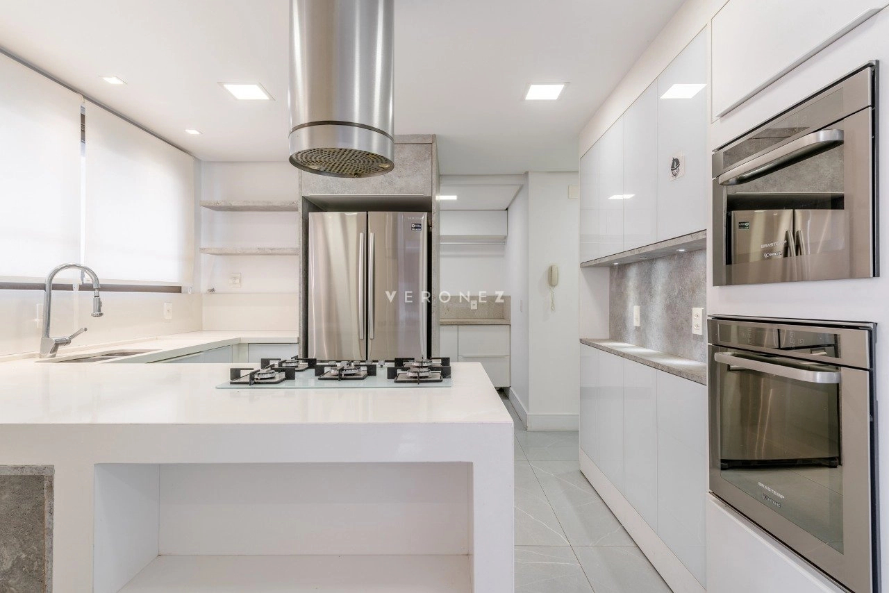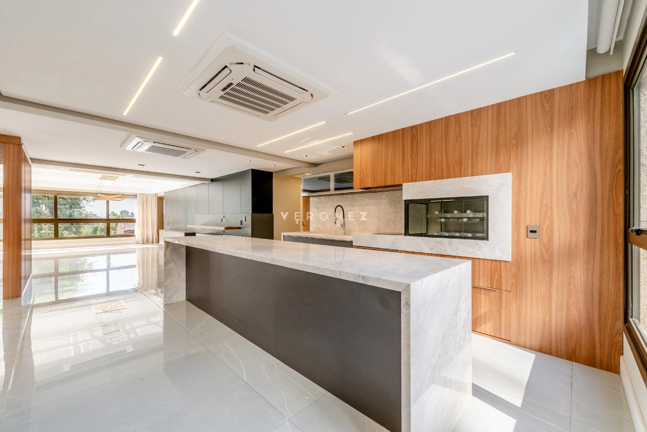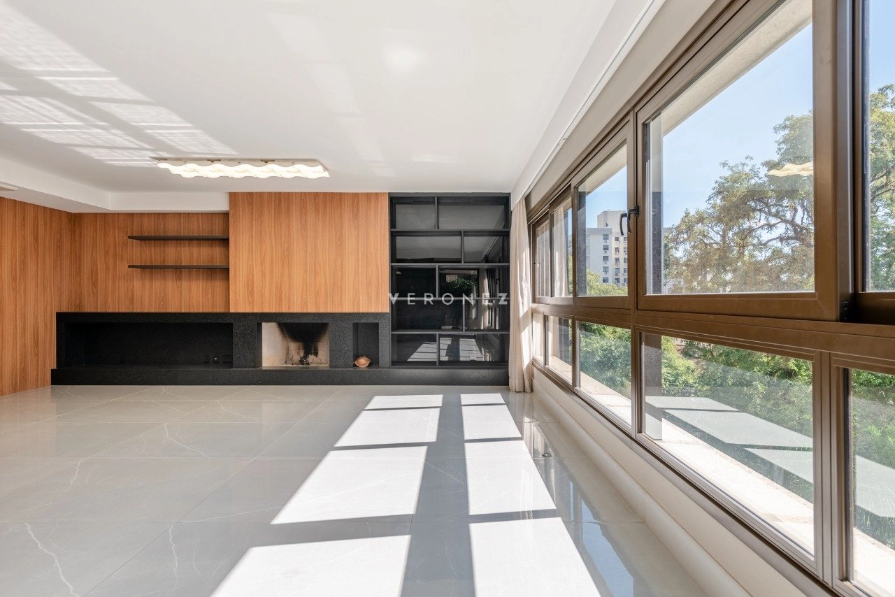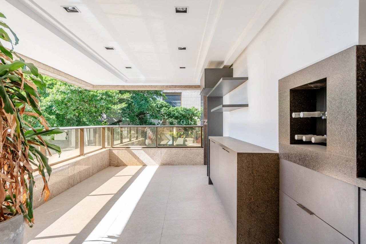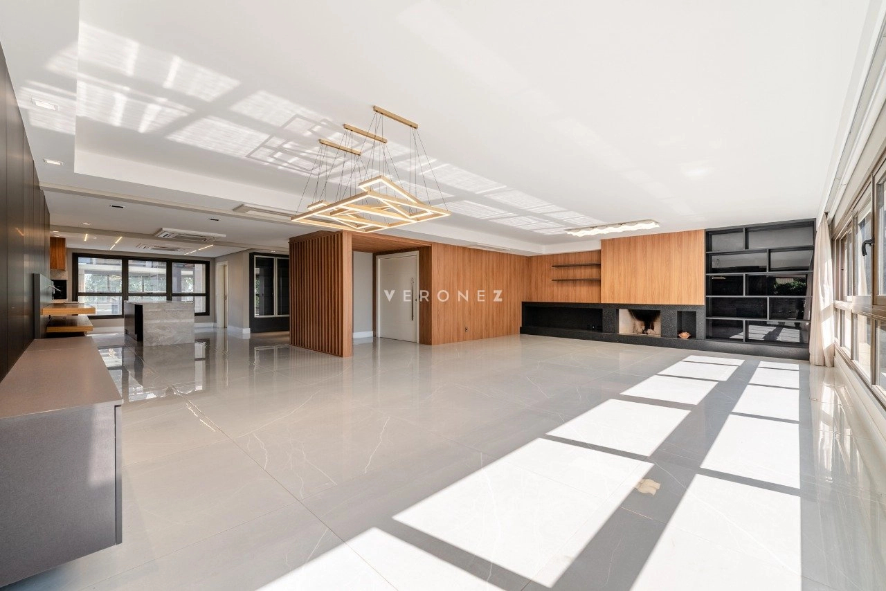 Apartamento semi mobiliado de 290 m², 3 suítes, sendo 1 master com closet, hall privativo, living para 3 ambientes com lavabo, lareira, espaço gourmet, sacada com churrasqueira, copa-cozinha, área de serviço com entrada independente, dependencia completa, 4 vagas de garagem e 2 depósitos.