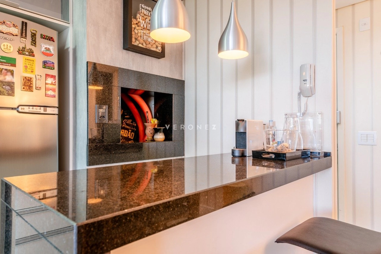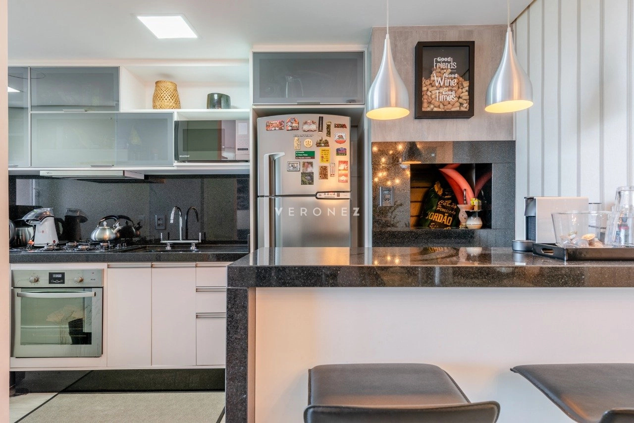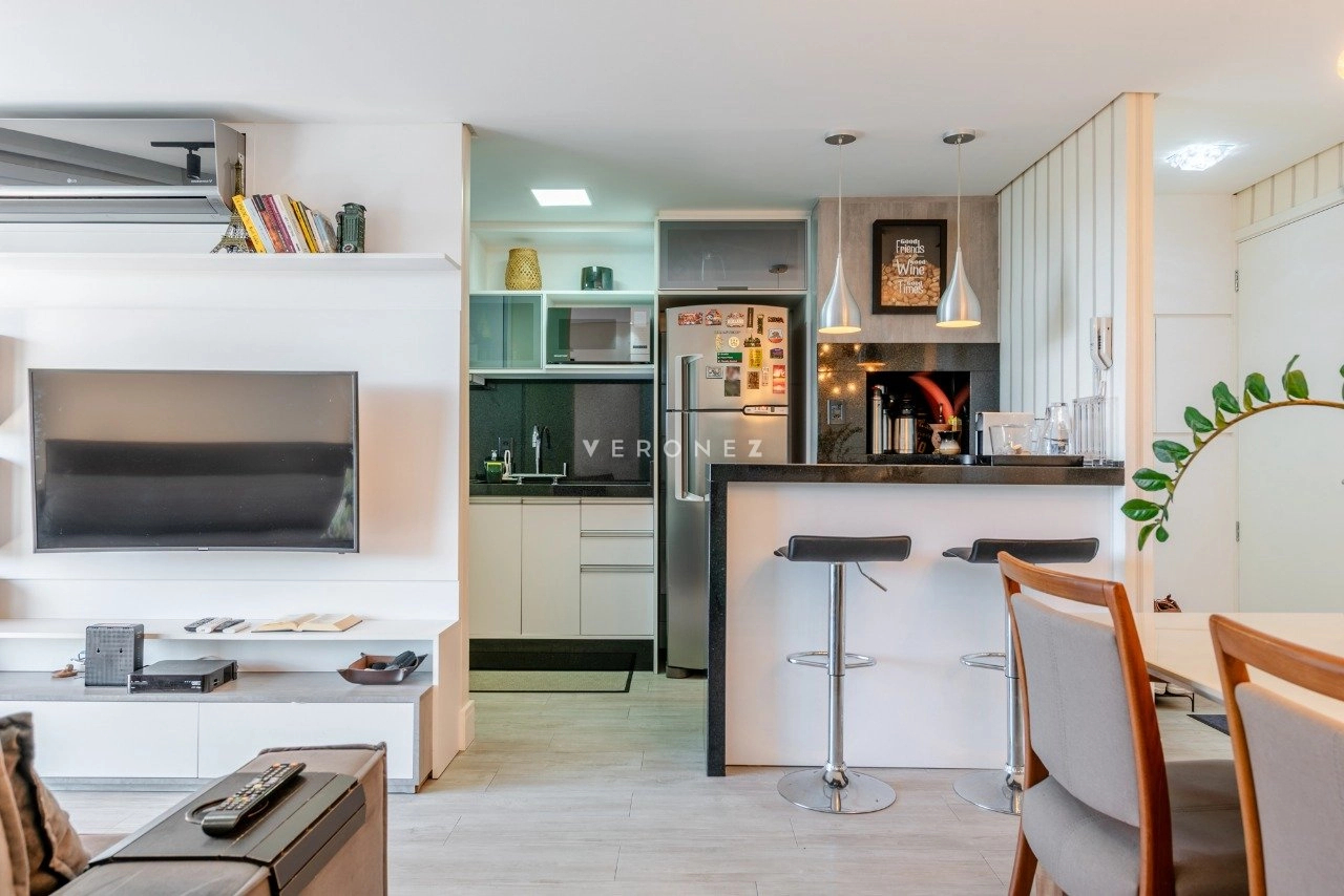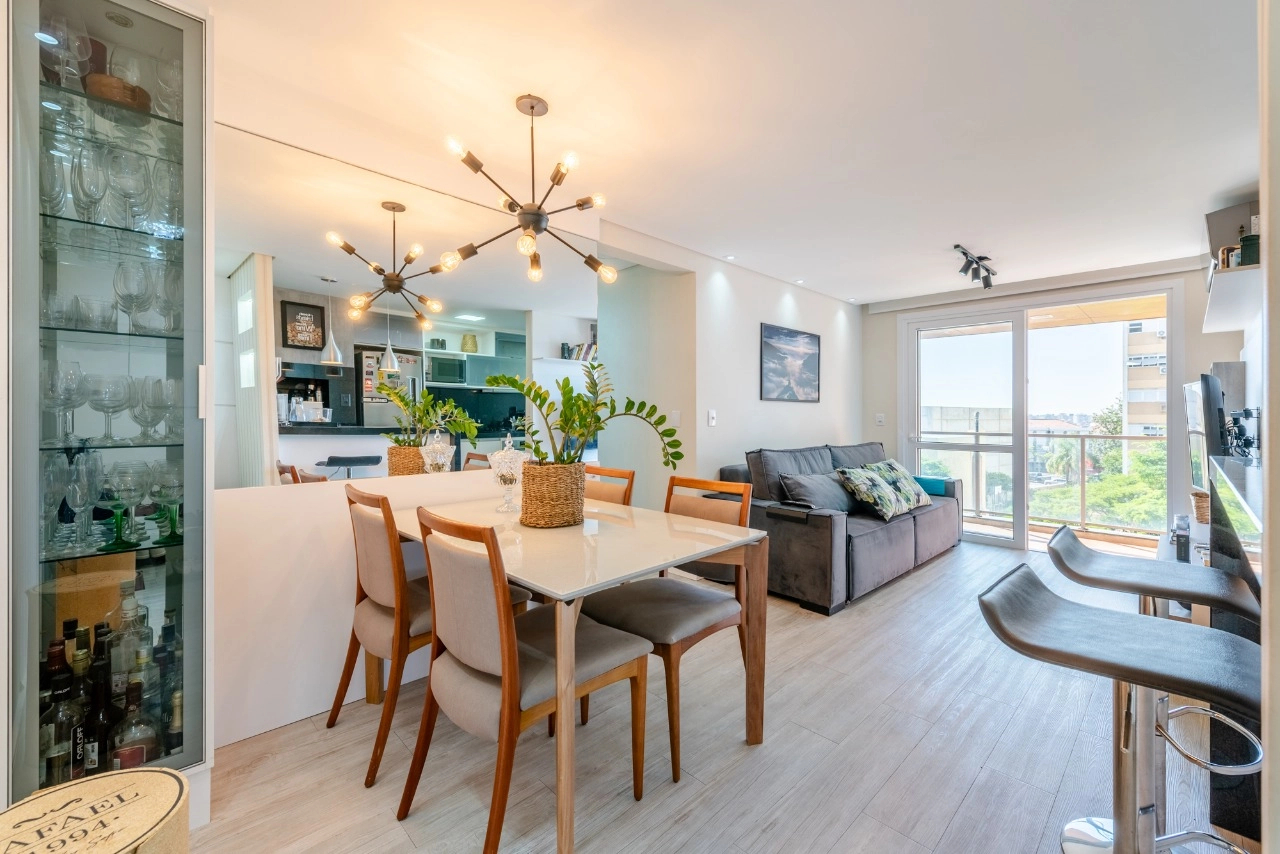 Apartamento de 76 m² de área privativa, mobiliado, 2 dormitórios (1 suite), living para 2 ambientes com sacada, banheiro social, cozinha integrada com churrasqueira e 2 vagas de garagem.