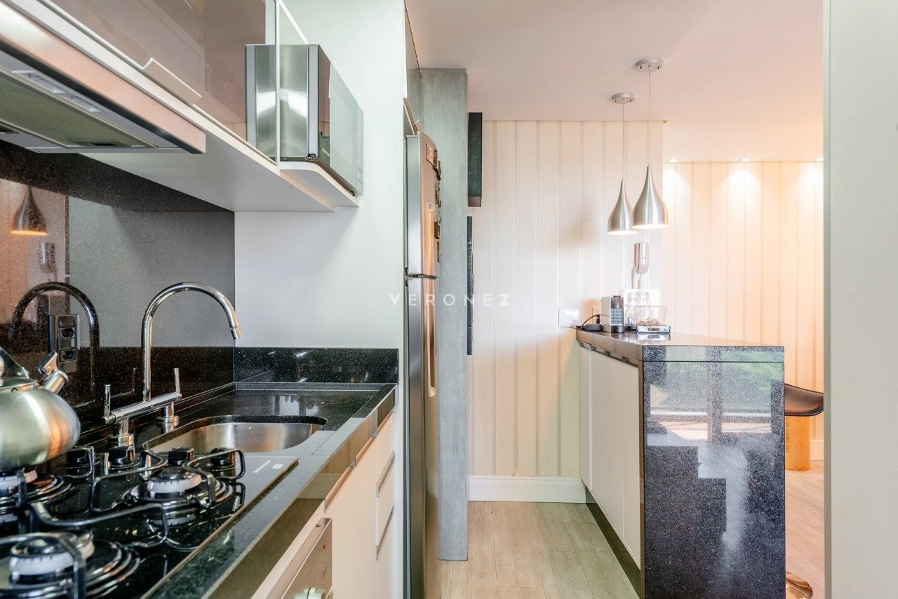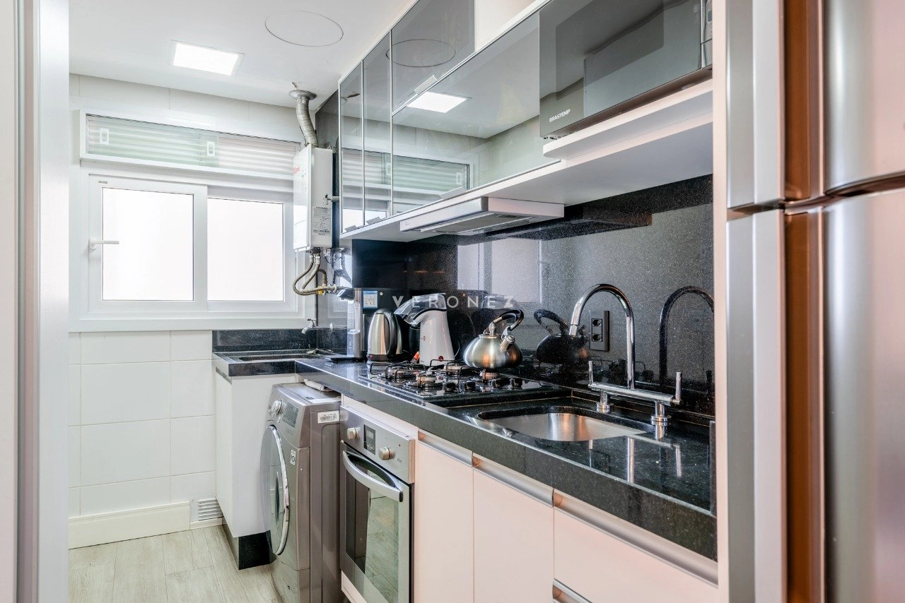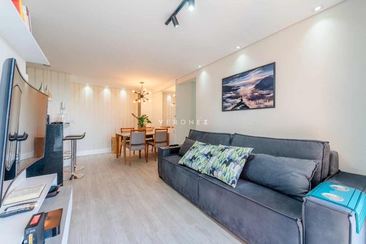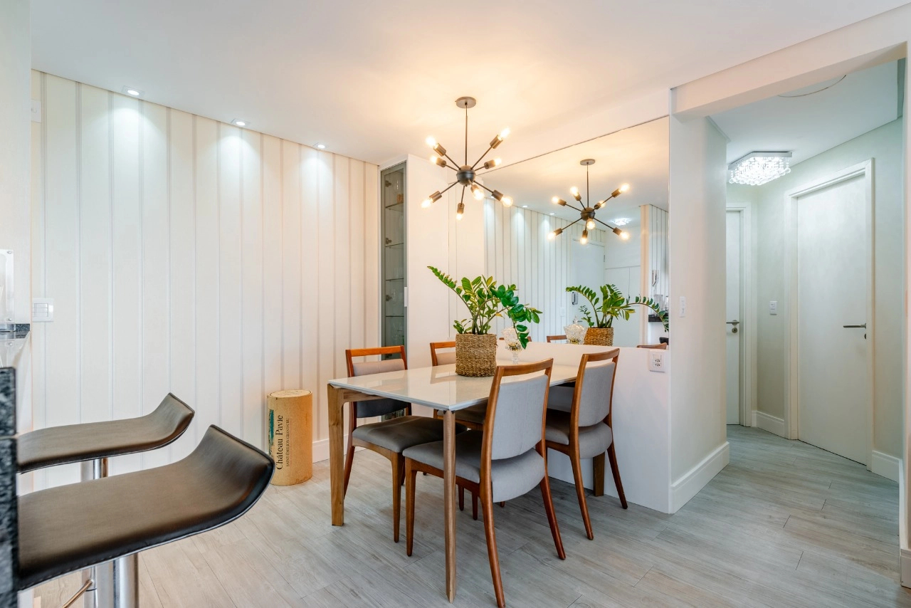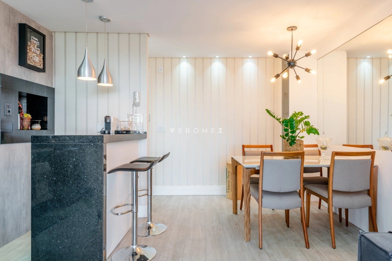Apartamento de 76 m² de área privativa, mobiliado, 2 dormitórios (1 suite), living para 2 ambientes com sacada, banheiro social, cozinha integrada com churrasqueira e 2 vagas de garagem.