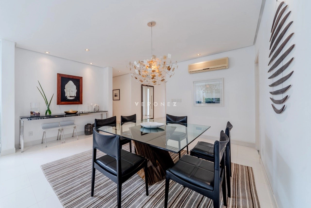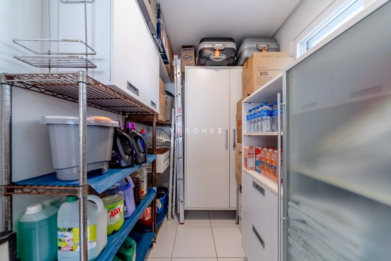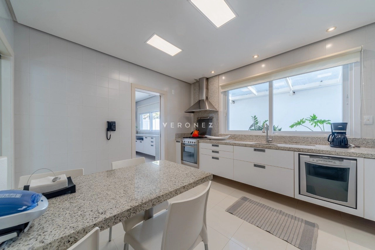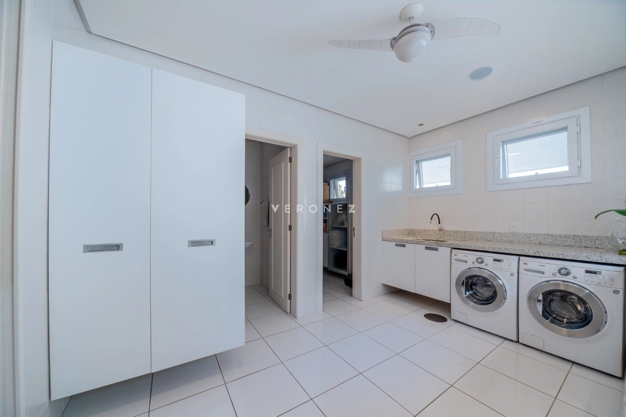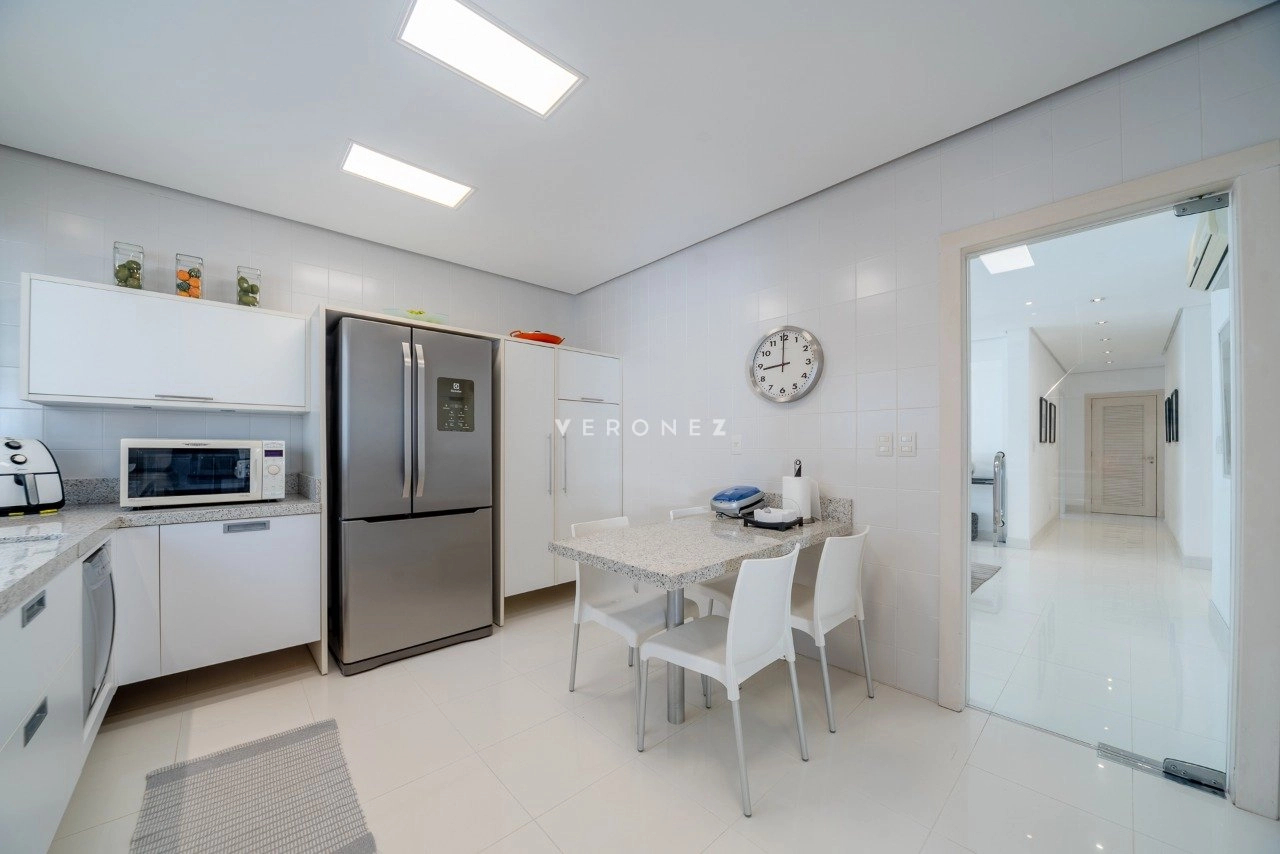 Cozinha e uma ampla área de serviço separadas, com entrada independente, dependência de serviço completa, vagas para 4 carros. Ficam móveis fixos.