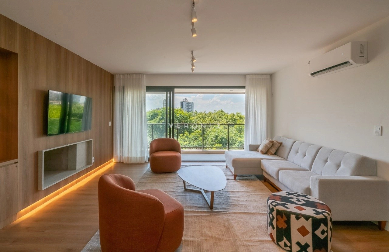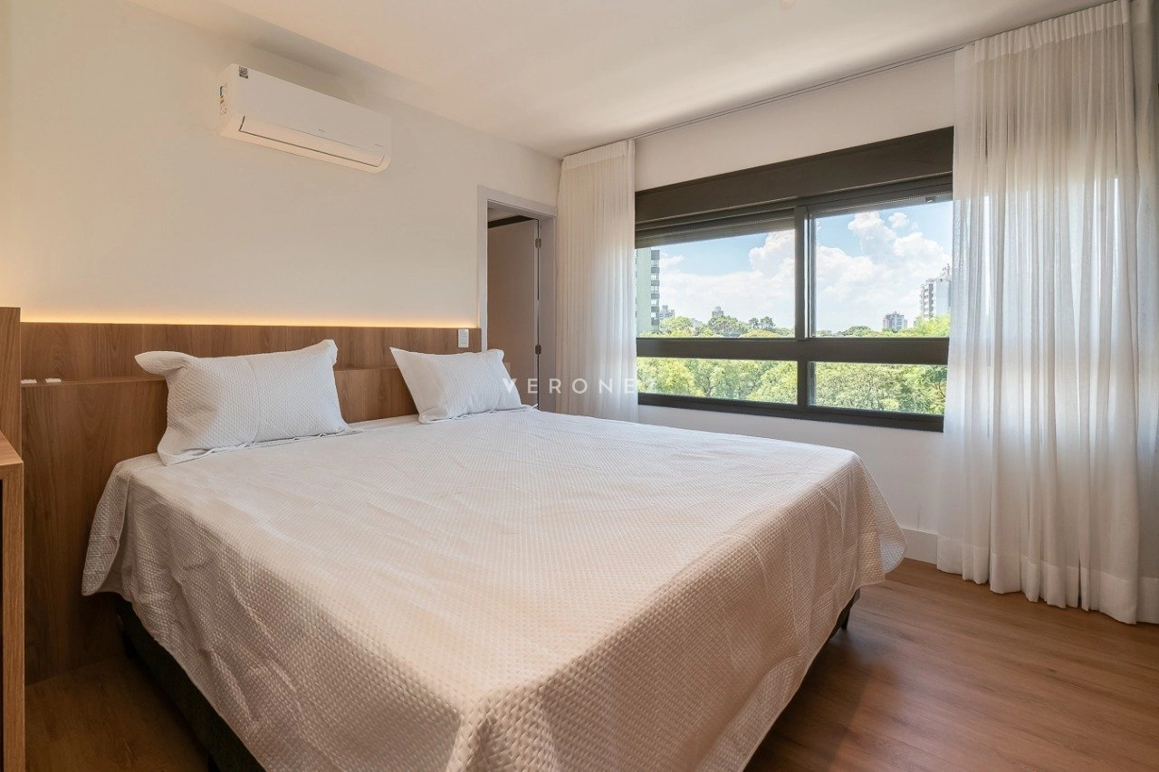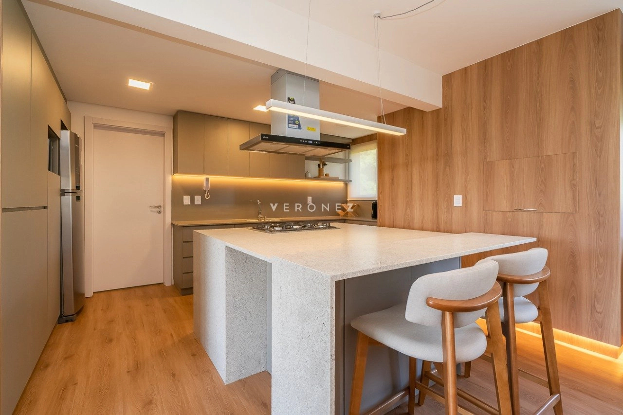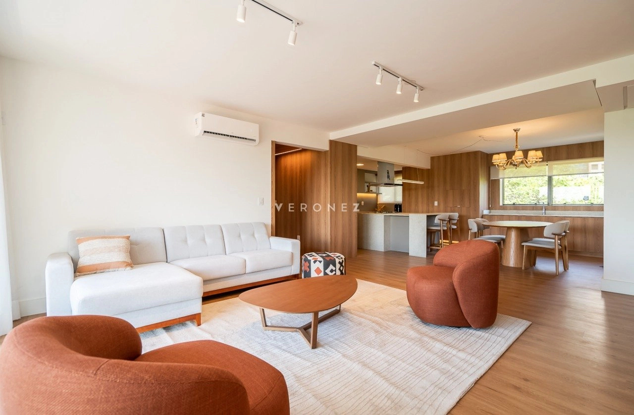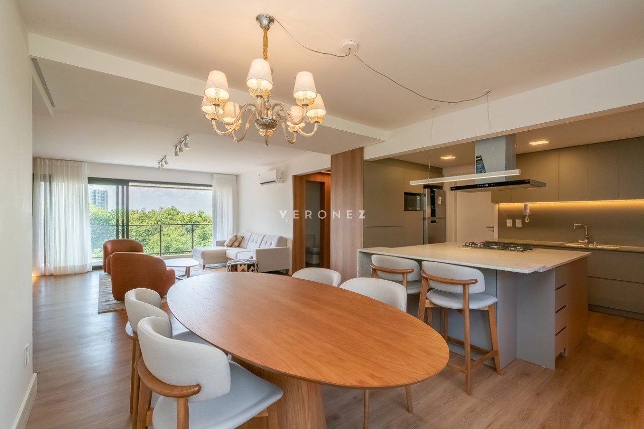 Apartamento mobiliado e decorado, de 154m², 3 dormitórios sendo 3 suítes, living 2 ambientes com lareira, lavabo e sacada, espaço gourmet com churrasqueira, cozinha equipada, área de serviço com entrada independente, banheiro de empregada e 2 vagas de garagem.