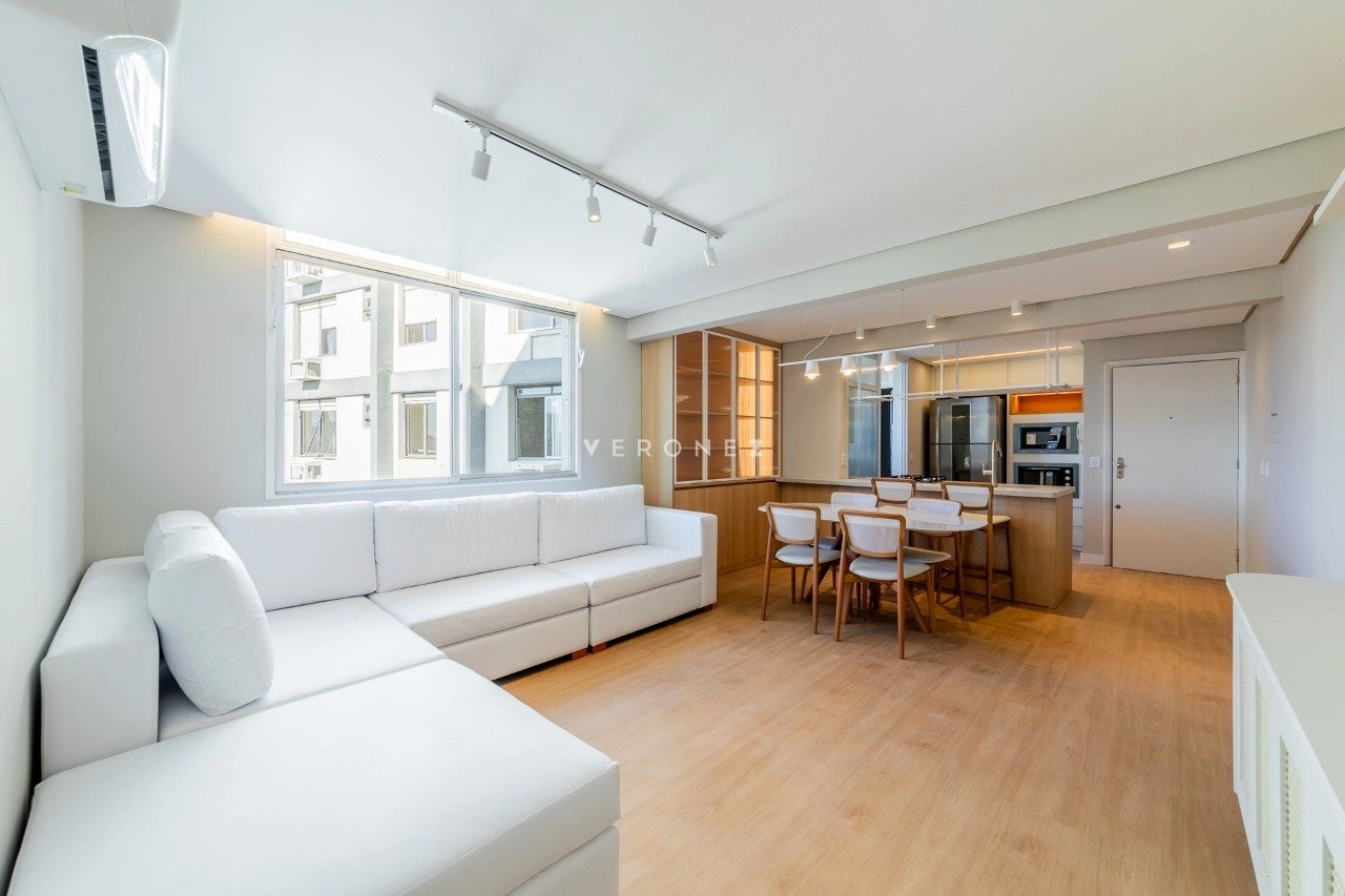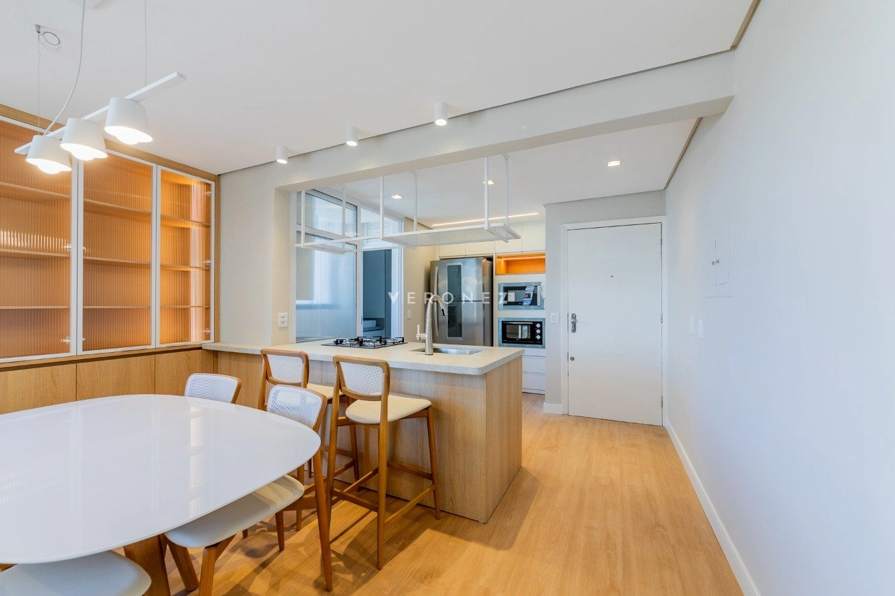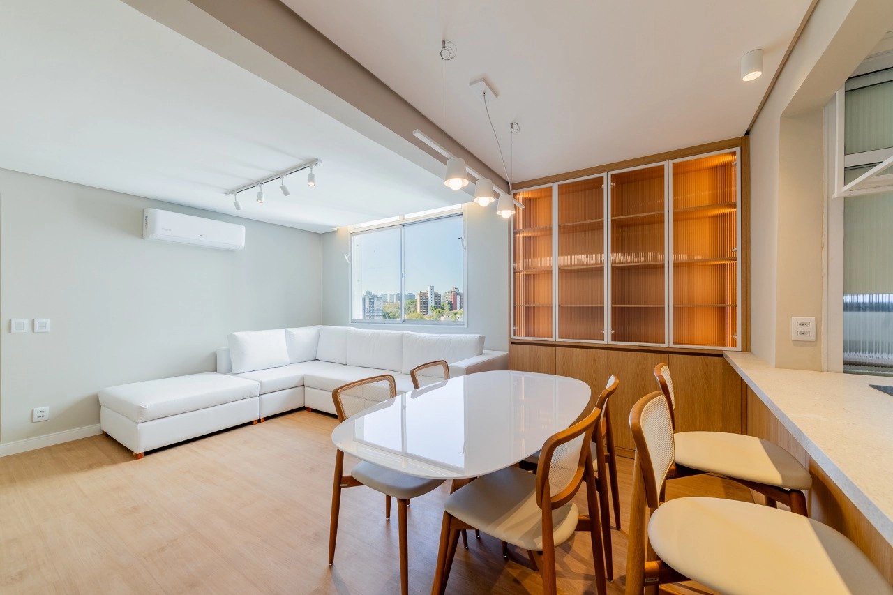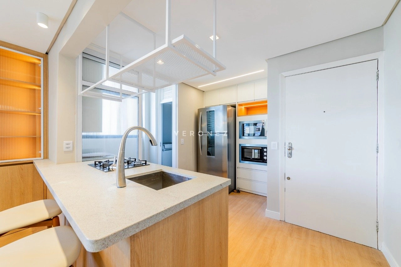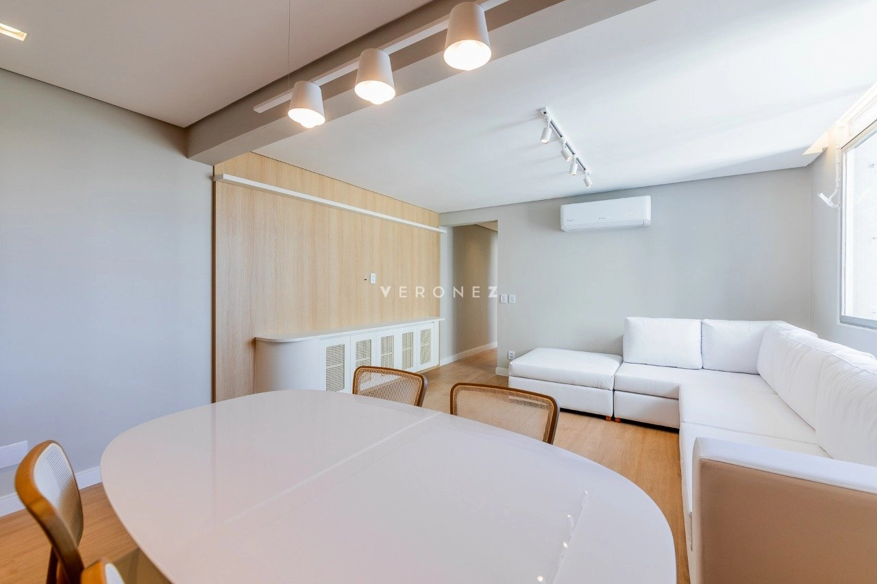Apartemento com 73m2 privativos, mobiliado, 2 dormitórios sendo 1 suíte, banheiro social, living com cozinha integrada e área de serviço separada, uma vaga de garagem.
