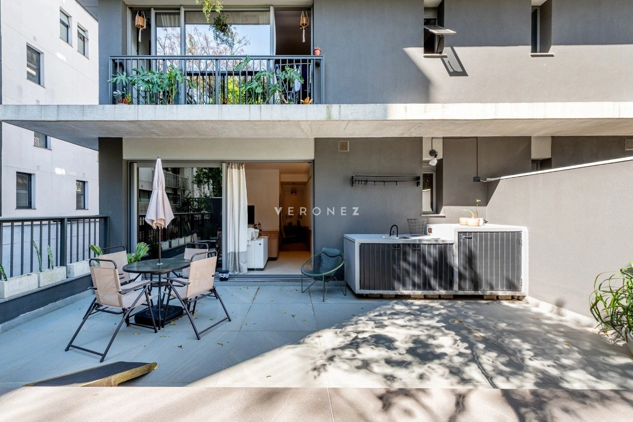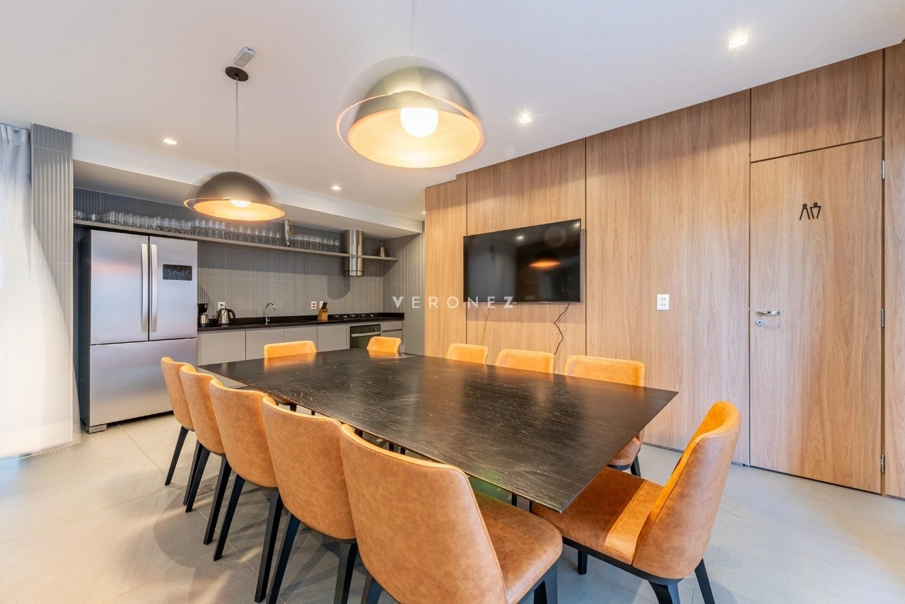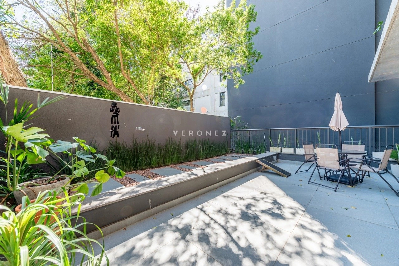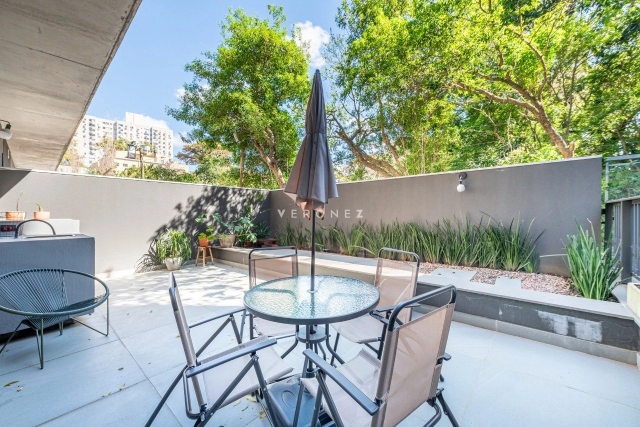 Apartamento Garden de 93 m² de área privativa, finalmente mobiliado, 2 dormitórios, tendo 1 suíte, cozinha integrada com churrasqueira e um terraço amplo.