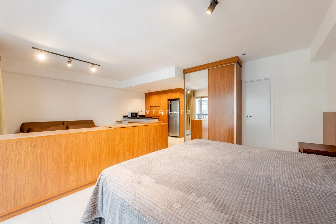 Apartamento estilo Loft com 47m² privativos, novo e mobiliado, cozinha americana com churrasqueira.