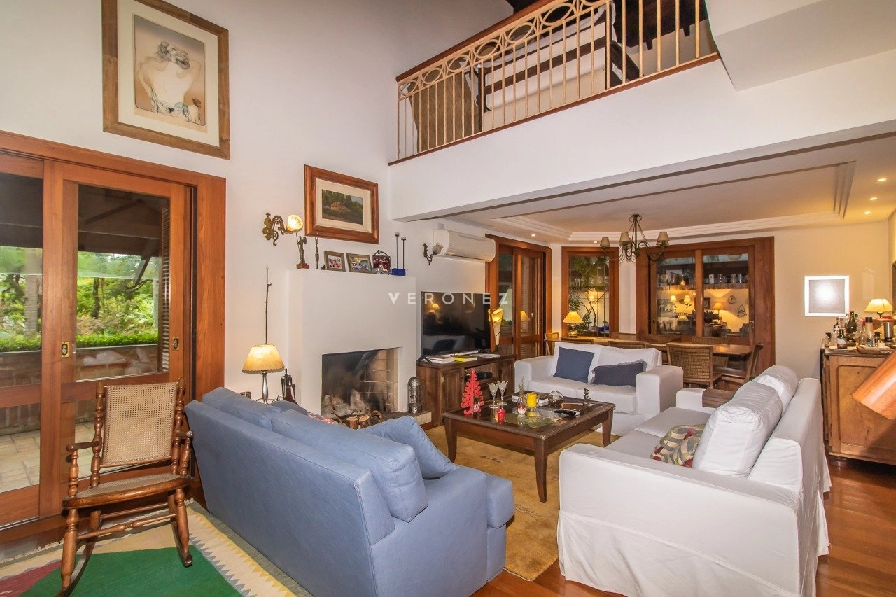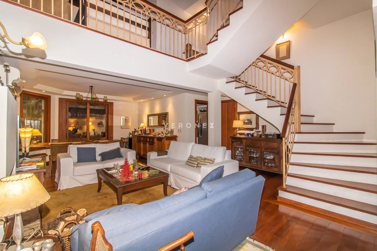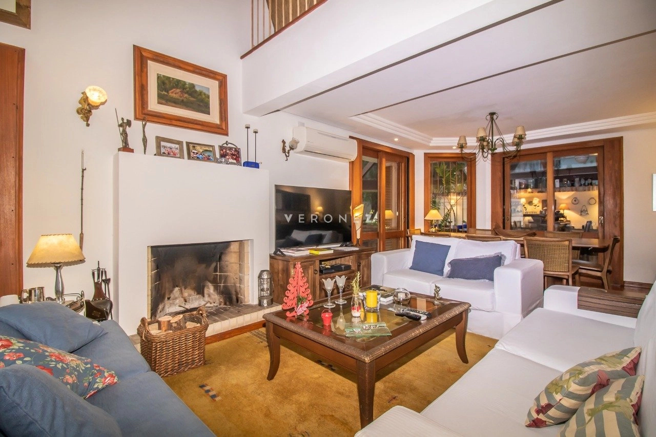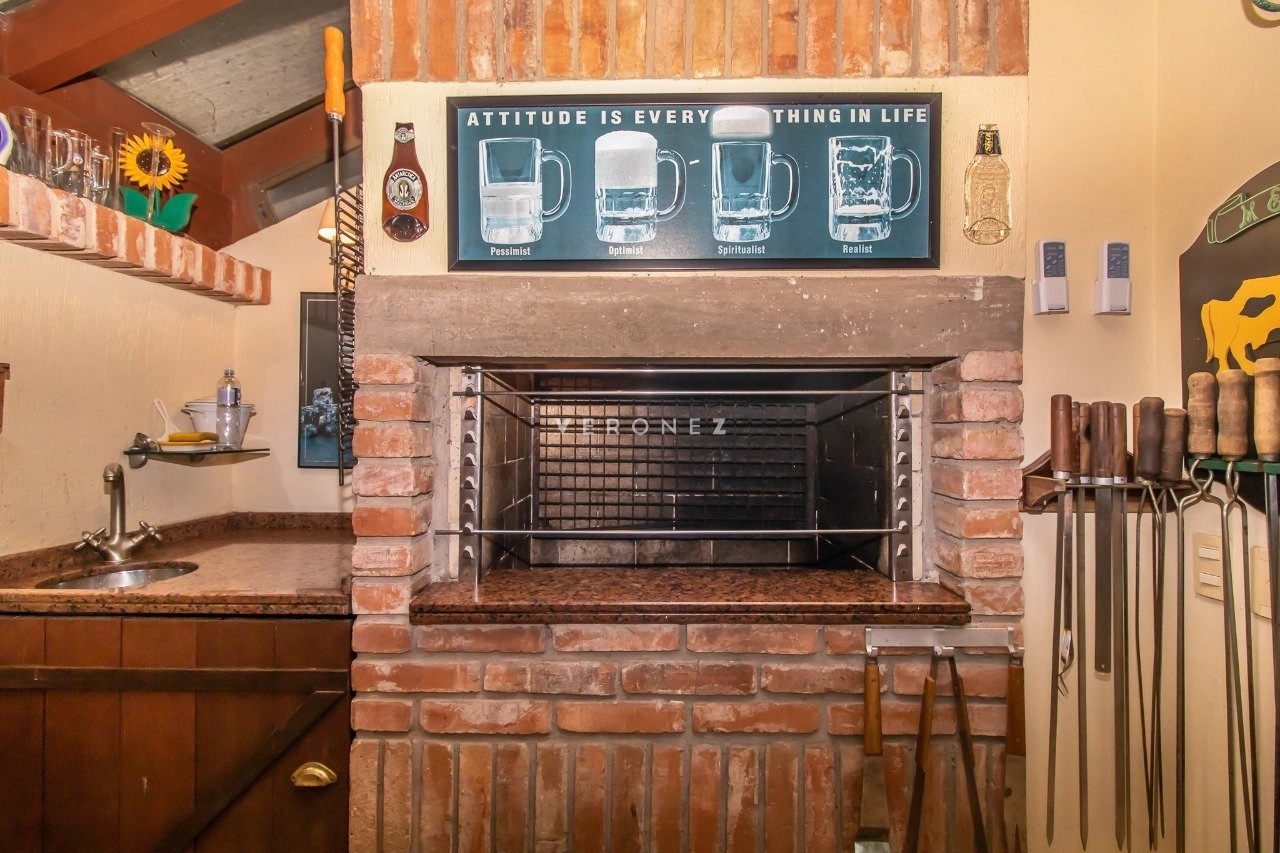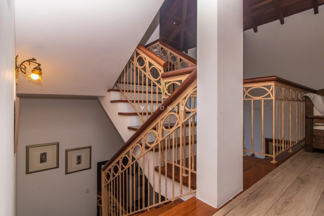No 1º andar temos churrasqueira, ampla sacada ensolarada (toda frente norte), living com 52m², lareira, cozinha, área de serviço e dependência com banheiro e água quente. Ficam todos os móveis fixos que são de ótima qualidade.