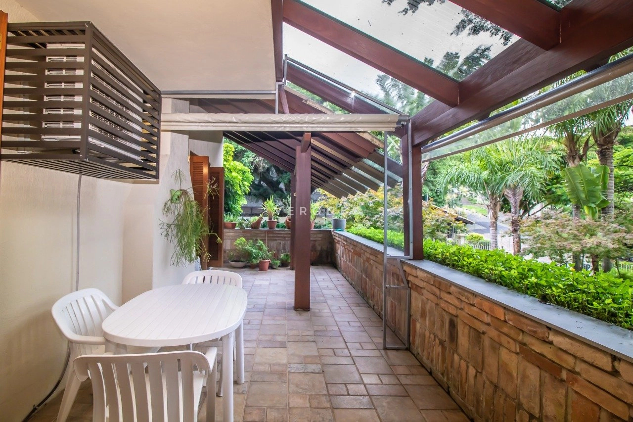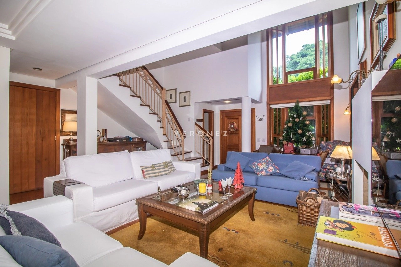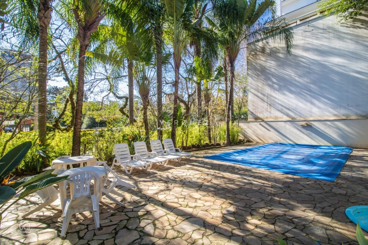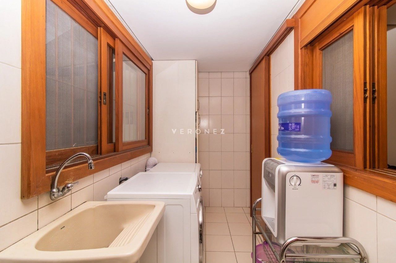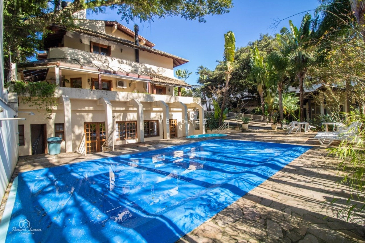 No 1º andar temos churrasqueira, ampla sacada ensolarada (toda frente norte), living com 52m², lareira, cozinha, área de serviço e dependência com banheiro e água quente. Ficam todos os móveis fixos que são de ótima qualidade.
