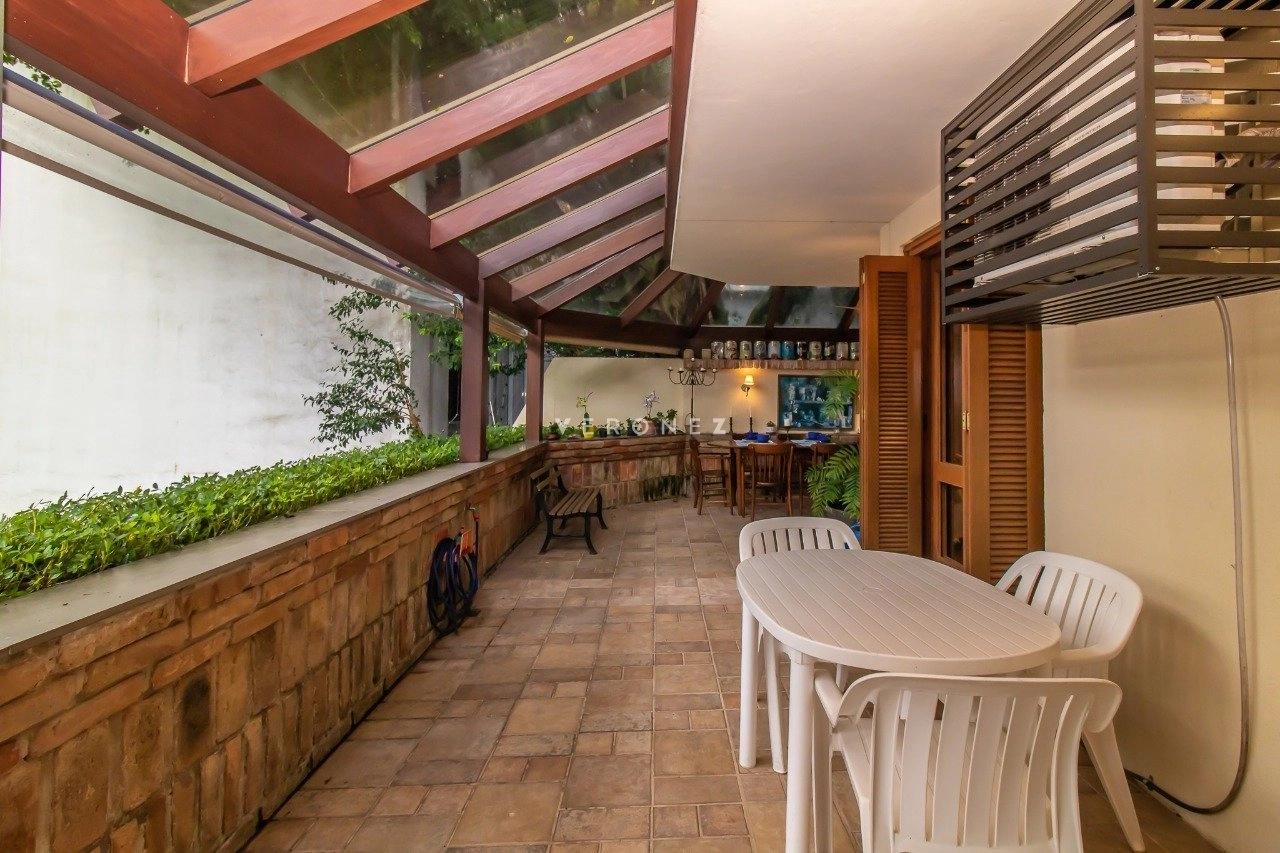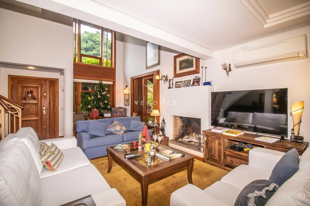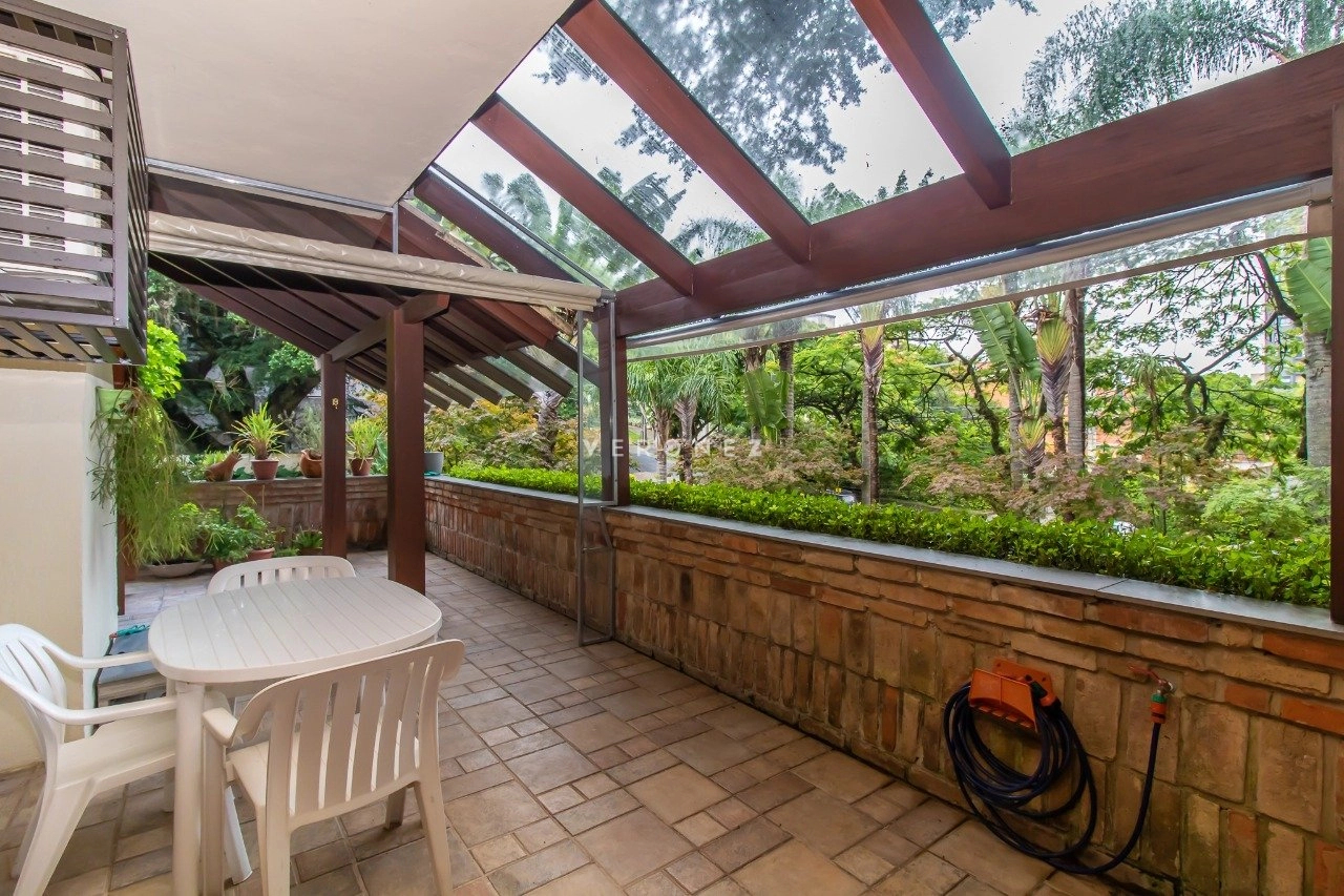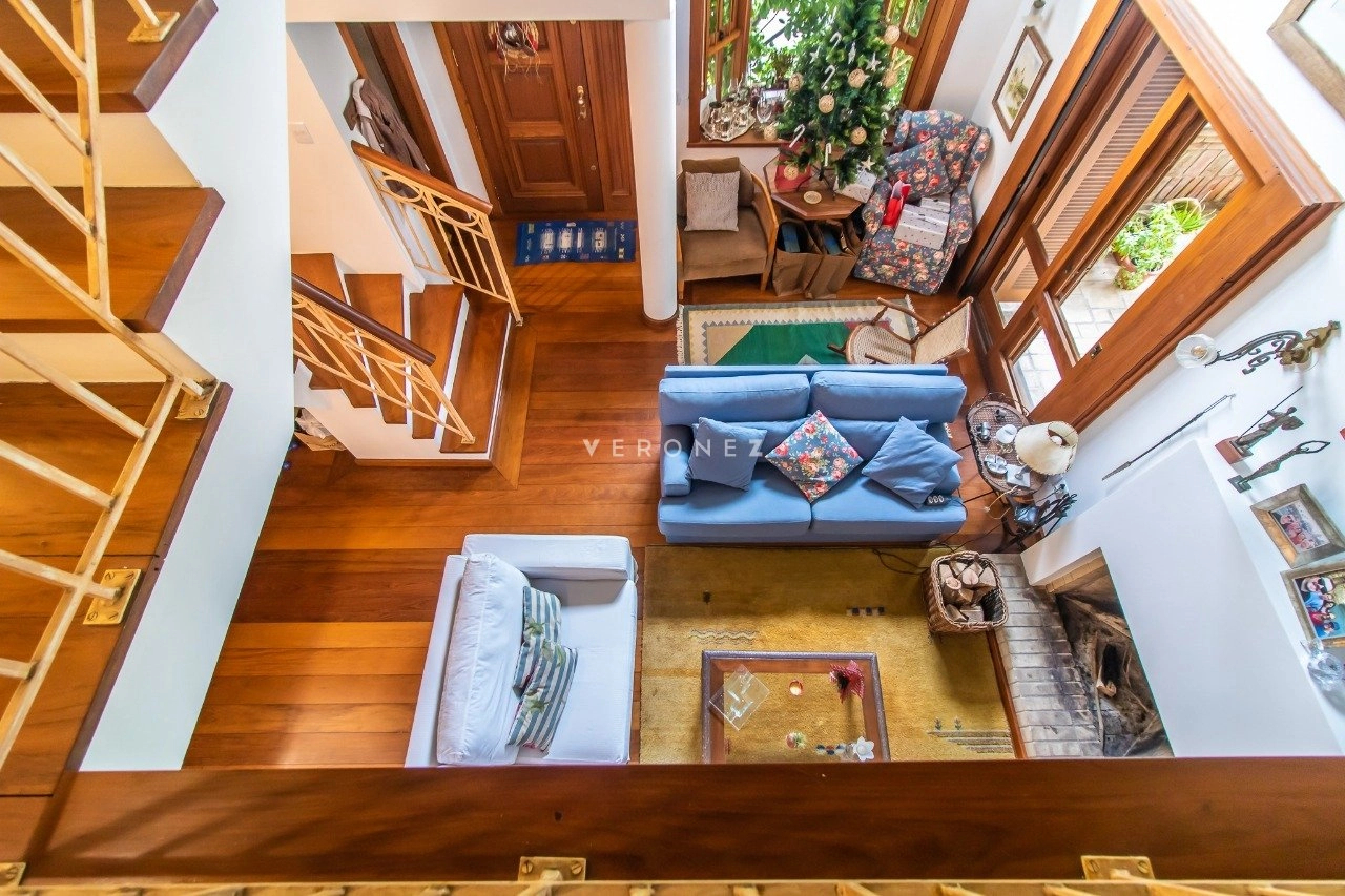 No 1º andar temos churrasqueira, ampla sacada ensolarada (toda frente norte), living com 52m², lareira, cozinha, área de serviço e dependência com banheiro e água quente. Ficam todos os móveis fixos que são de ótima qualidade.