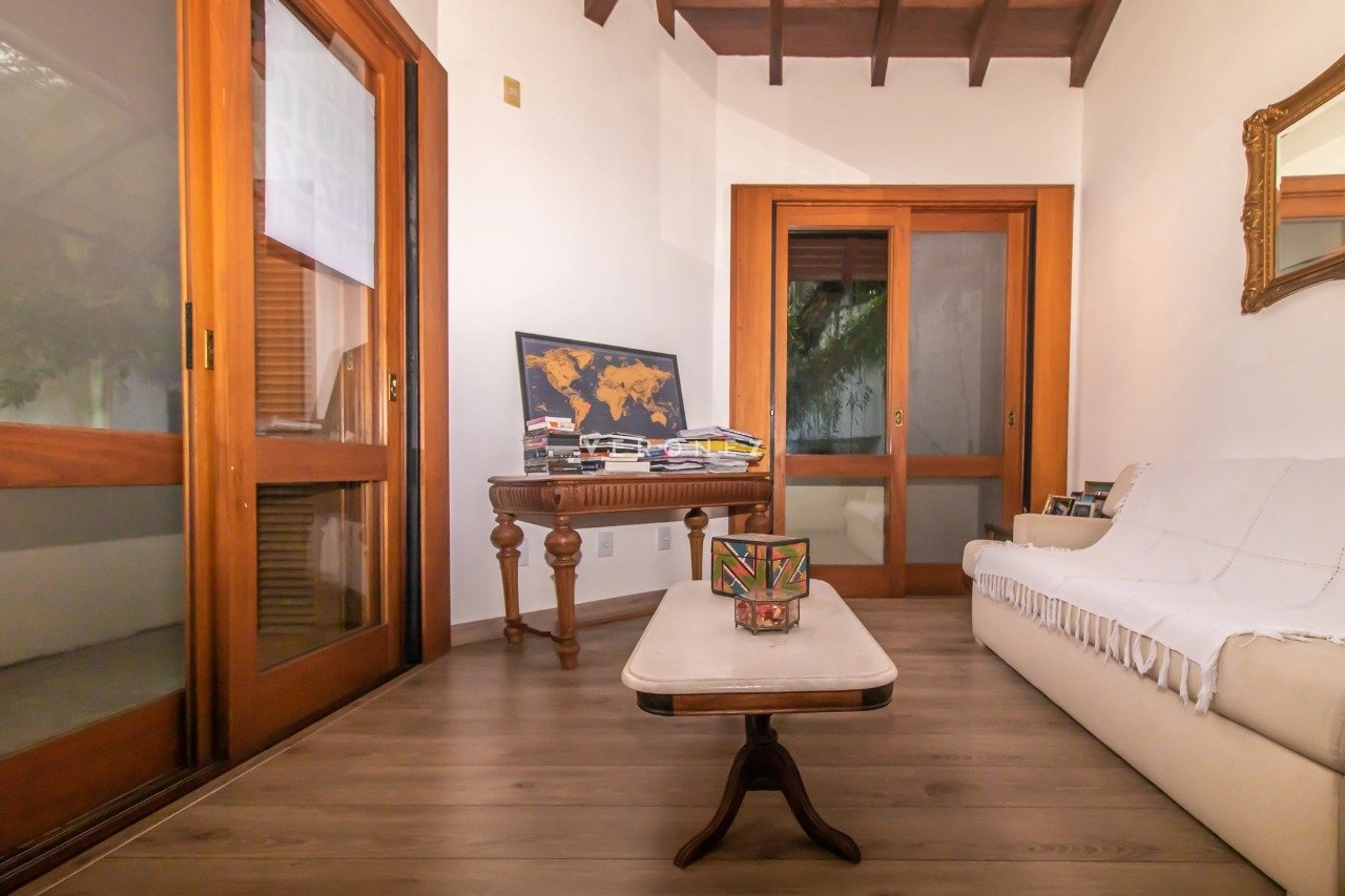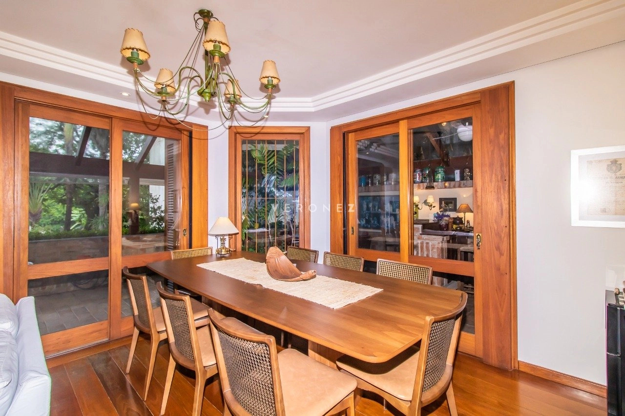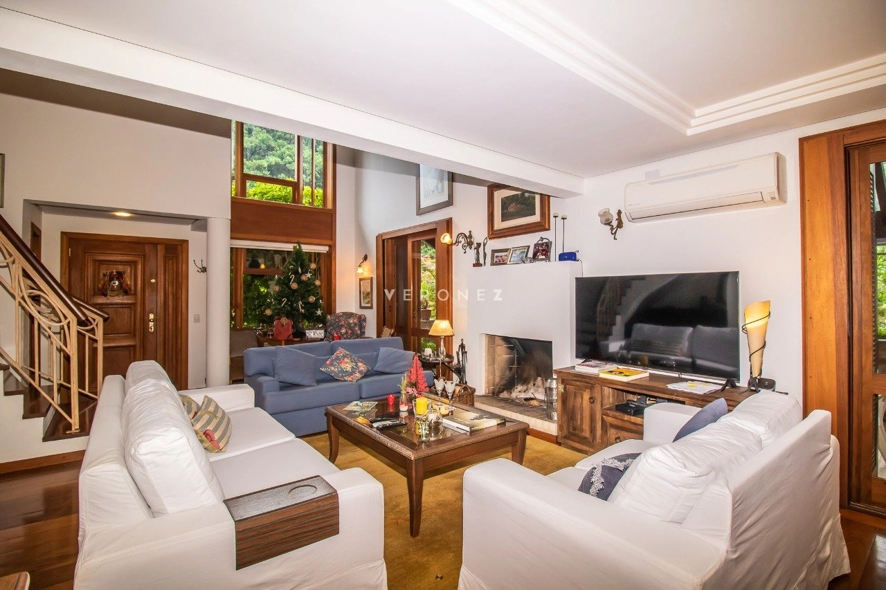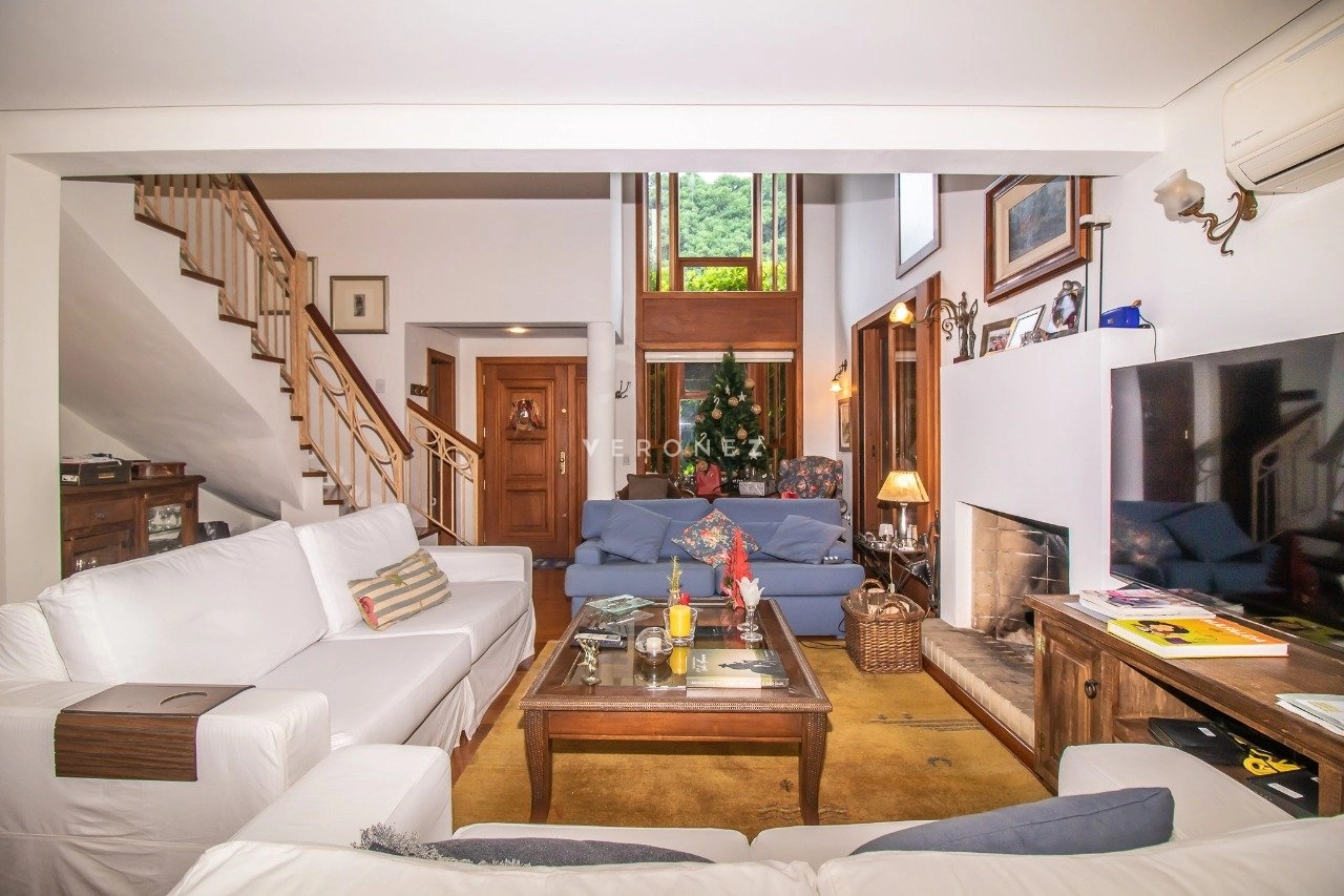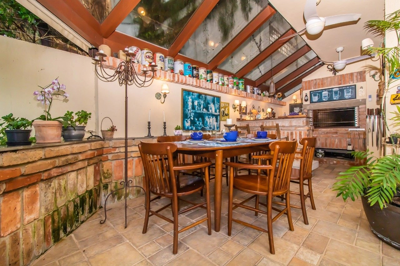No 1º andar temos churrasqueira, ampla sacada ensolarada (toda frente norte), living com 52m², lareira, cozinha, área de serviço e dependência com banheiro e água quente. Ficam todos os móveis fixos que são de ótima qualidade.