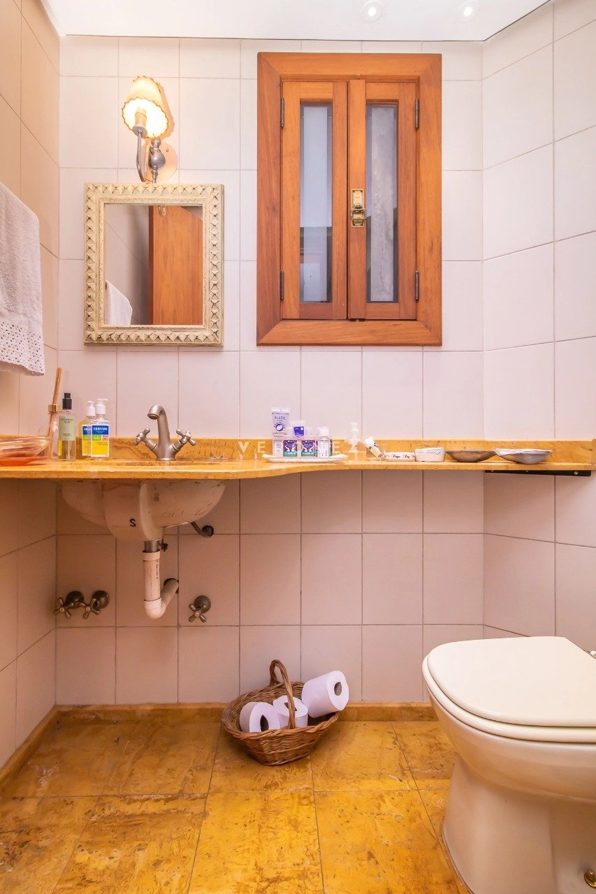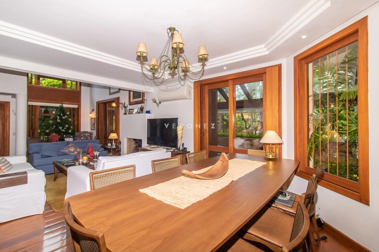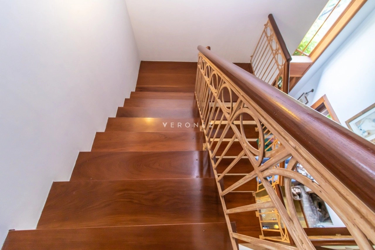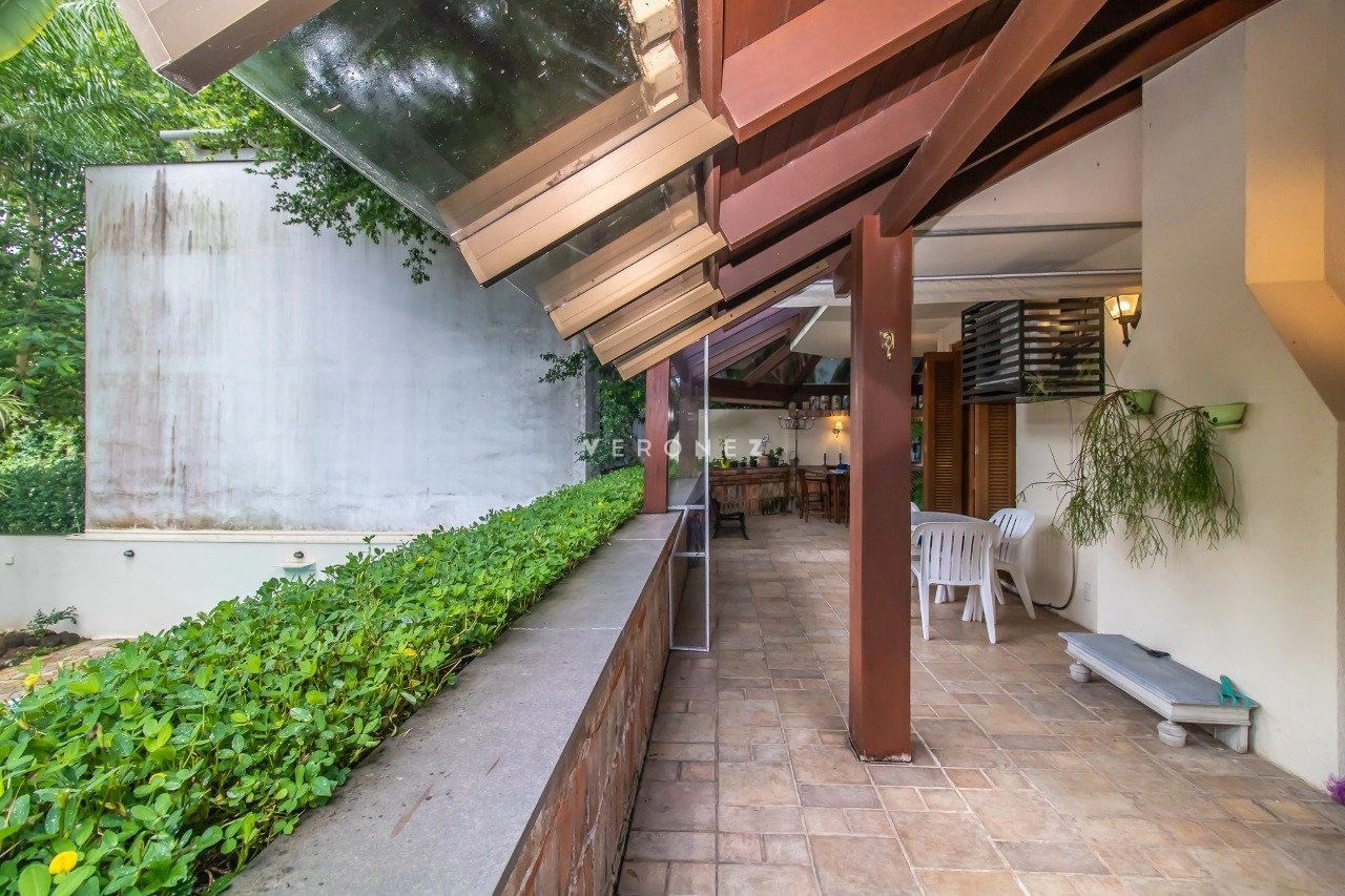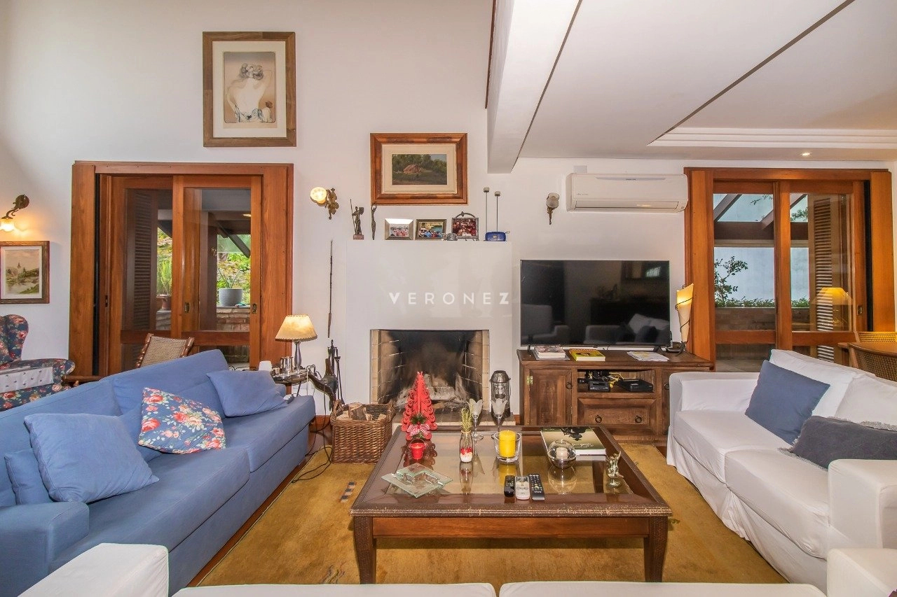 No 1º andar temos churrasqueira, ampla sacada ensolarada (toda frente norte), living com 52m², lareira, cozinha, área de serviço e dependência com banheiro e água quente. Ficam todos os móveis fixos que são de ótima qualidade.