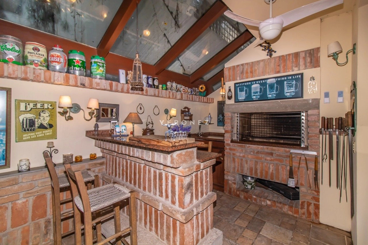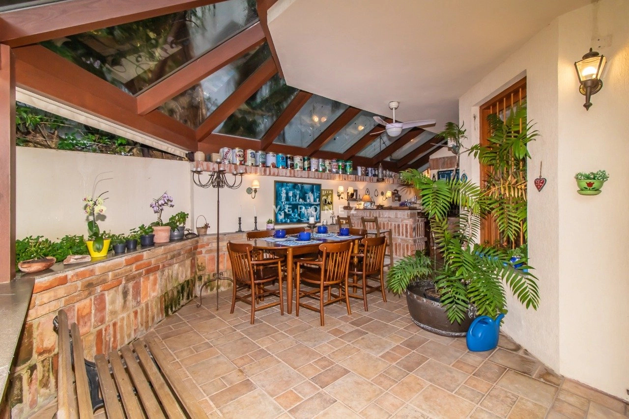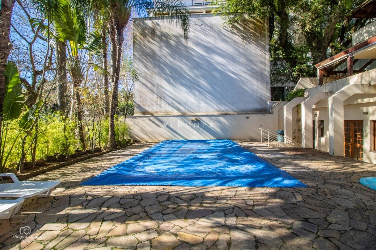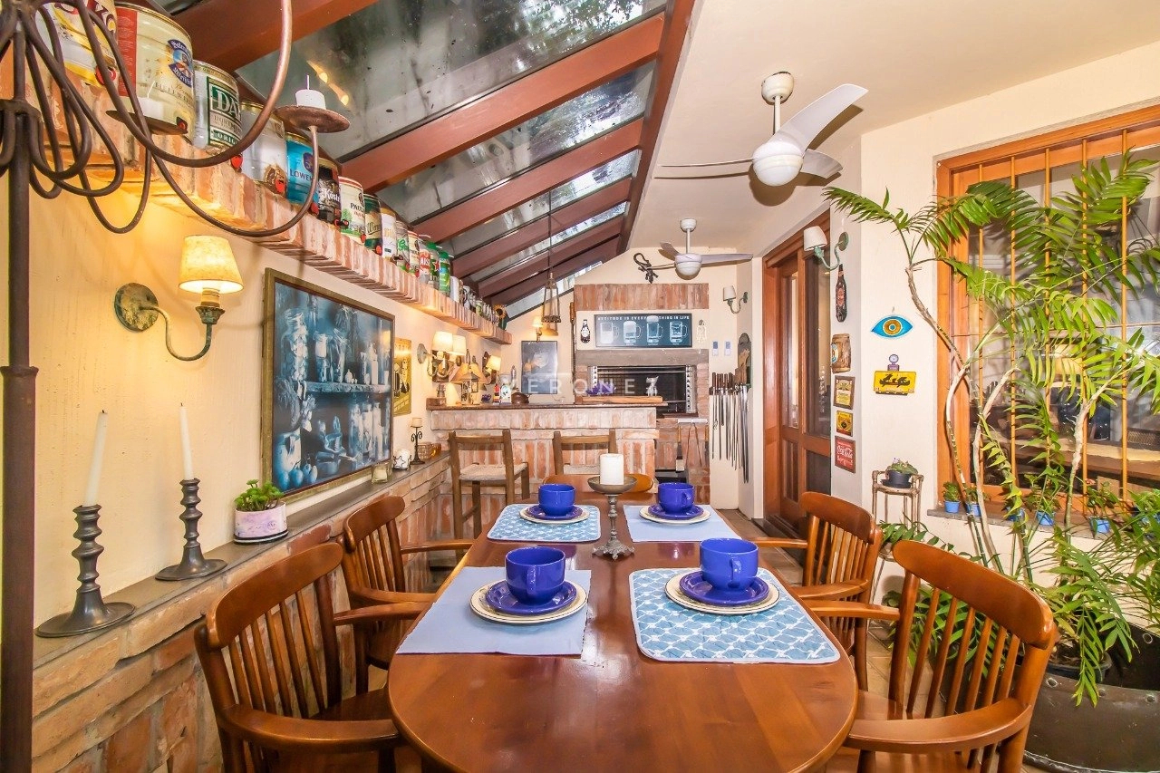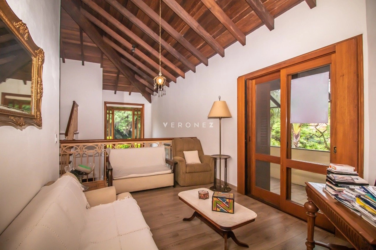 No 1º andar temos churrasqueira, ampla sacada ensolarada (toda frente norte), living com 52m², lareira, cozinha, área de serviço e dependência com banheiro e água quente. Ficam todos os móveis fixos que são de ótima qualidade.