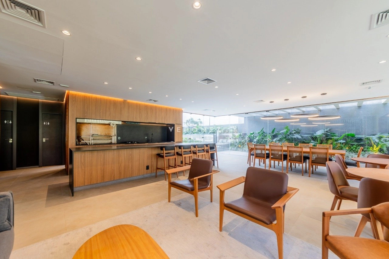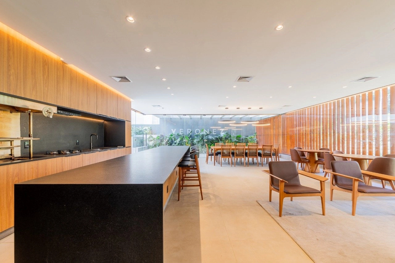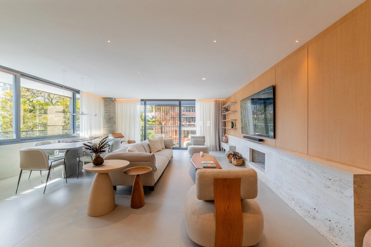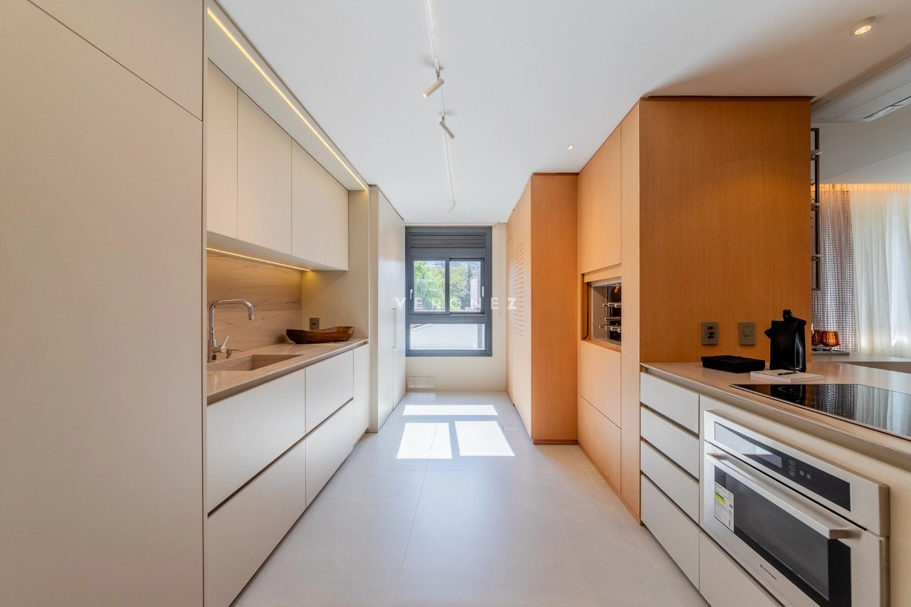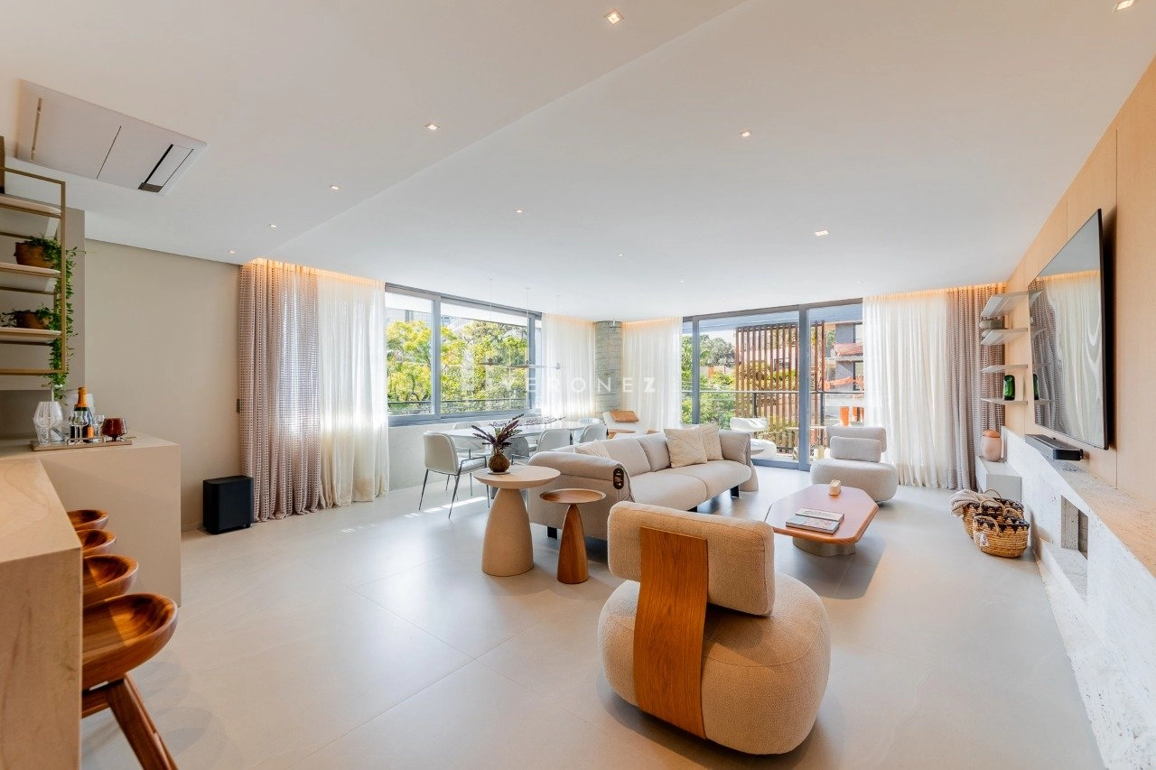 Apartamento de 170 m², finamente mobiliado e decorado. Possui 2 amplas suítes, sendo uma máster com 70 m², closet, dois banheiros com piso aquecido. Living espaçoso de 64 m², com lareira, sacada e excelente orientação solar leste (sol da manhã). Cozinha integrada, equipada com eletrodomésticos Elettromec e churrasqueira motorizada com acabamento em inox.