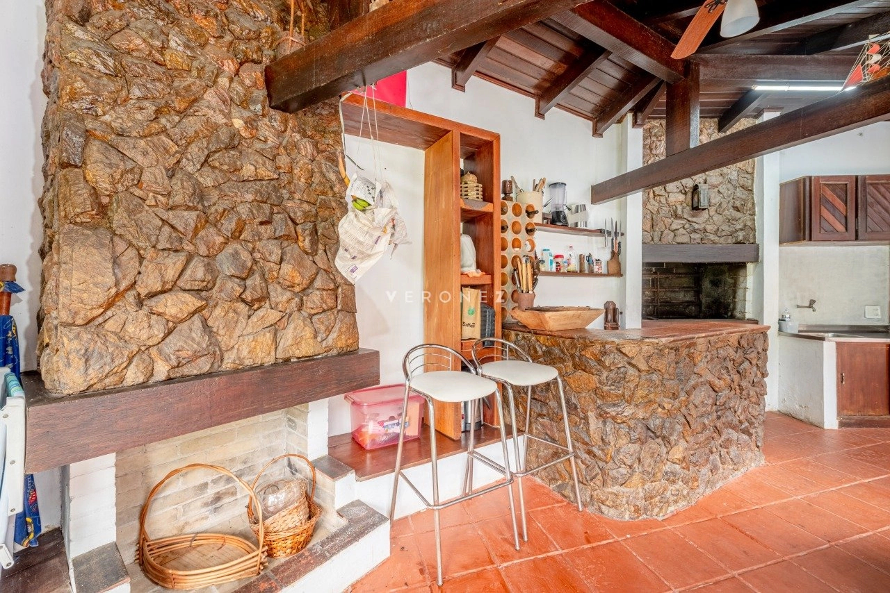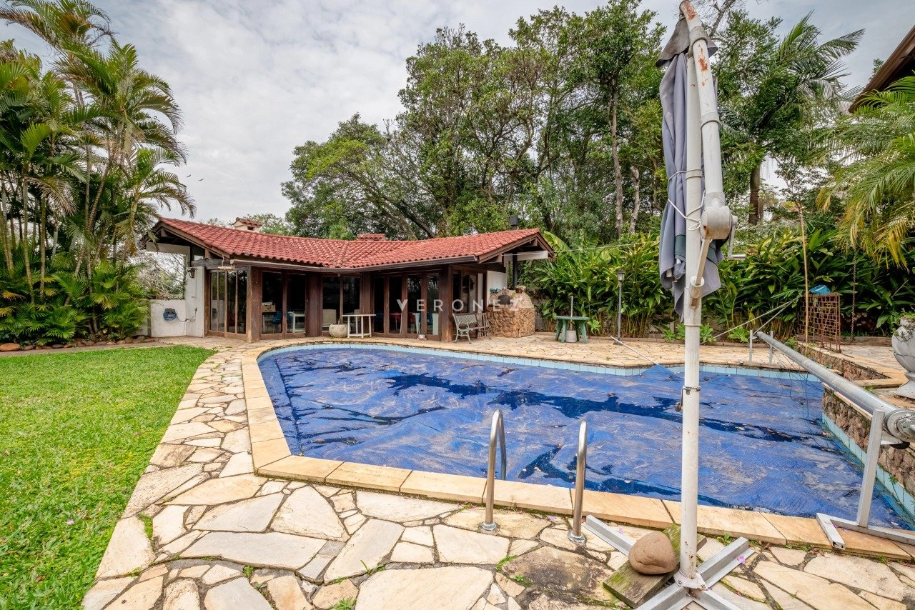 Na área externa: pátio com piscina, pomar no fundo do terreno e uma casa anexa com banheiro, lareira e churrasqueira.