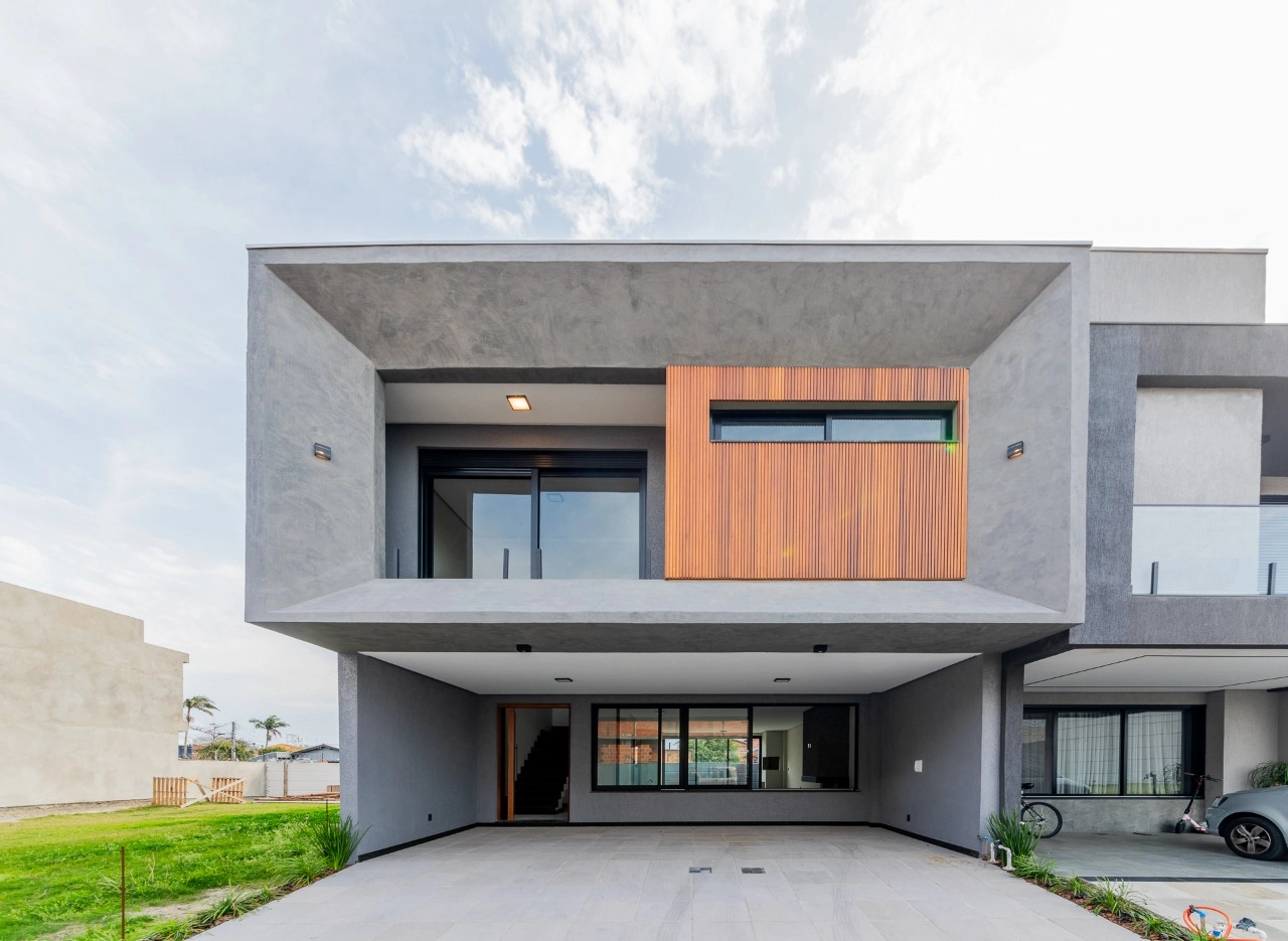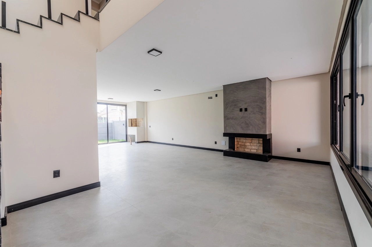 No térreo, conta com amplo living para 2 ambientes com lareira, lavabo, área gourmet com churrasqueira, cozinha americana, área de serviço independente e pátio.