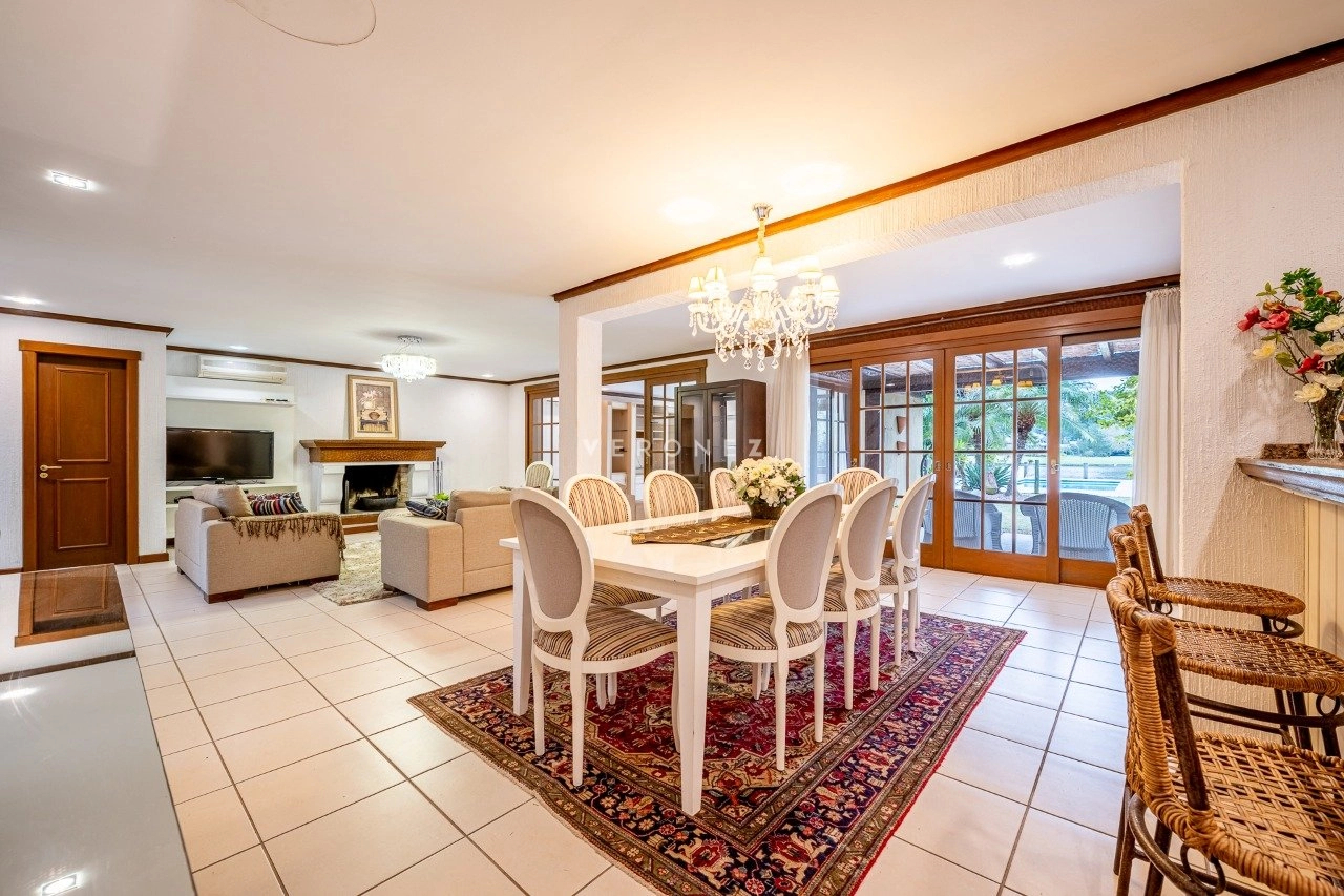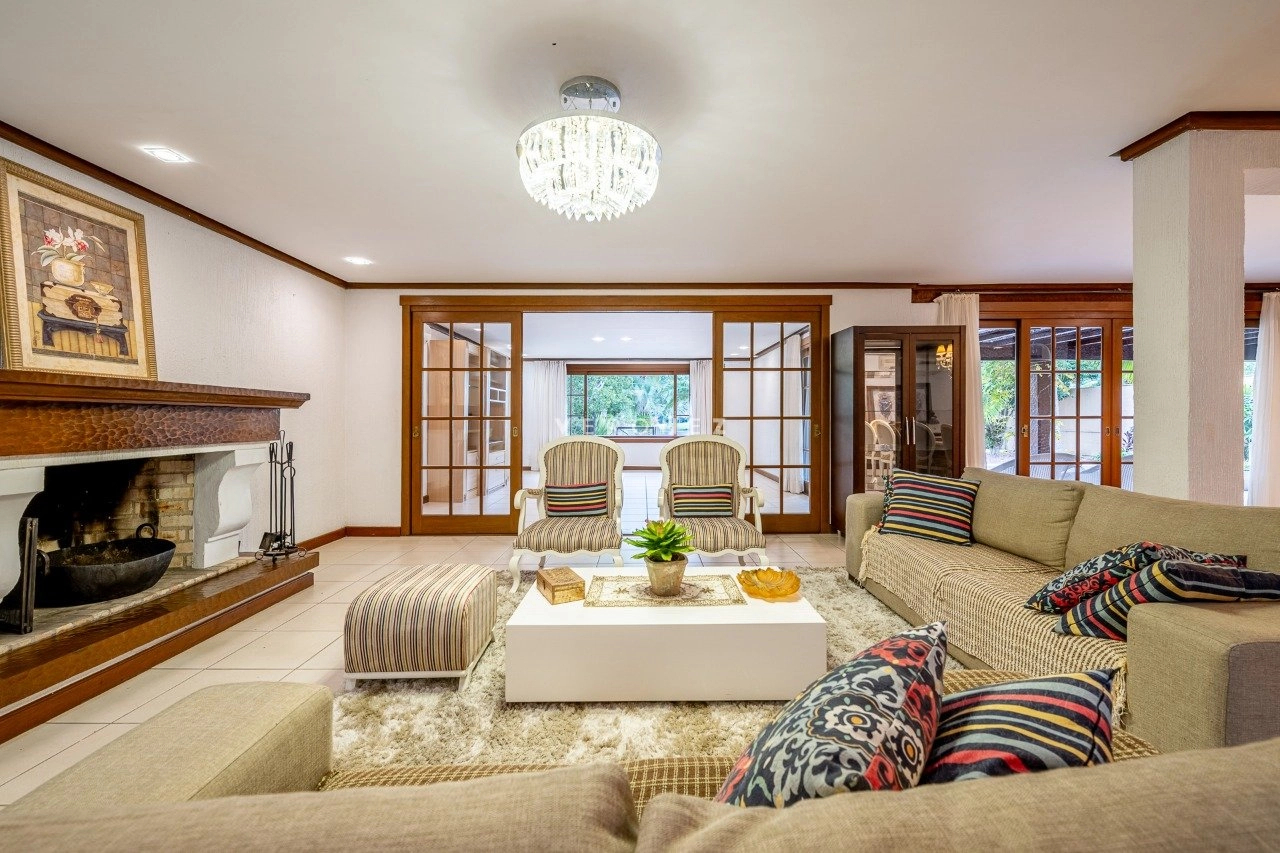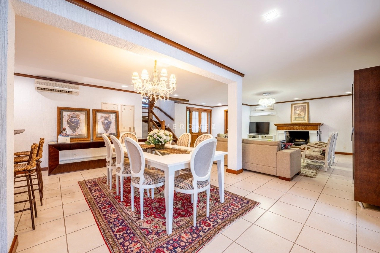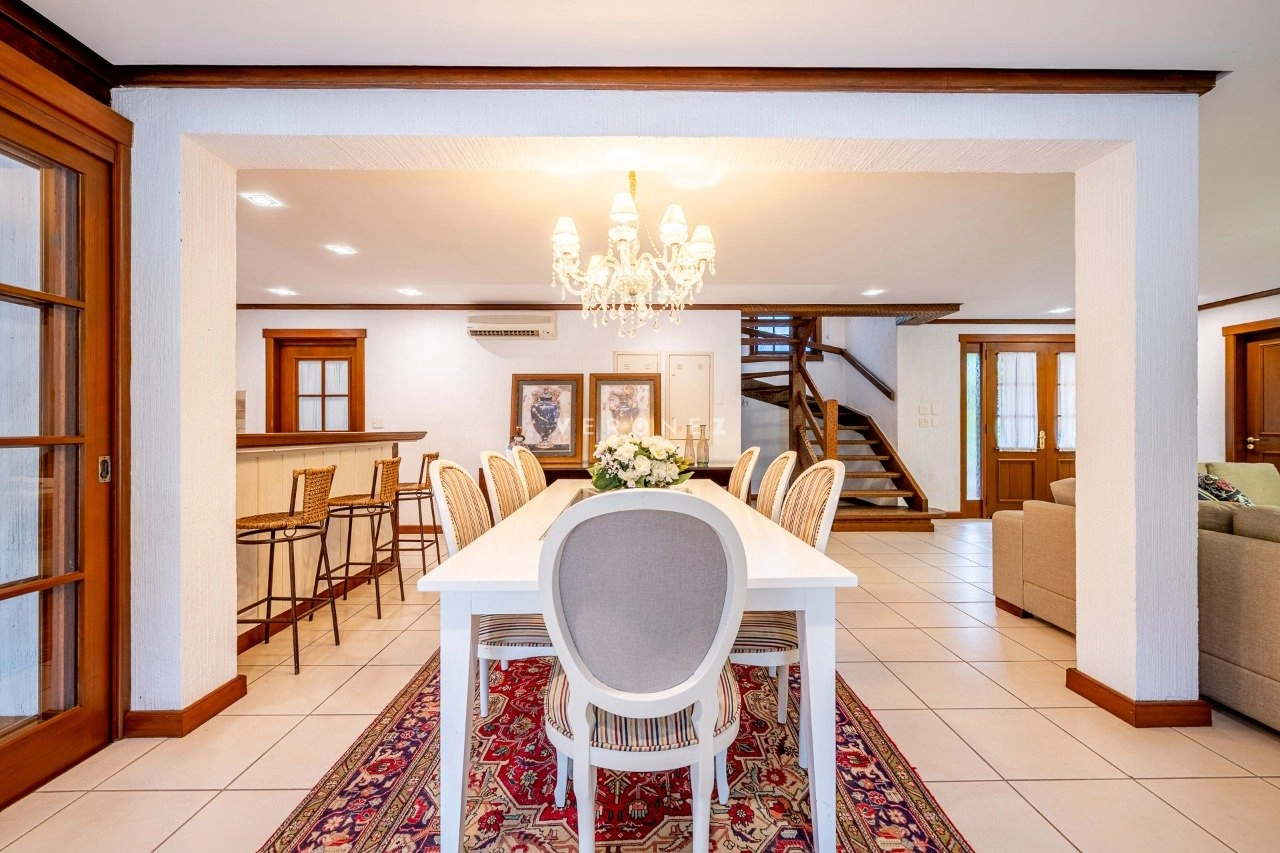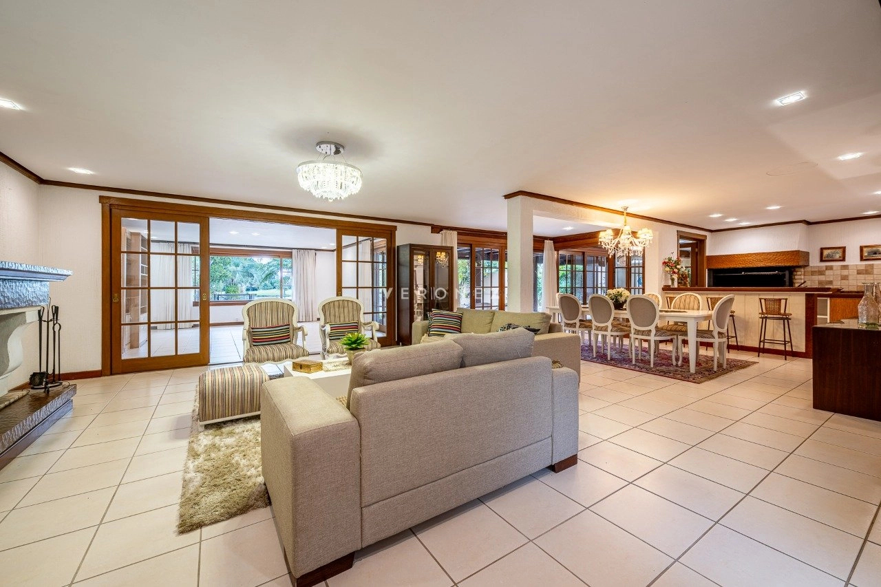 A área social é integrada e muito bem planejada, com sala de estar com lareira, sala de TV, cozinha mobiliada, despensa e área de serviço. Conta ainda com espaço gourmet com churrasqueira e uma varanda ampla com vista deslumbrante para o lago.