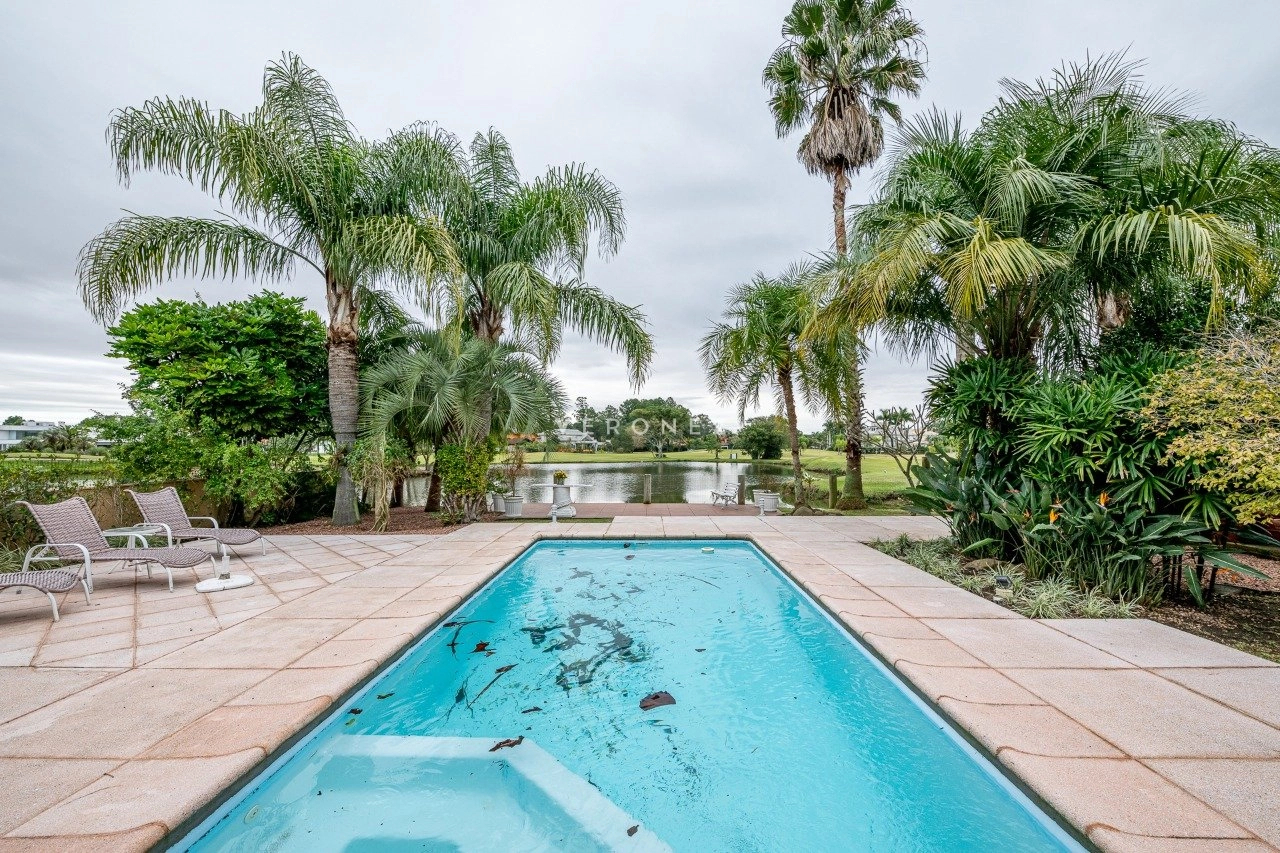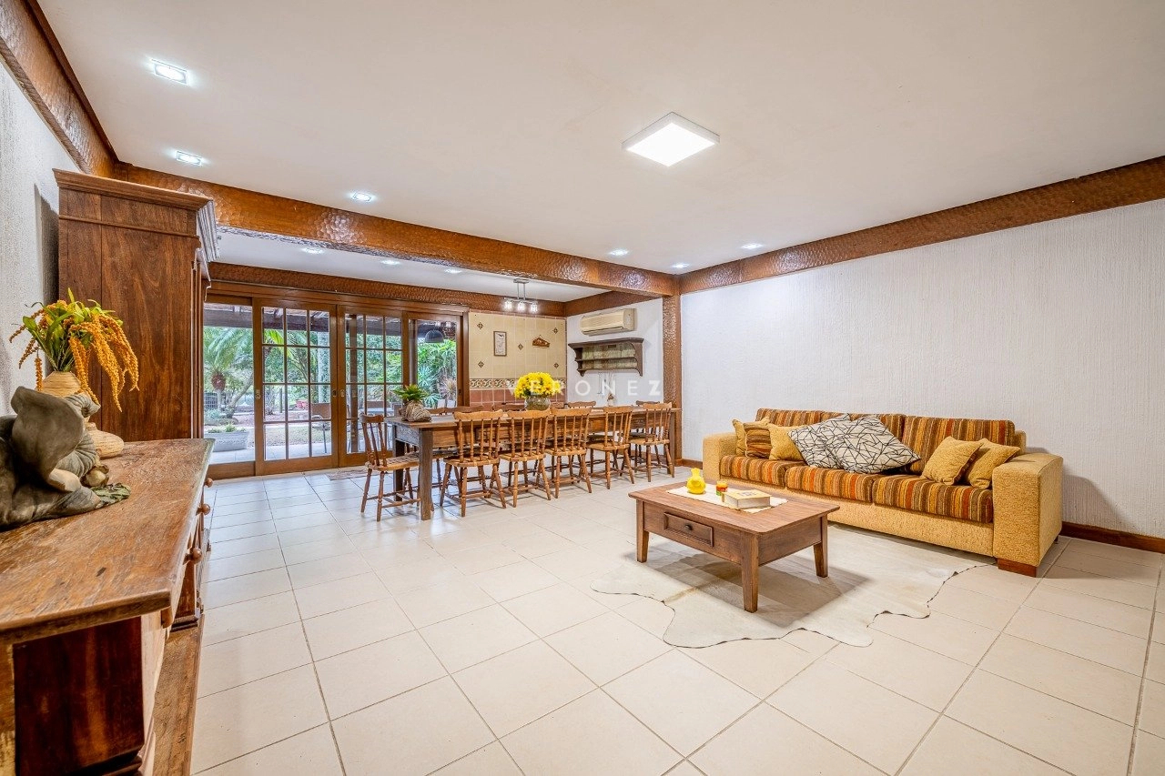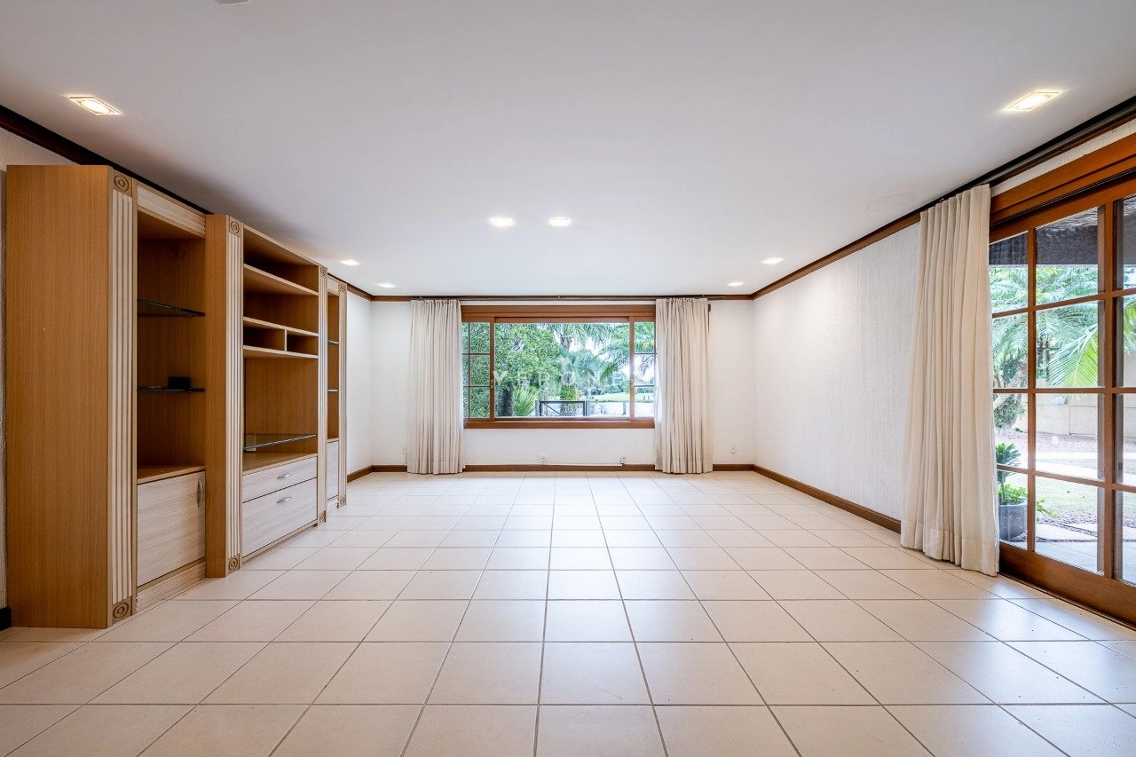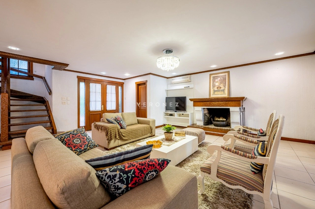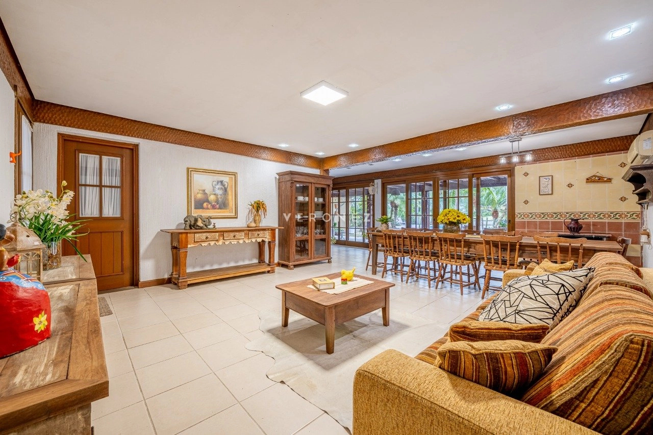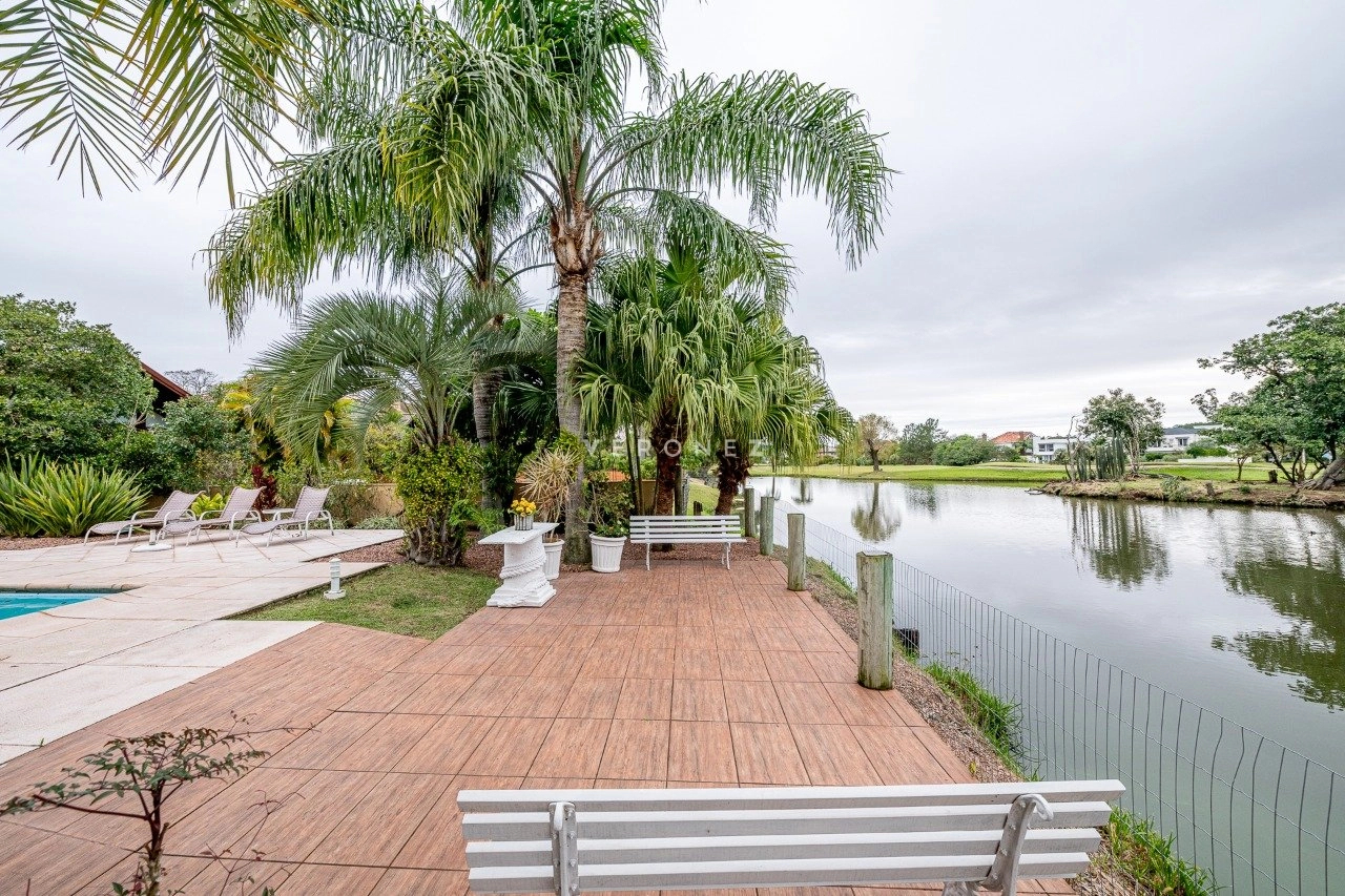 A área social é integrada e muito bem planejada, com sala de estar com lareira, sala de TV, cozinha mobiliada, despensa e área de serviço. Conta ainda com espaço gourmet com churrasqueira e uma varanda ampla com vista deslumbrante para o lago.