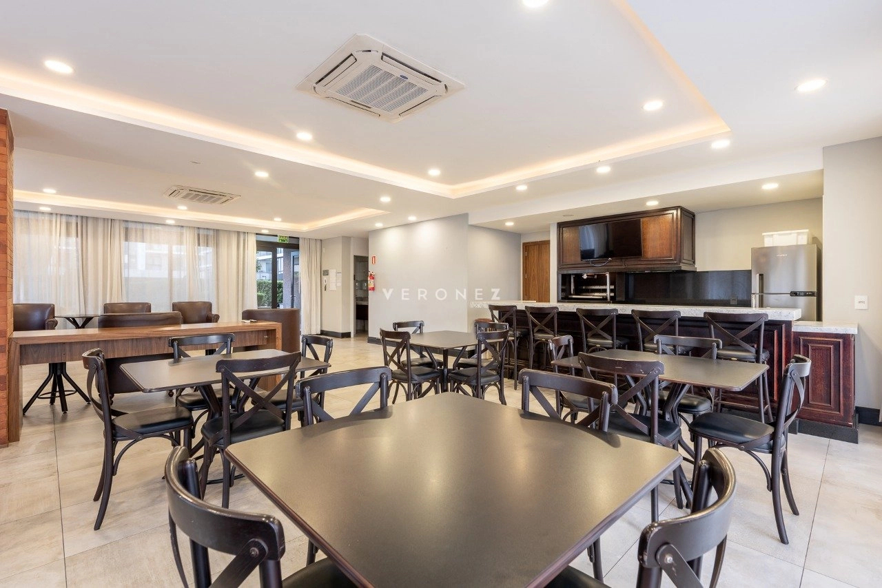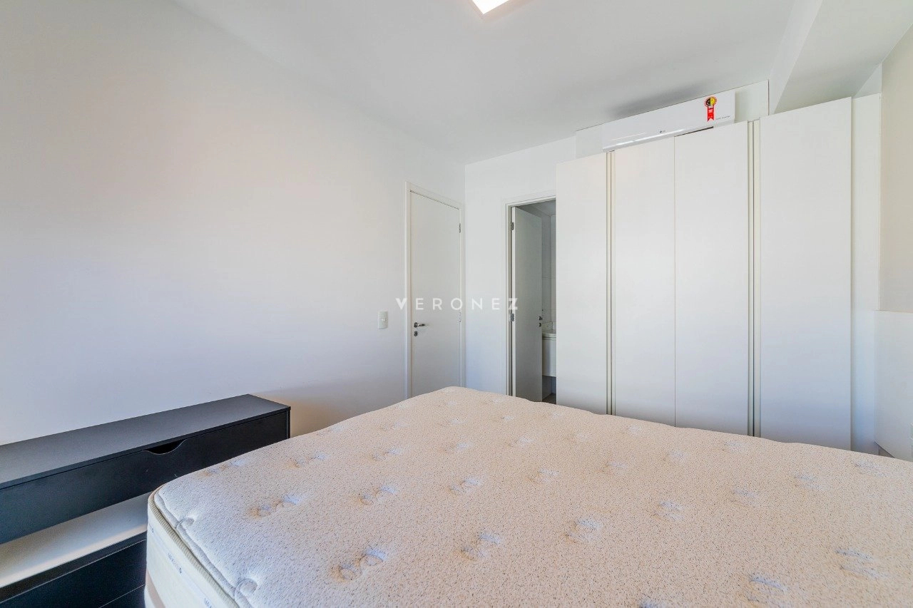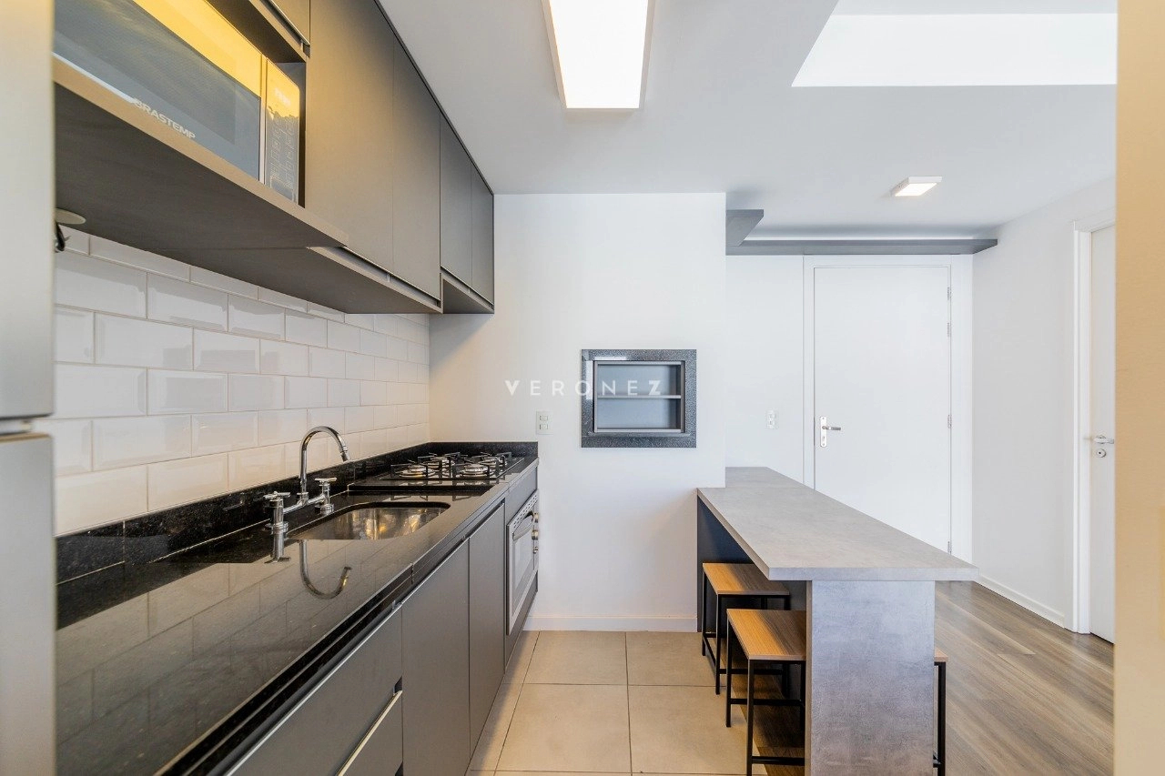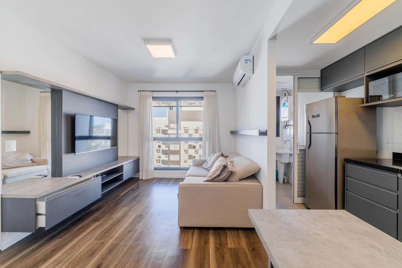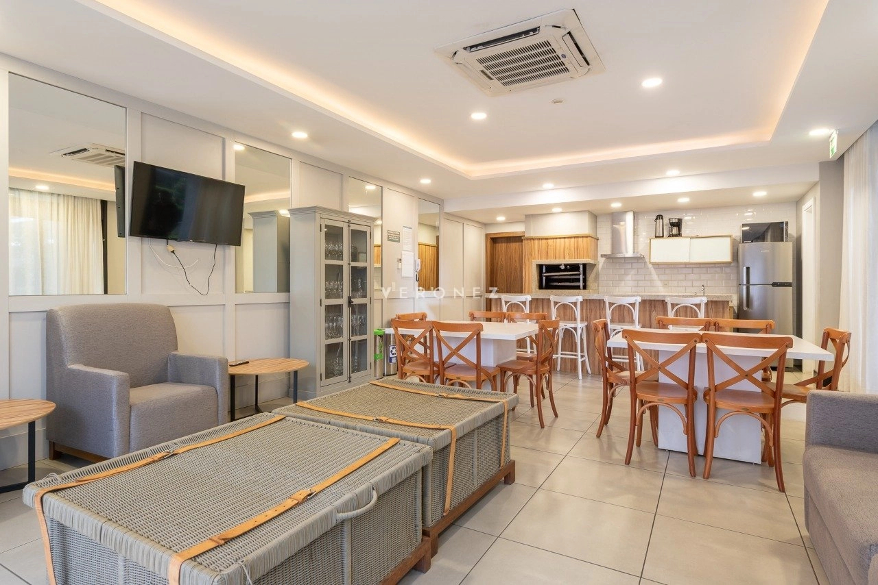 Apartamento mobiliado de 41 m² com 1 suíte, cozinha americana com churrasqueira, área de serviço integrada, lavabo e 2 vagas de garagem.