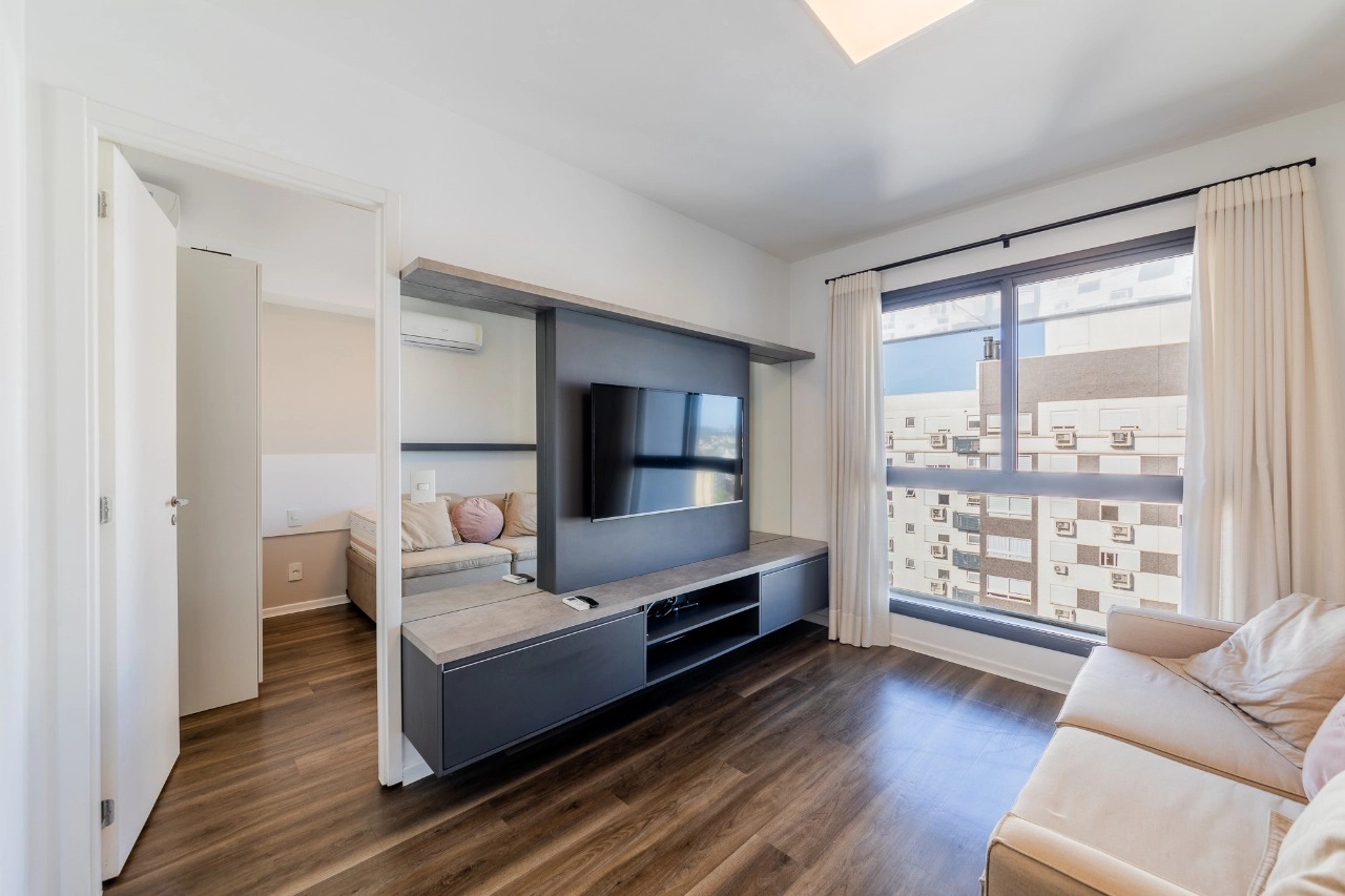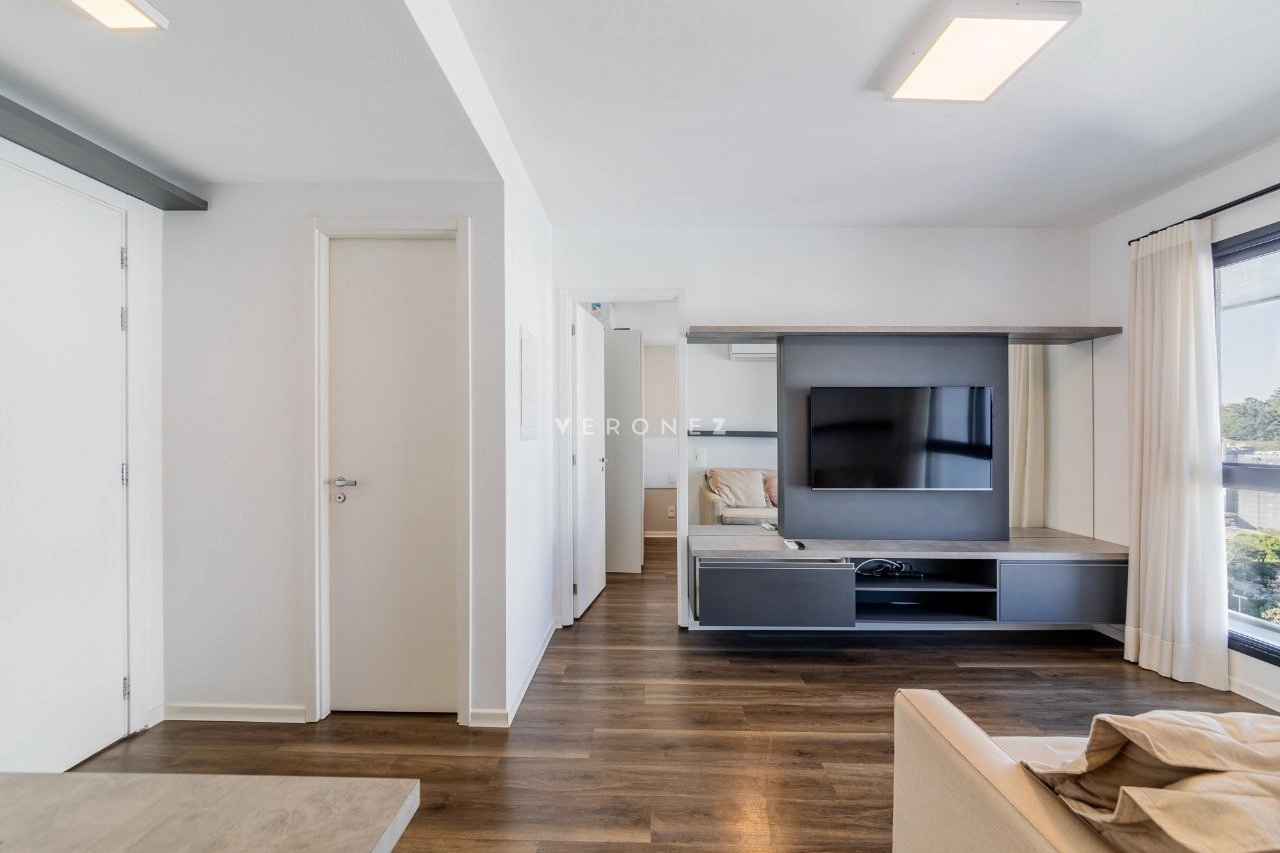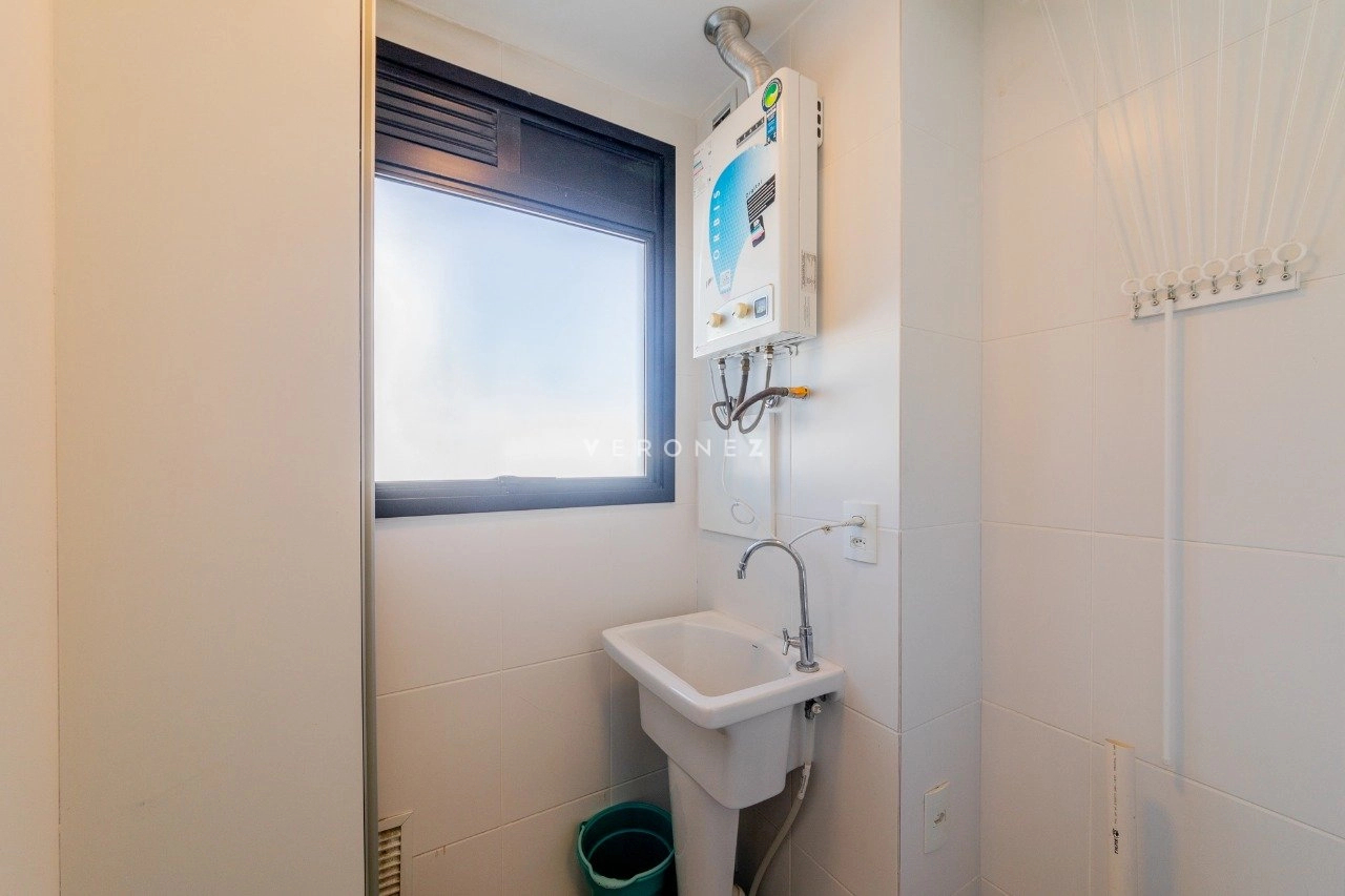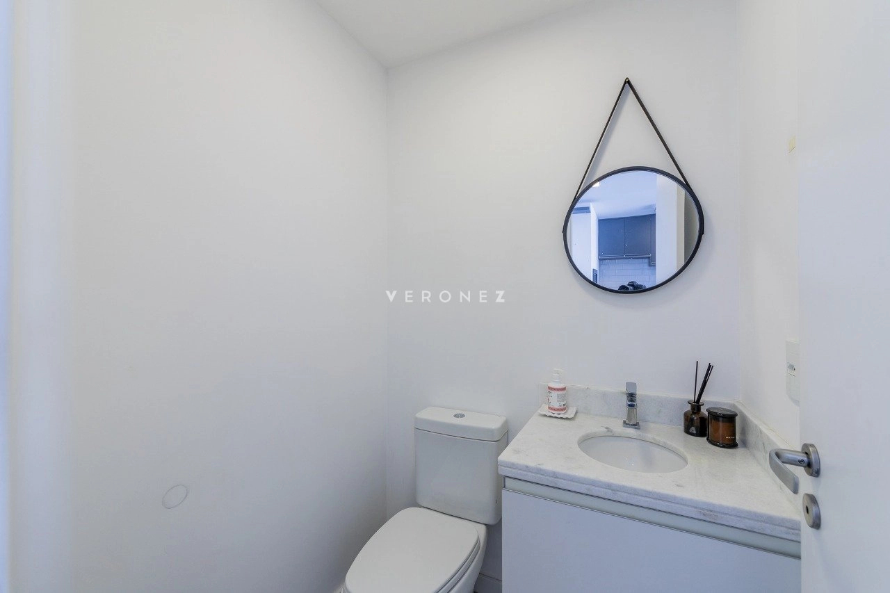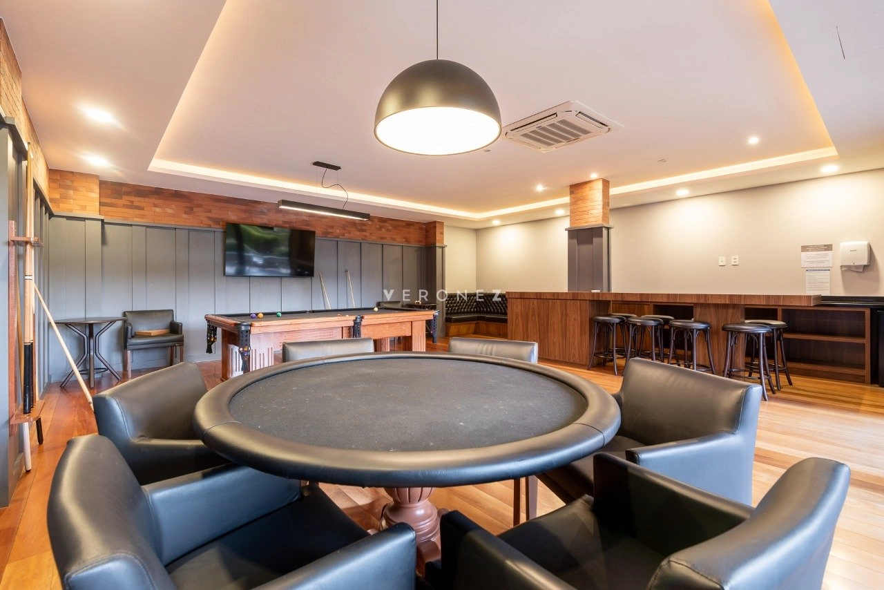 Apartamento mobiliado de 41 m² com 1 suíte, cozinha americana com churrasqueira, área de serviço integrada, lavabo e 2 vagas de garagem.
