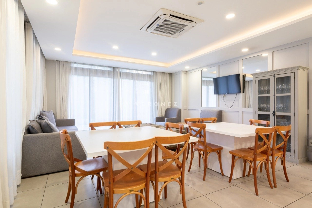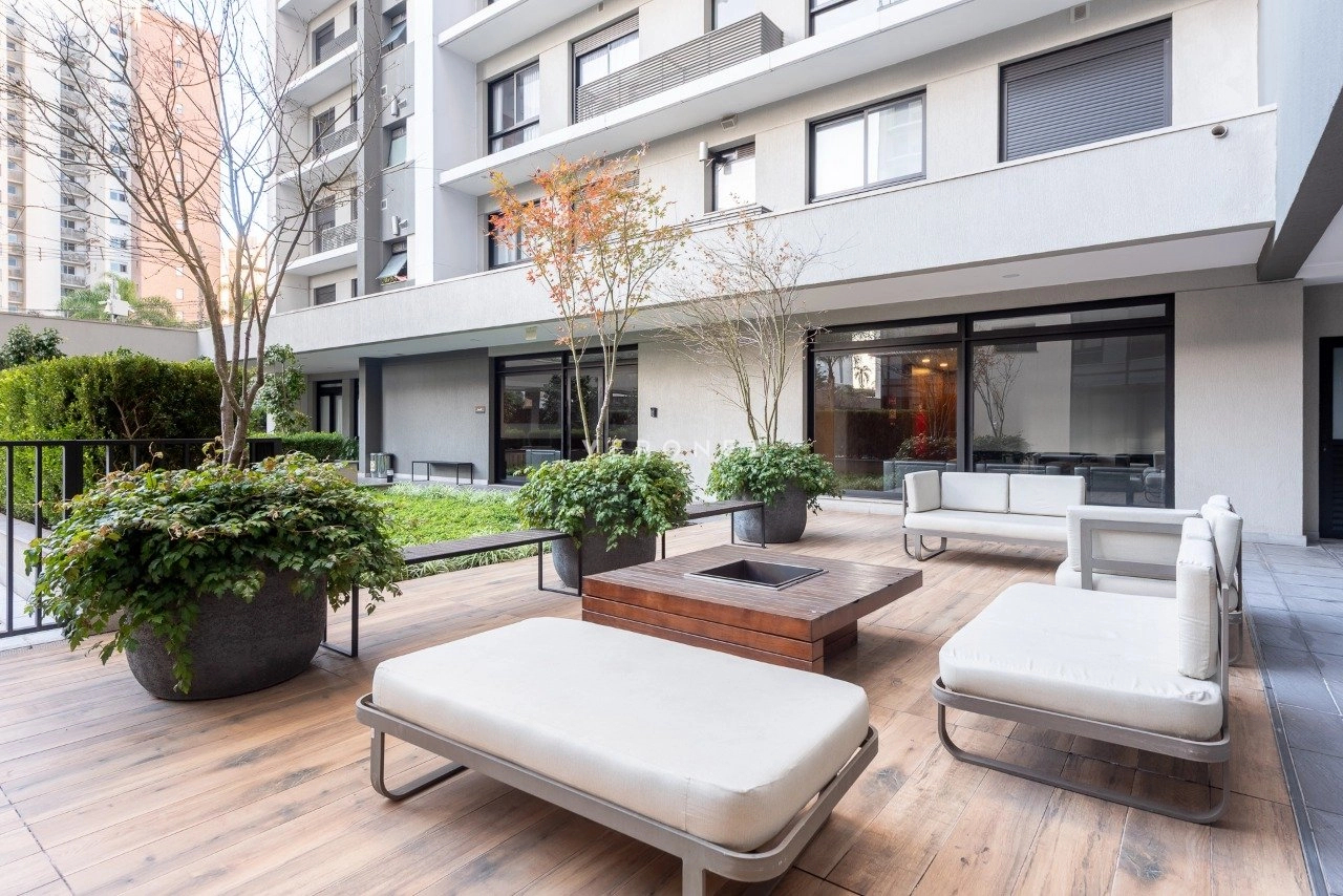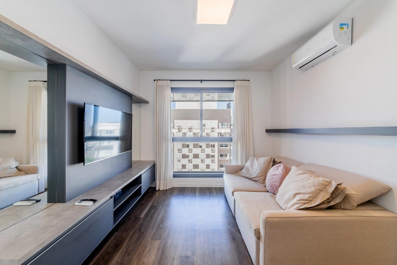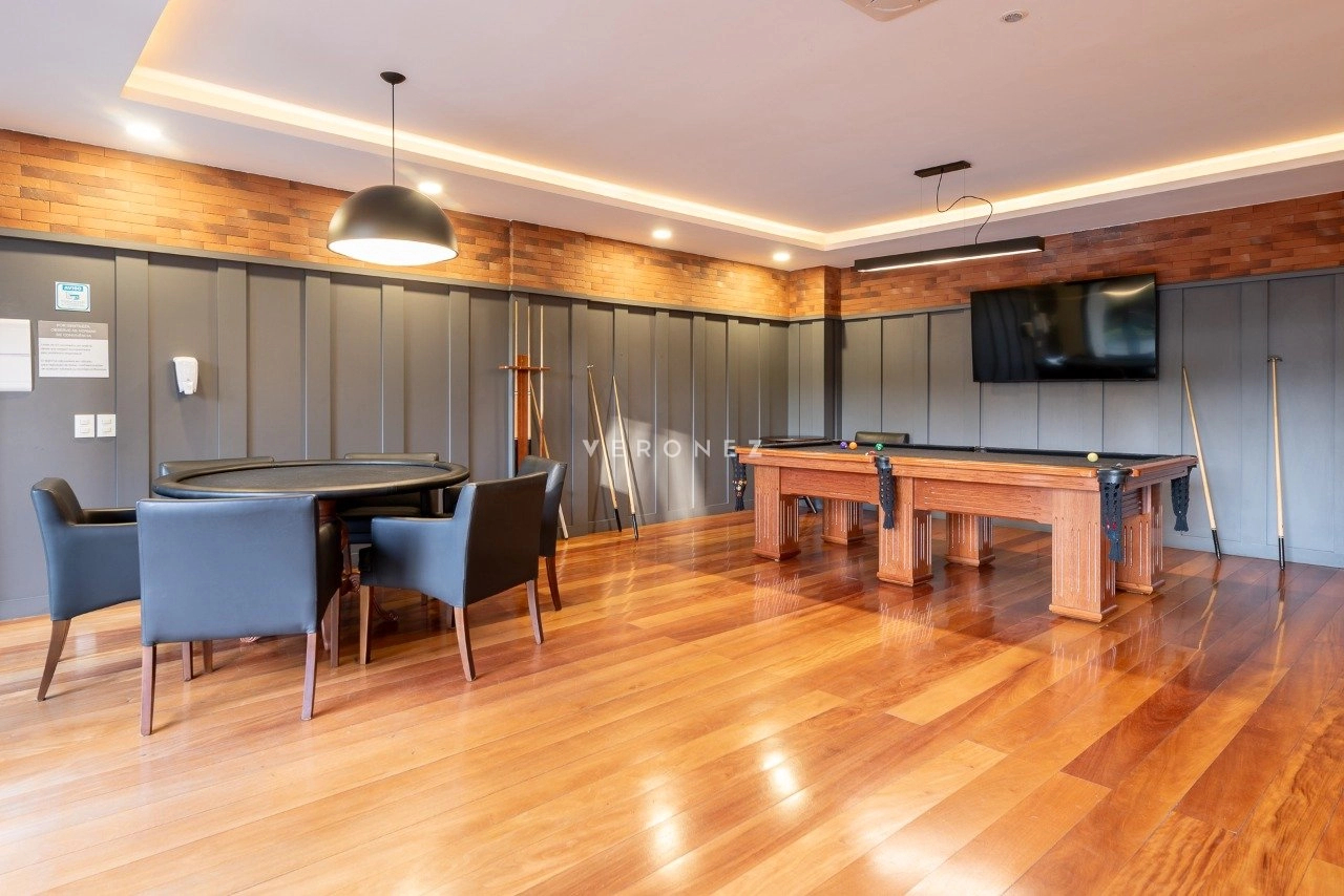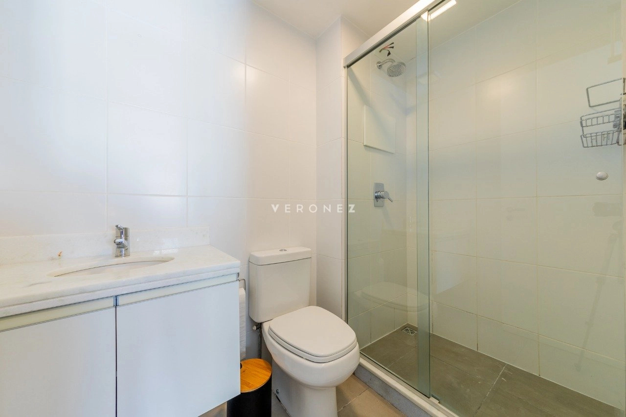 Apartamento mobiliado de 41 m² com 1 suíte, cozinha americana com churrasqueira, área de serviço integrada, lavabo e 2 vagas de garagem.