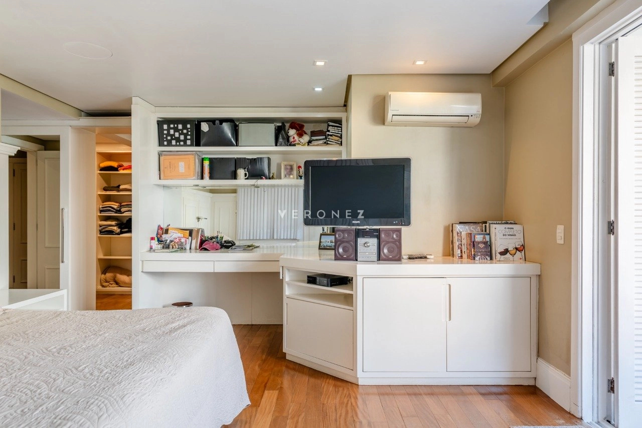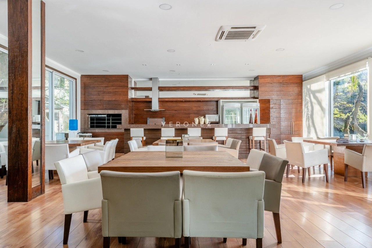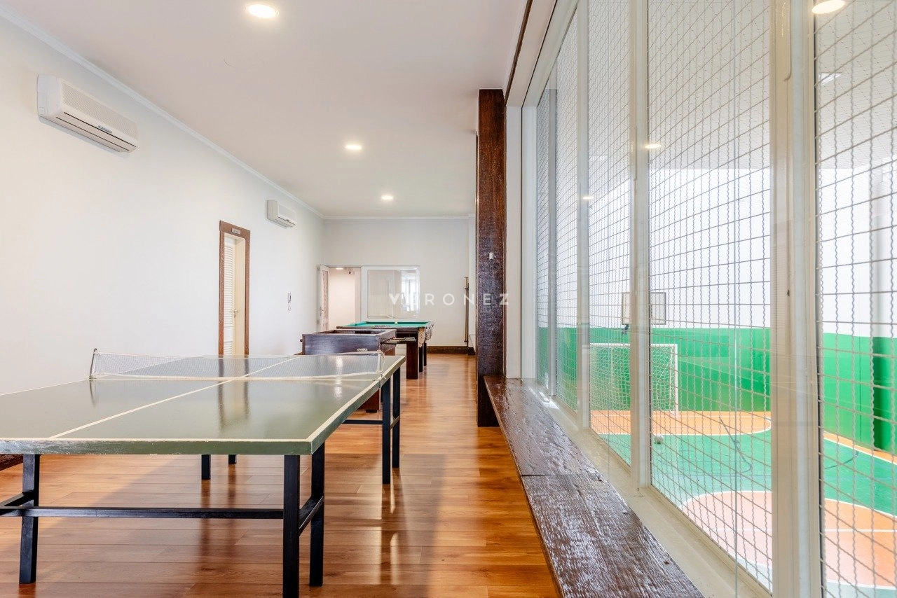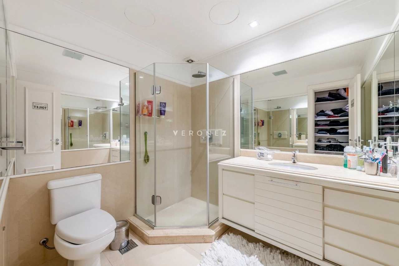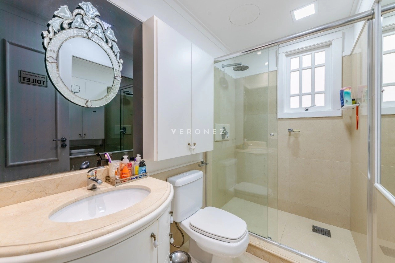 O imóvel conta com 3 suítes com closet, home office, lavabo, dependência completa e banheiro auxiliar, além de elevador interno, proporcionando conforto em todos os níveis.