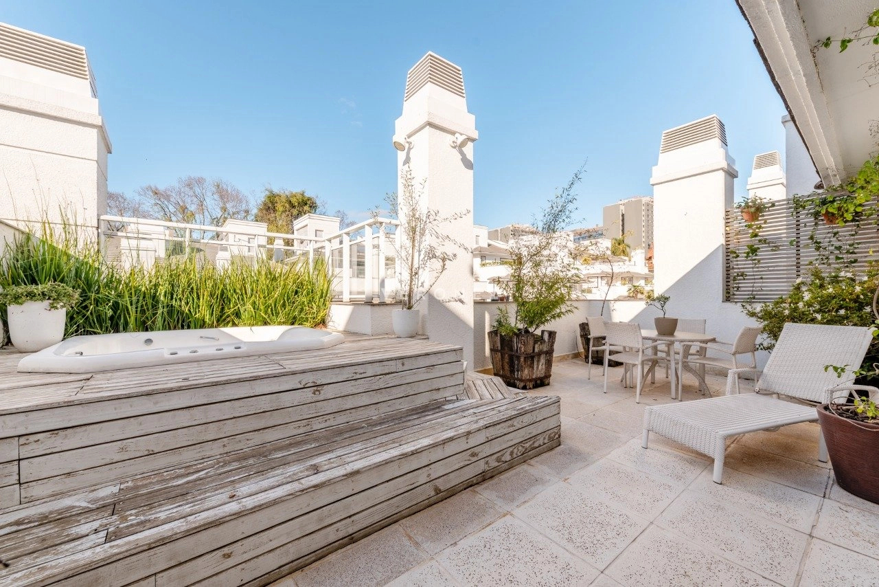 No último andar, um verdadeiro espaço de lazer: sala de TV, churrasqueira com bancada, sala de jantar e um terraço ensolarado com jacuzzi, ideal para relaxar e aproveitar bons momentos em família.