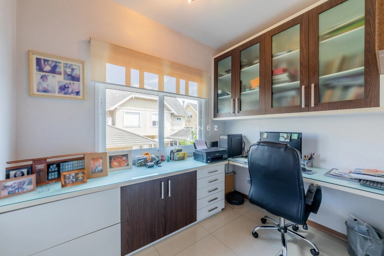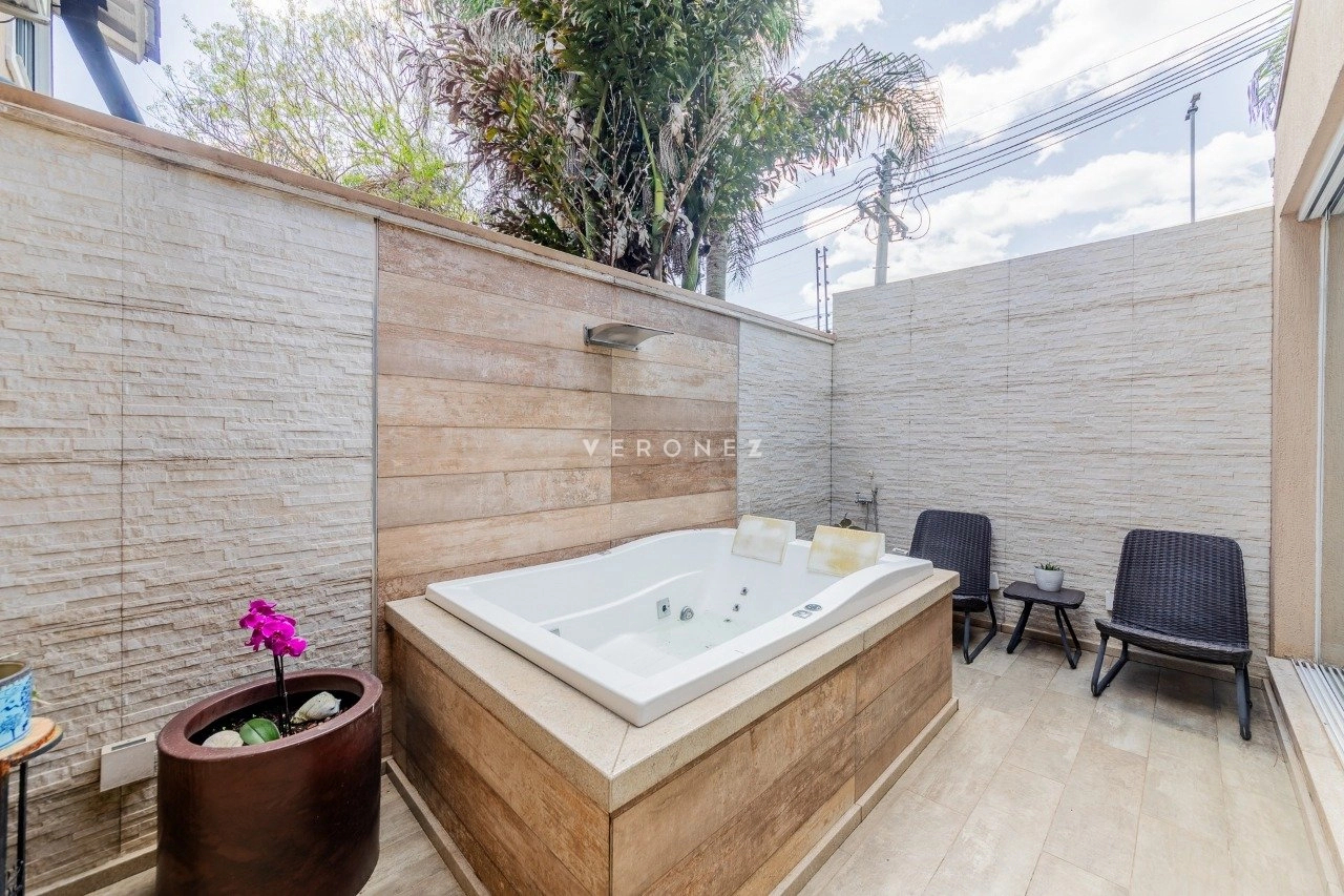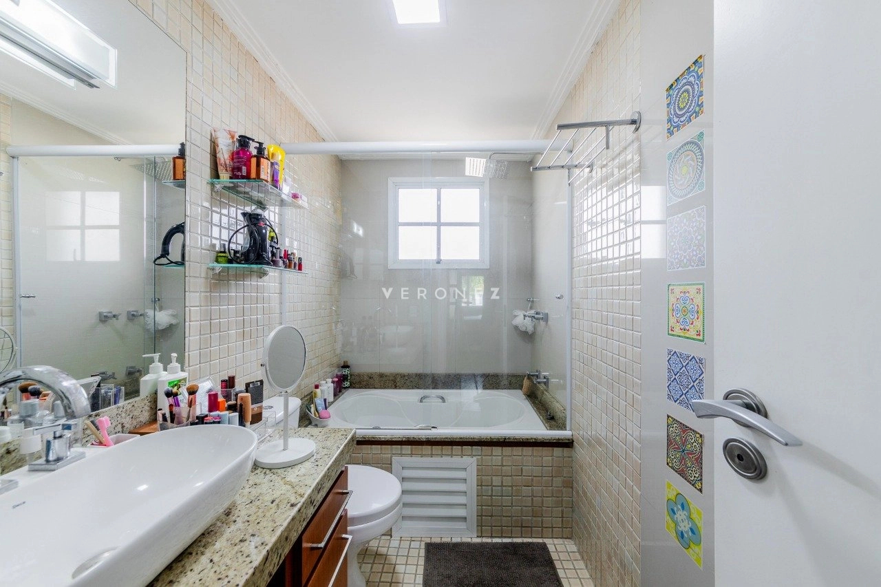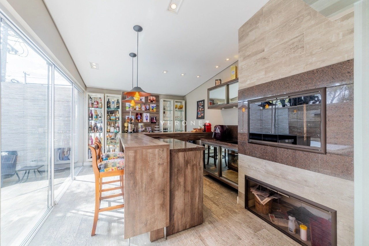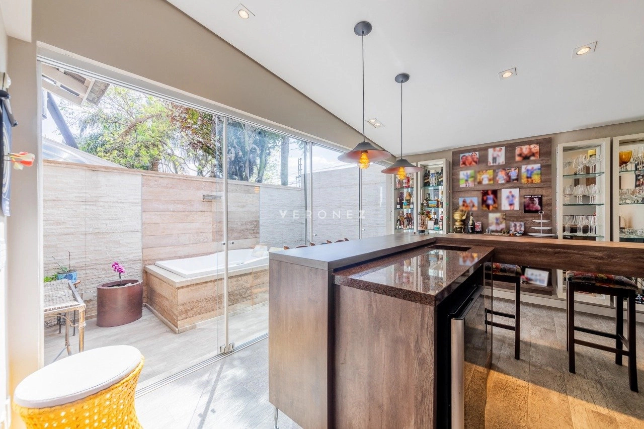 No térreo, o imóvel conta com living para 3 ambientes com lareira, espaço gourmet com churrasqueira, espaço office, lavabo, pátio com jacuzzi e sol da manhã. Cozinha com passa-prato, ampla área de serviço e banheiro auxiliar.