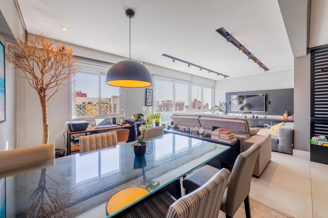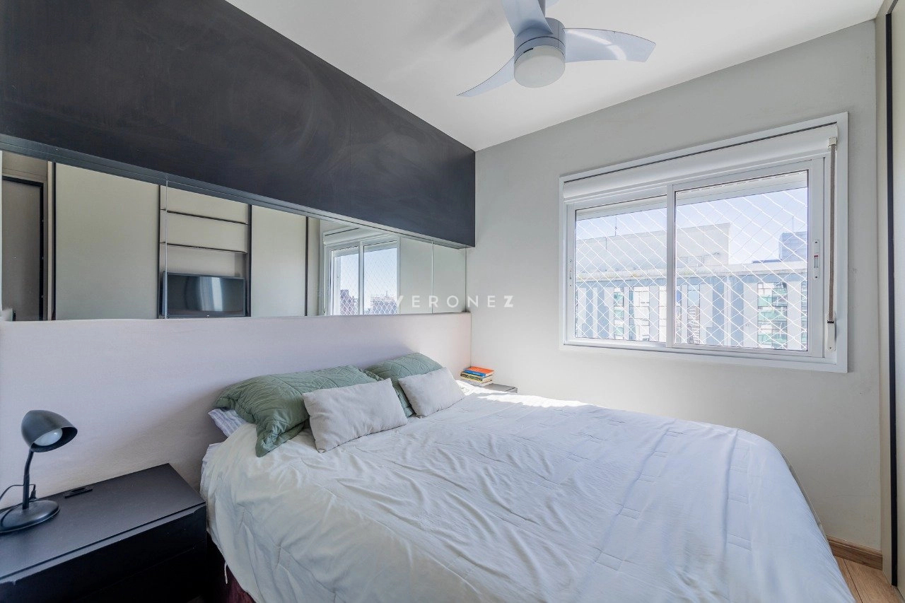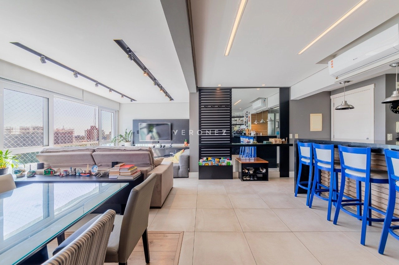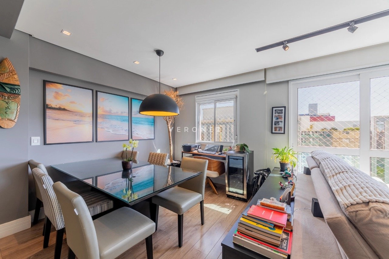 Este apartamento oferece um espaço único e bem distribuído, com 80m² privativos. Originalmente com 3 dormitórios, foi transformado para 2 dormitórios, otimizando o ambiente e criando uma suíte master espaçosa. Possui um amplo living com dois ambientes, iluminado por janelas que vão do piso ao teto, proporcionando uma incrível sensação de amplitude e integração com a luz natural. A cozinha em conceito aberto, equipada com churrasqueira, conecta-se de maneira prática à área de serviço independente.