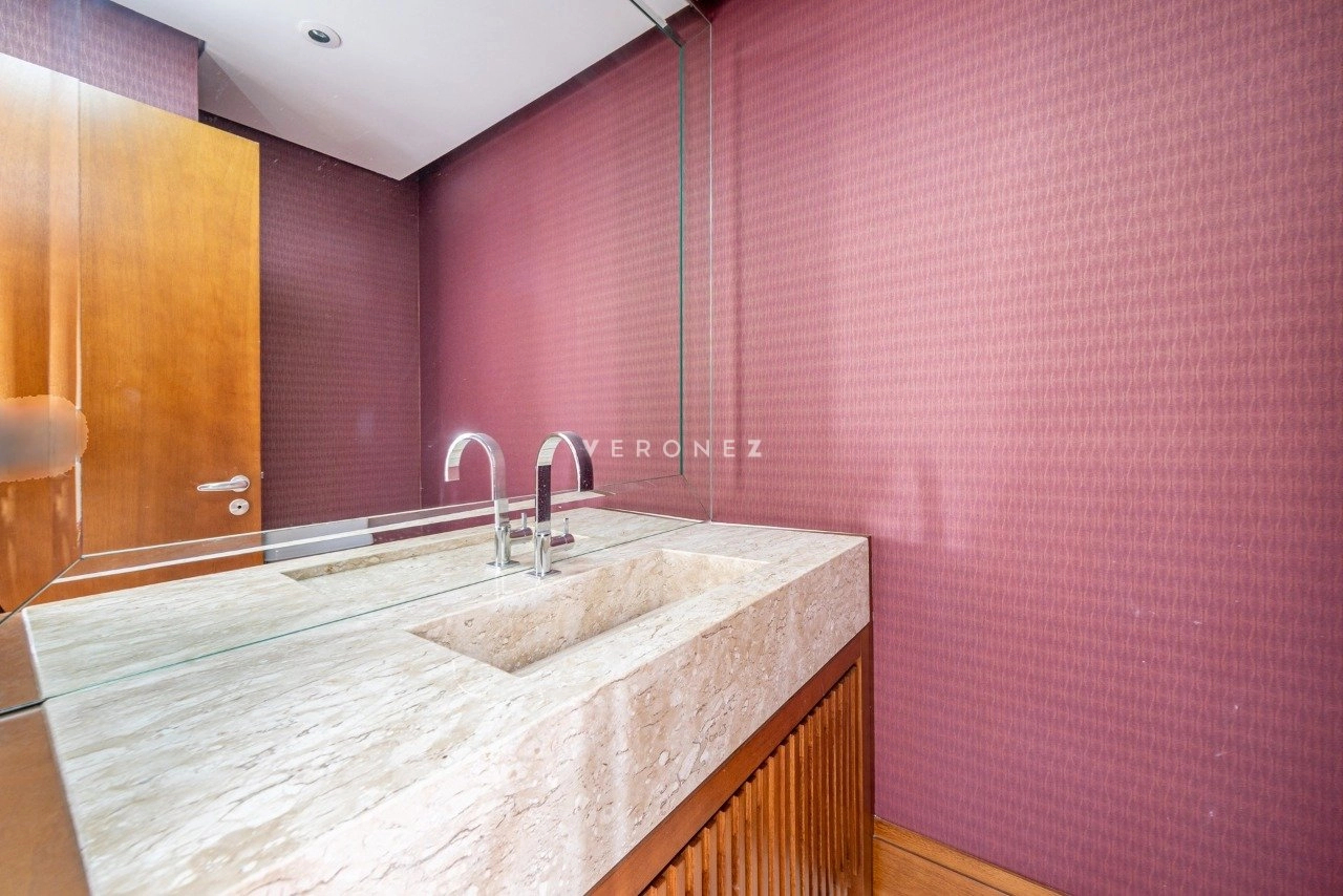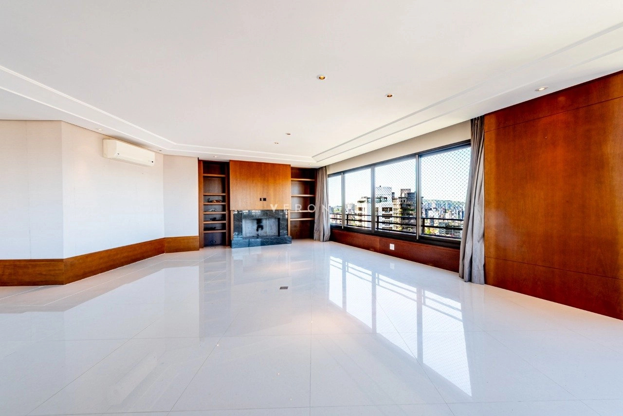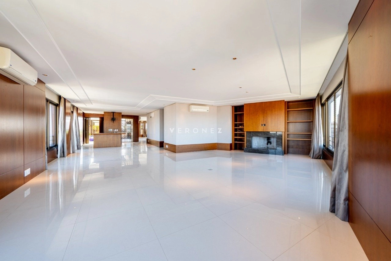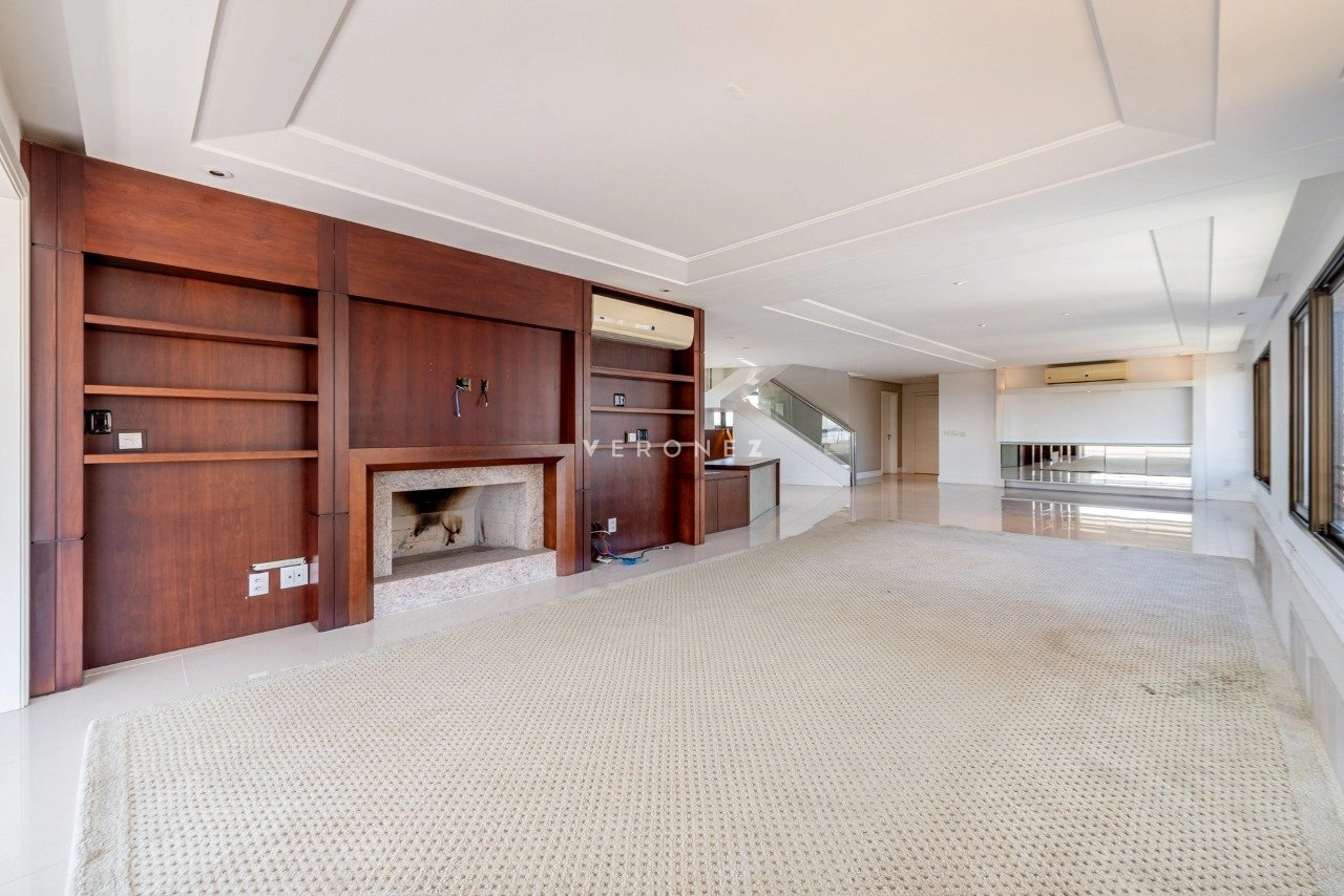 No primeiro pavimento, conta com living para 5 ambientes com lareira, sacada fechada, hall privativo com elevador codificado, entrada social e de serviço com porta blindada, lavabo, copa-cozinha, área de serviço e dependência de empregada completa. Na área íntima, estão os 3 quartos, todos suítes, sendo 1 master com closet e banheiro com chuveiro duplo e banheira. Os banheiros das 3 suítes possuem piso aquecido.