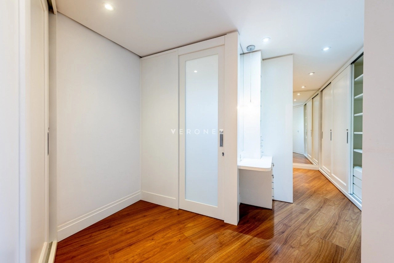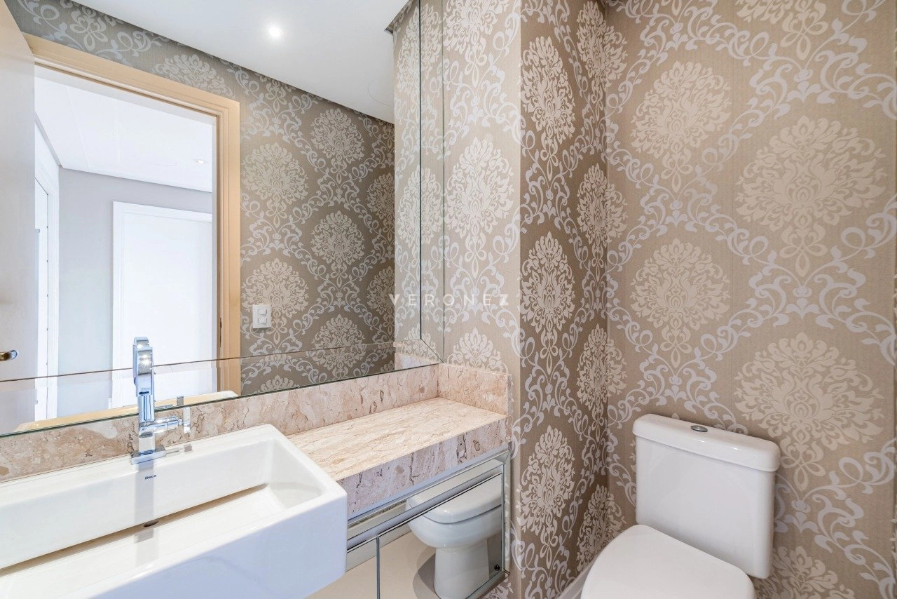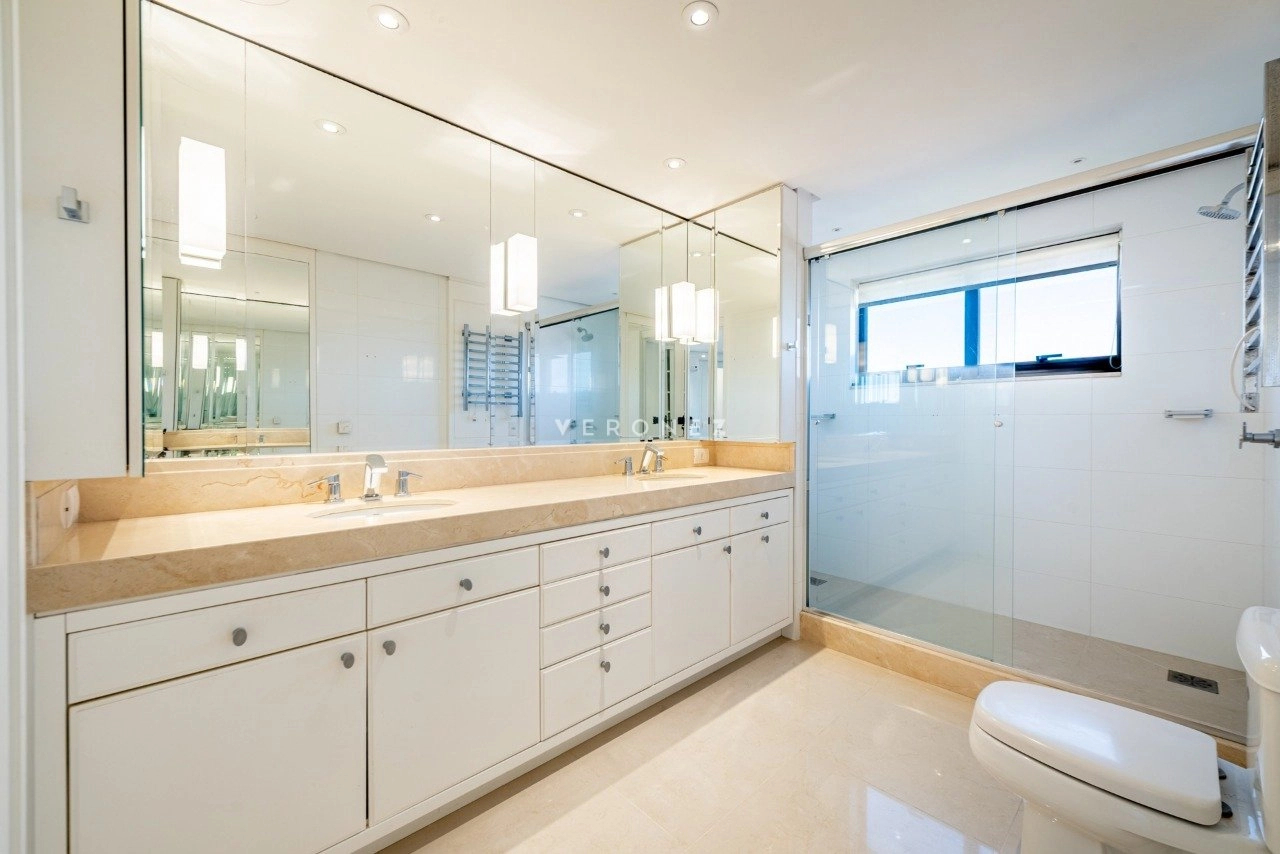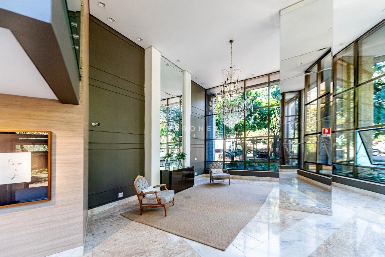No primeiro pavimento, conta com living para 5 ambientes com lareira, sacada fechada, hall privativo com elevador codificado, entrada social e de serviço com porta blindada, lavabo, copa-cozinha, área de serviço e dependência de empregada completa. Na área íntima, estão os 3 quartos, todos suítes, sendo 1 master com closet e banheiro com chuveiro duplo e banheira. Os banheiros das 3 suítes possuem piso aquecido.