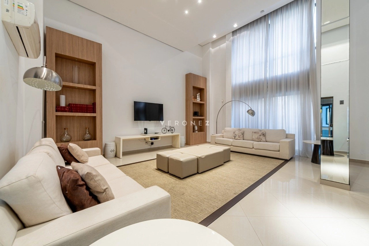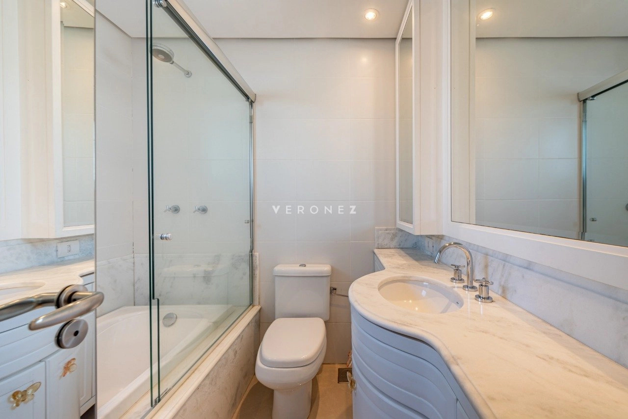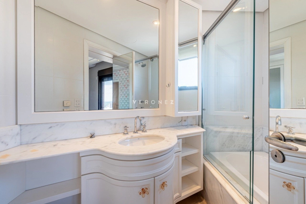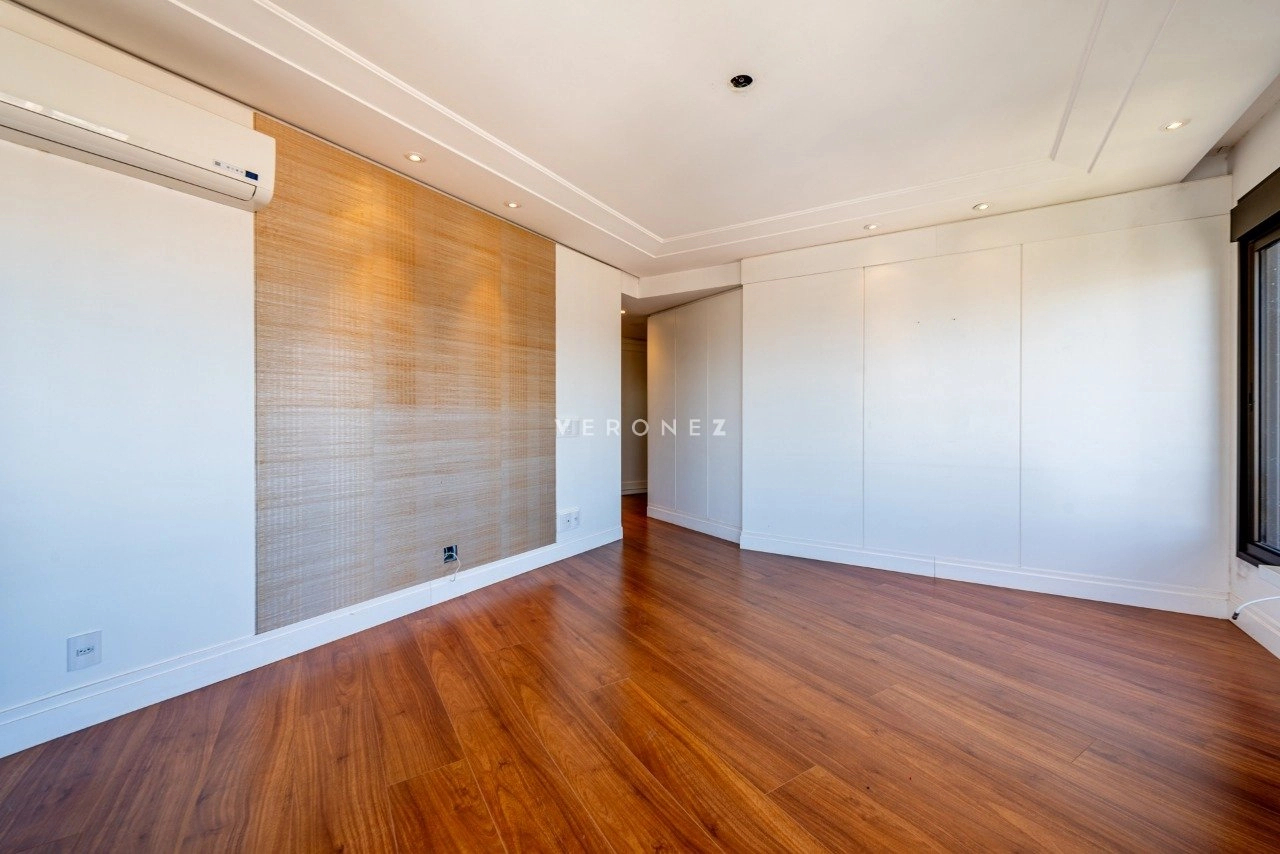 No primeiro pavimento, conta com living para 5 ambientes com lareira, sacada fechada, hall privativo com elevador codificado, entrada social e de serviço com porta blindada, lavabo, copa-cozinha, área de serviço e dependência de empregada completa. Na área íntima, estão os 3 quartos, todos suítes, sendo 1 master com closet e banheiro com chuveiro duplo e banheira. Os banheiros das 3 suítes possuem piso aquecido.