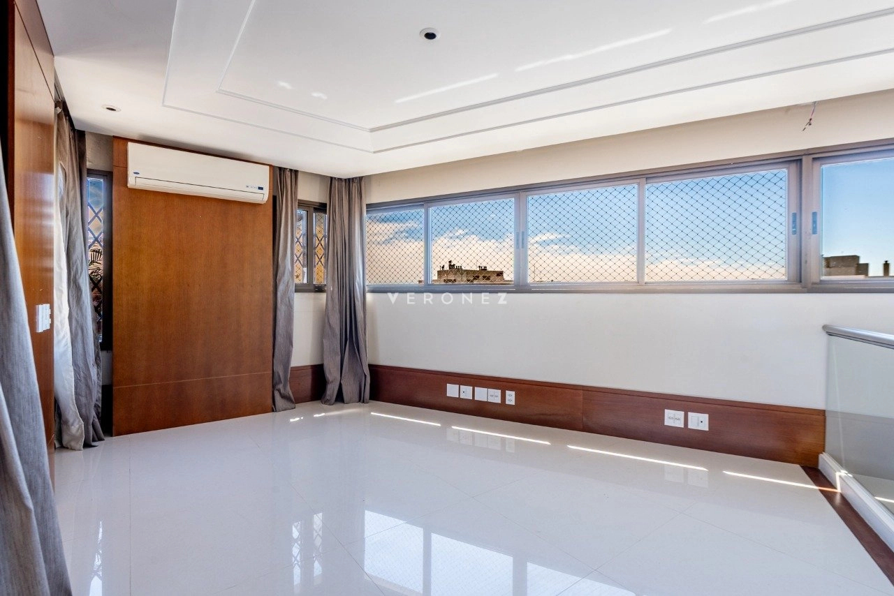 No segundo pavimento, há amplo living para 5 ambientes com lareira, churrasqueira, espaço gourmet com adega para mais de 200 rótulos, lavabo e terraço com piscina, proporcionando uma vista deslumbrante de 360° da cidade. O imóvel conta ainda com 5 vagas de garagem.