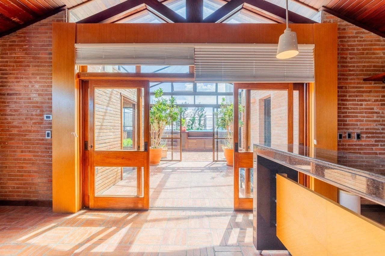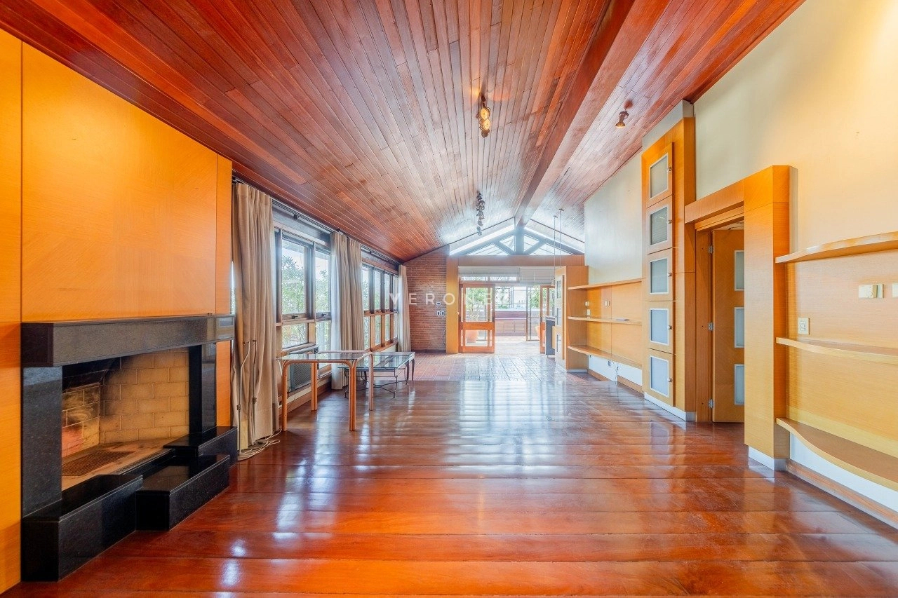 No segundo pavimento, há living para 2 ambientes com lareira, 1 suíte, banheiro completo, cozinha gourmet com churrasqueira, adega e um amplo terraço com vista panorâmica de 360°, piscina, solarium e área de serviço com lavanderia externa e escada auxiliar.