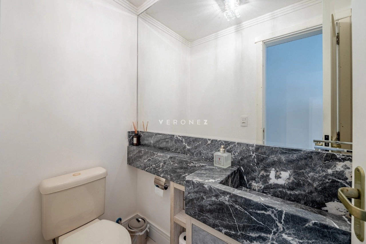 A área superior conta com piscina aquecida, lareira, espaço gourmet com churrasqueira, lavabo e um ambiente extra que pode ser adaptado como escritório ou jardim de inverno.