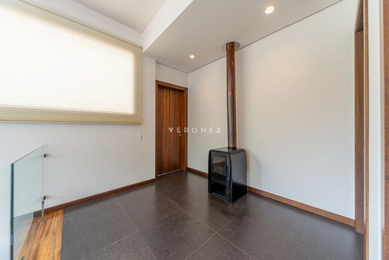 No primeiro pavimento, o living para dois ambientes conta com lareira, churrasqueira e ampla vista para a natureza do condomínio, além de um escritório que complementa a área social com praticidade.