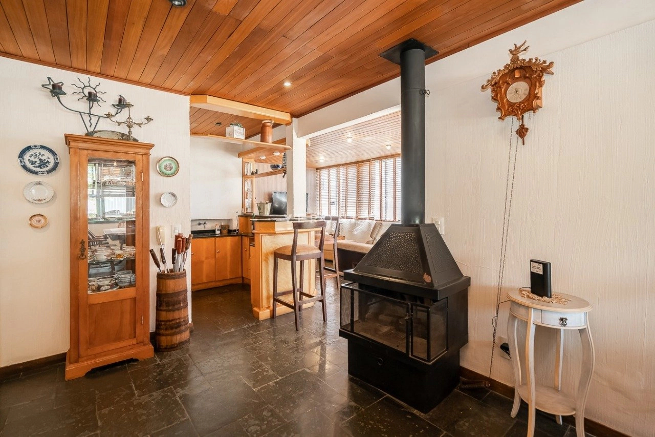 No pavimento superior, destaque para o espaço gourmet com churrasqueira, sala com lareira, lavabo, sala de TV, depósito e uma área externa com piscina privativa.