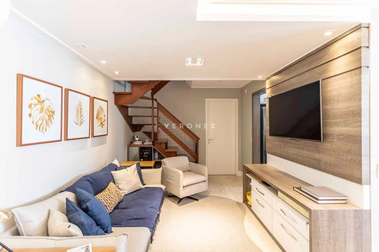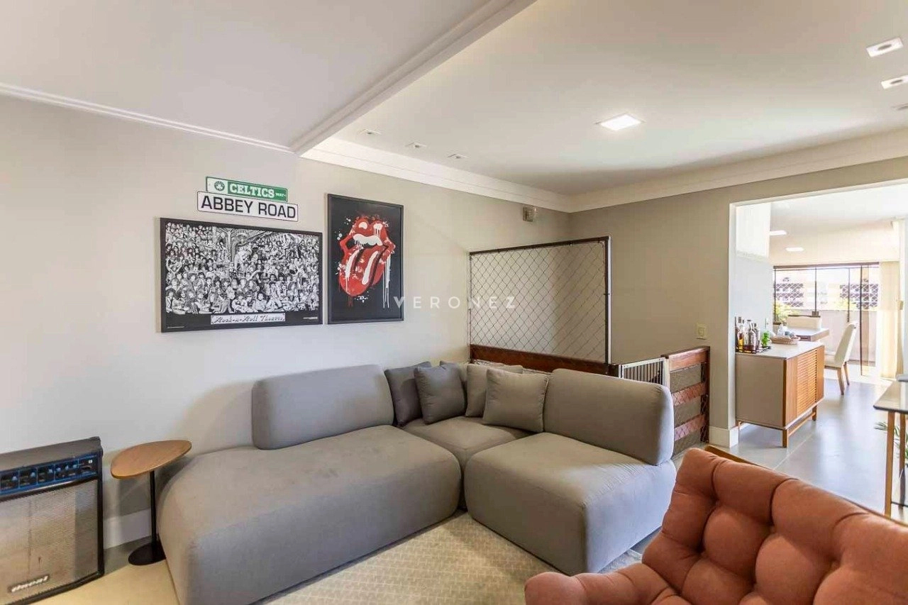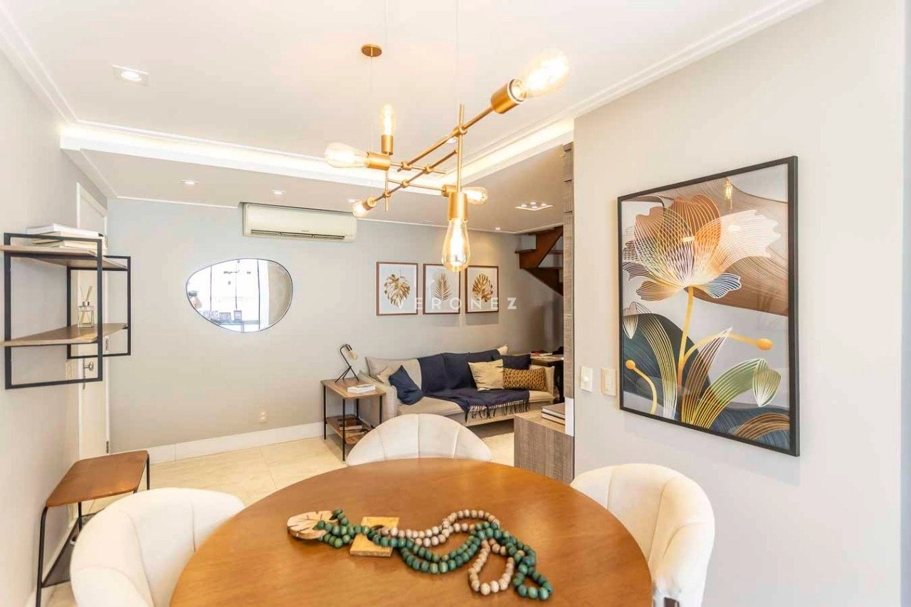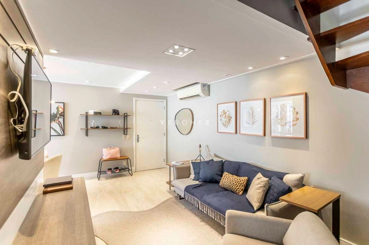 Cobertura com 178 m², 3 quartos transformados em 2, sendo 1 suíte com closet e sacada, com possibilidade de reversão. No pavimento inferior, o imóvel conta com amplo living para 2 ambientes, lavabo, cozinha mobiliada e área de serviço.