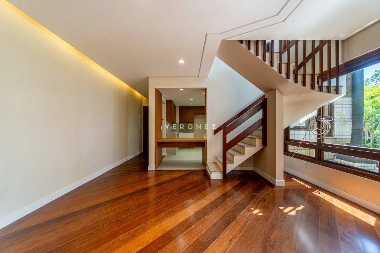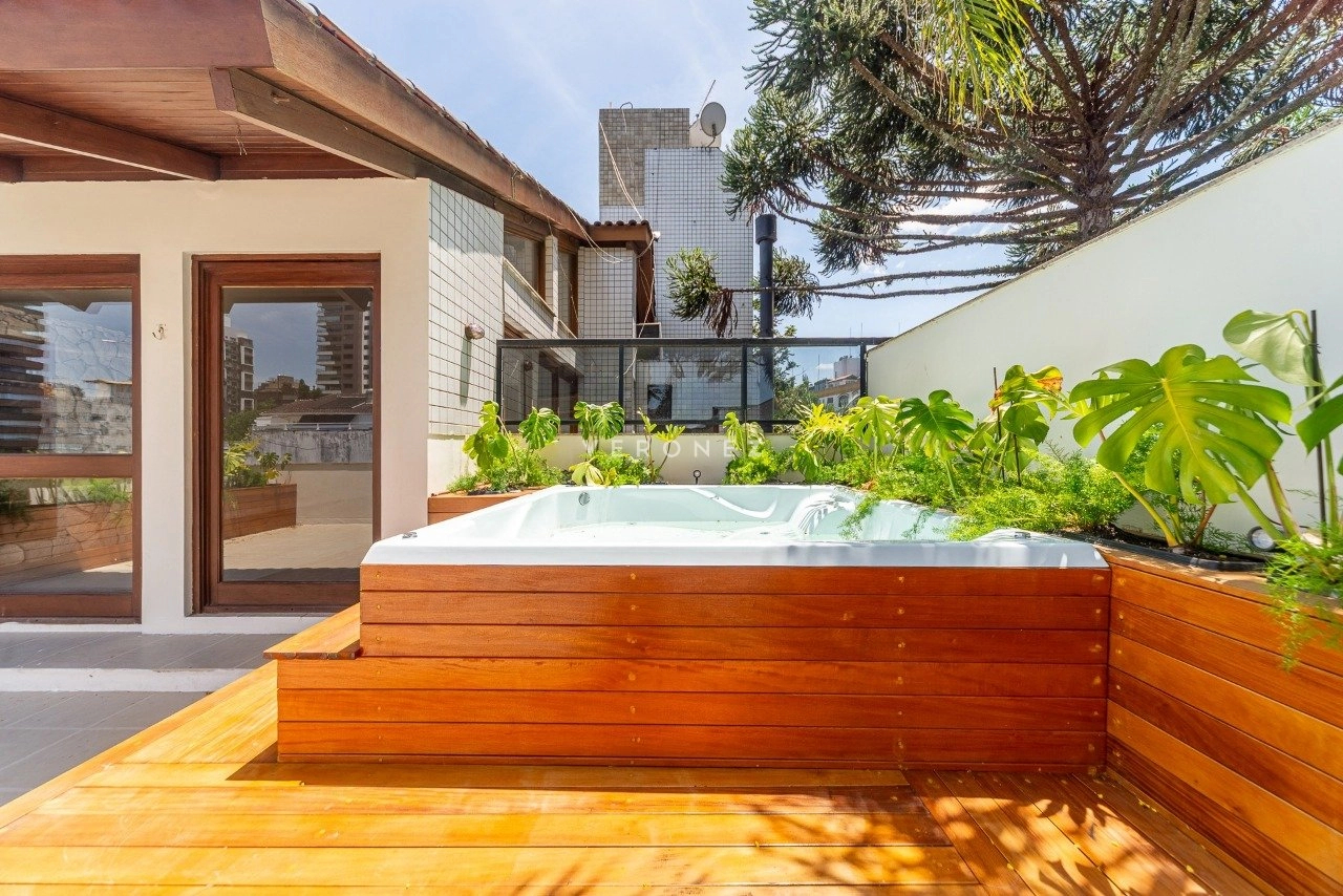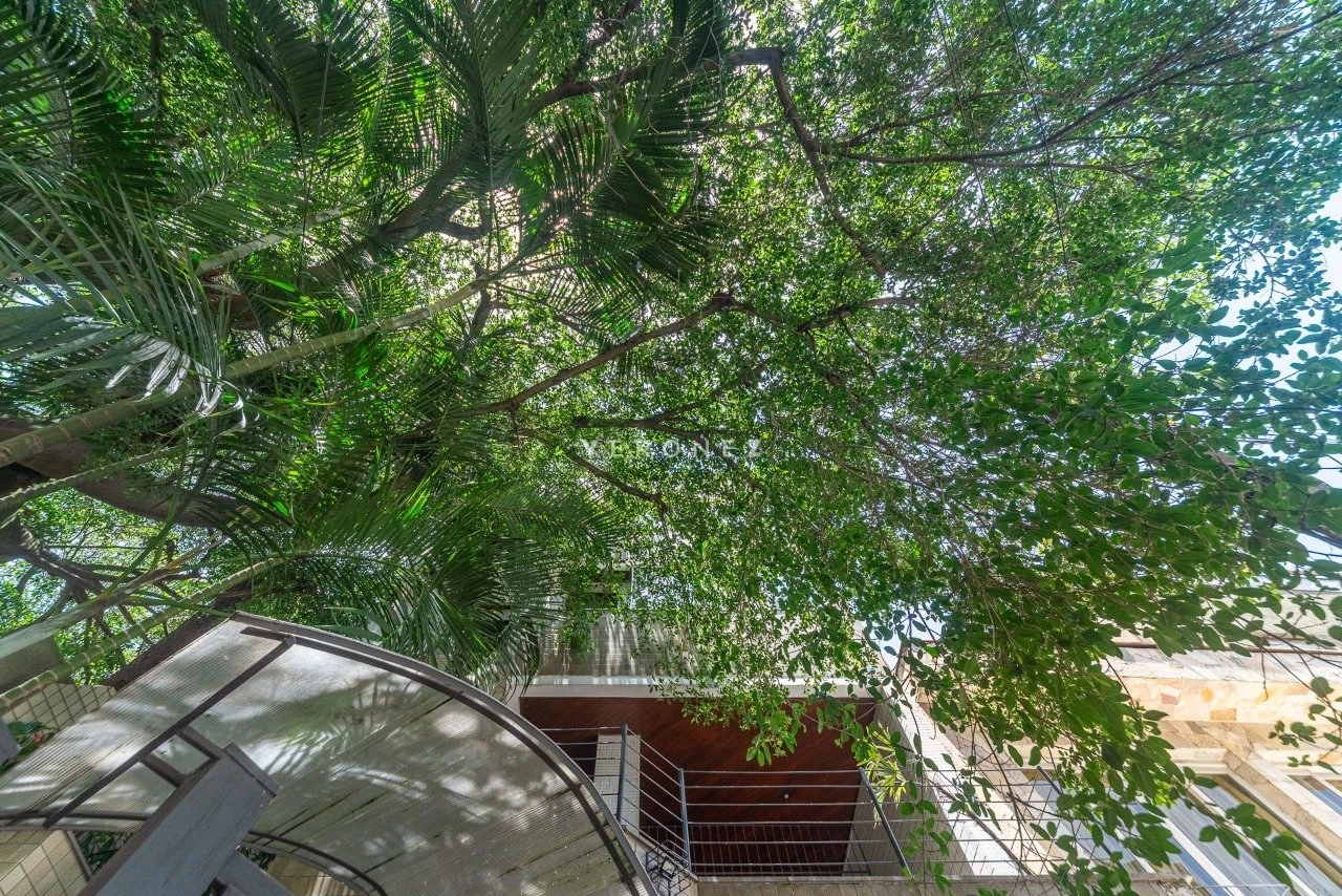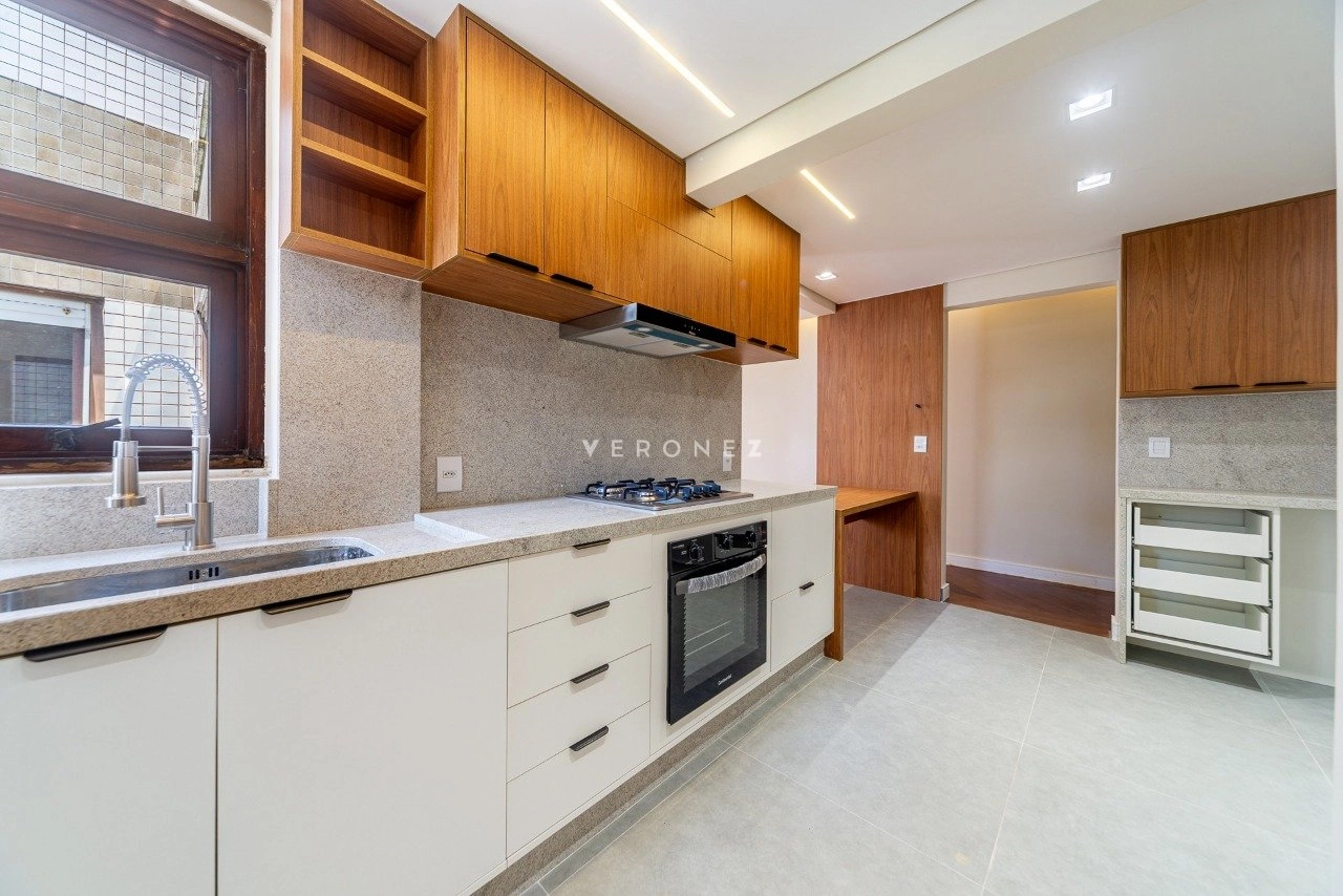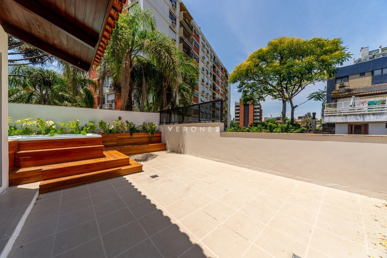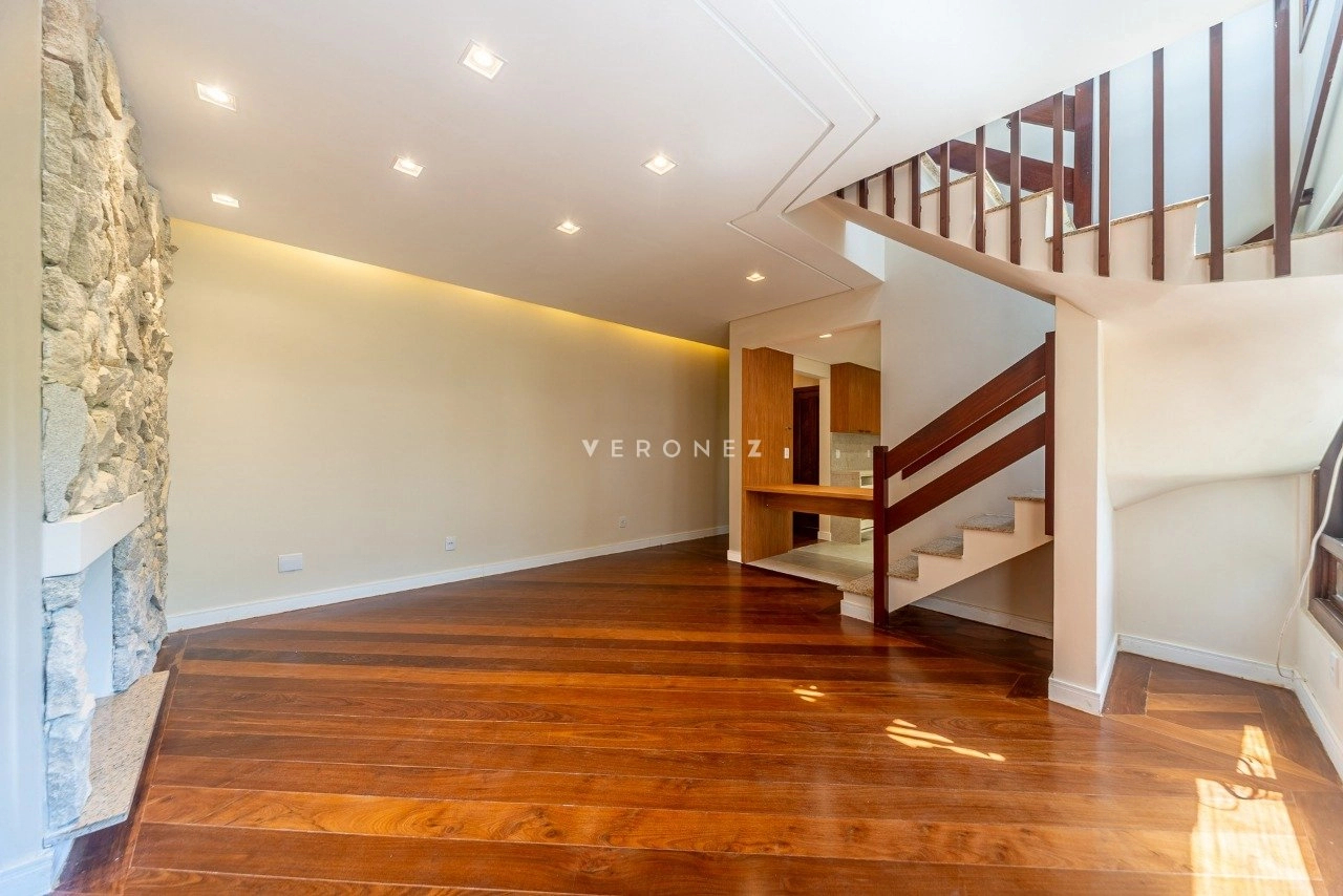 Cobertura com 198 m², reformada, 2 dormitórios e 2 suítes. No primeiro pavimento, conta com living com lareira, cozinha americana planejada com eletrodomésticos, lavanderia separada e banheiro auxiliar. As suítes possuem vista para o verde e recebem sol da manhã.