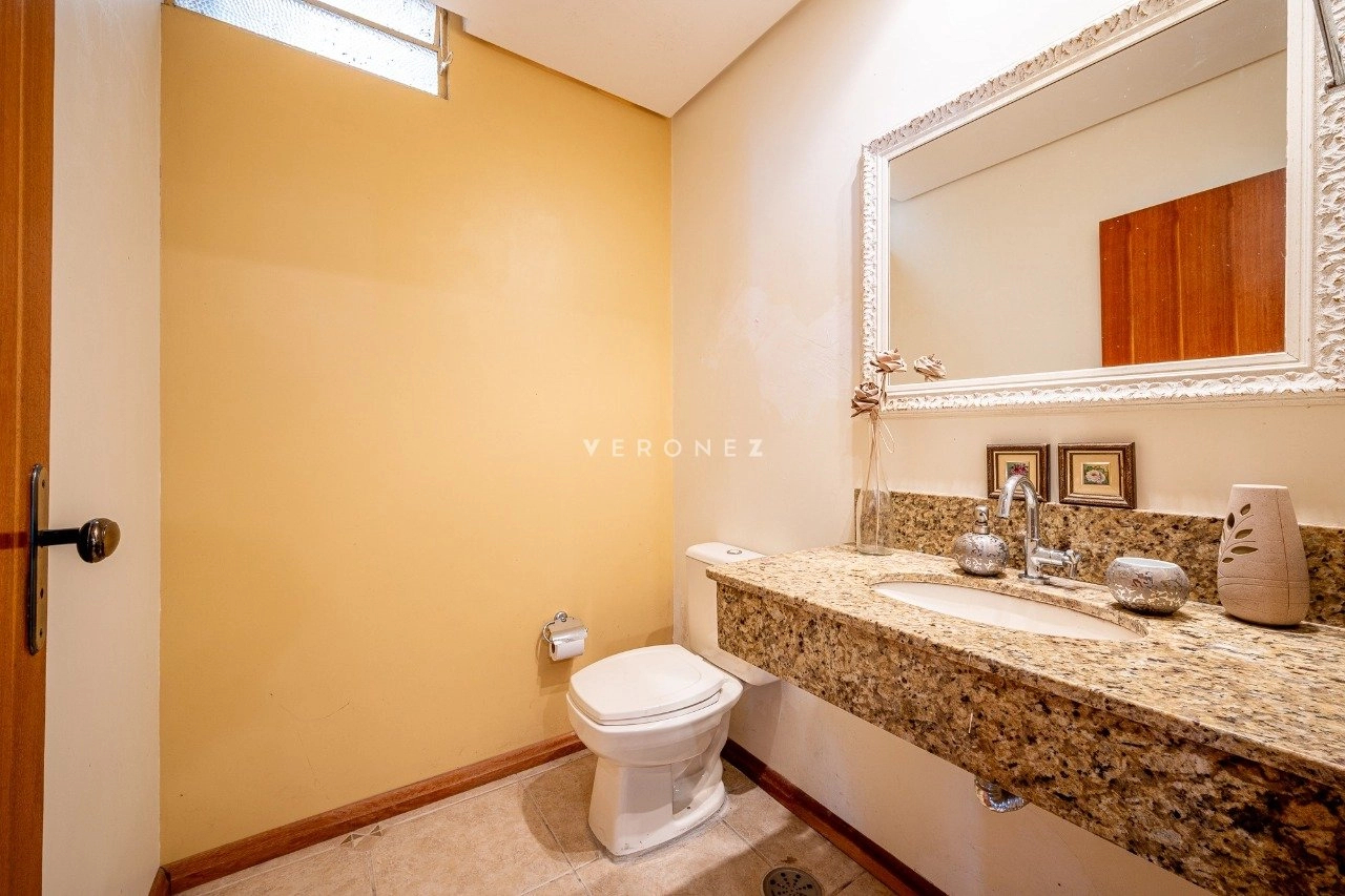 No nível inferior, a casa dispõe de piscina, área de churrasqueira, banheiro de apoio, uma sala adicional, ampla lavanderia e depósito. A garagem é coberta para 2 veículos grandes.