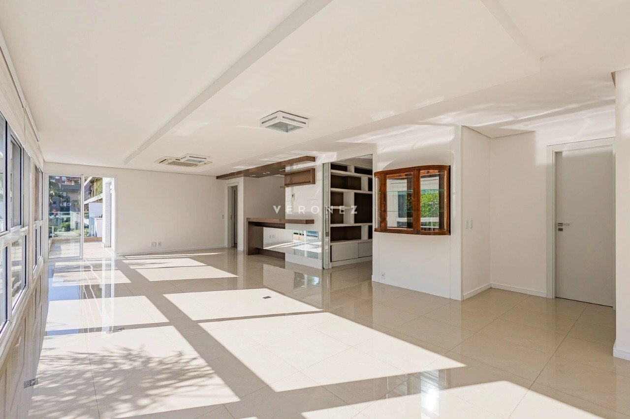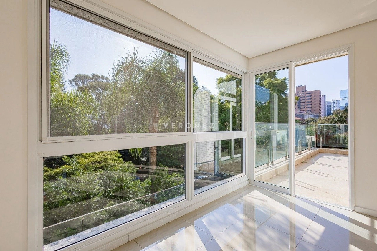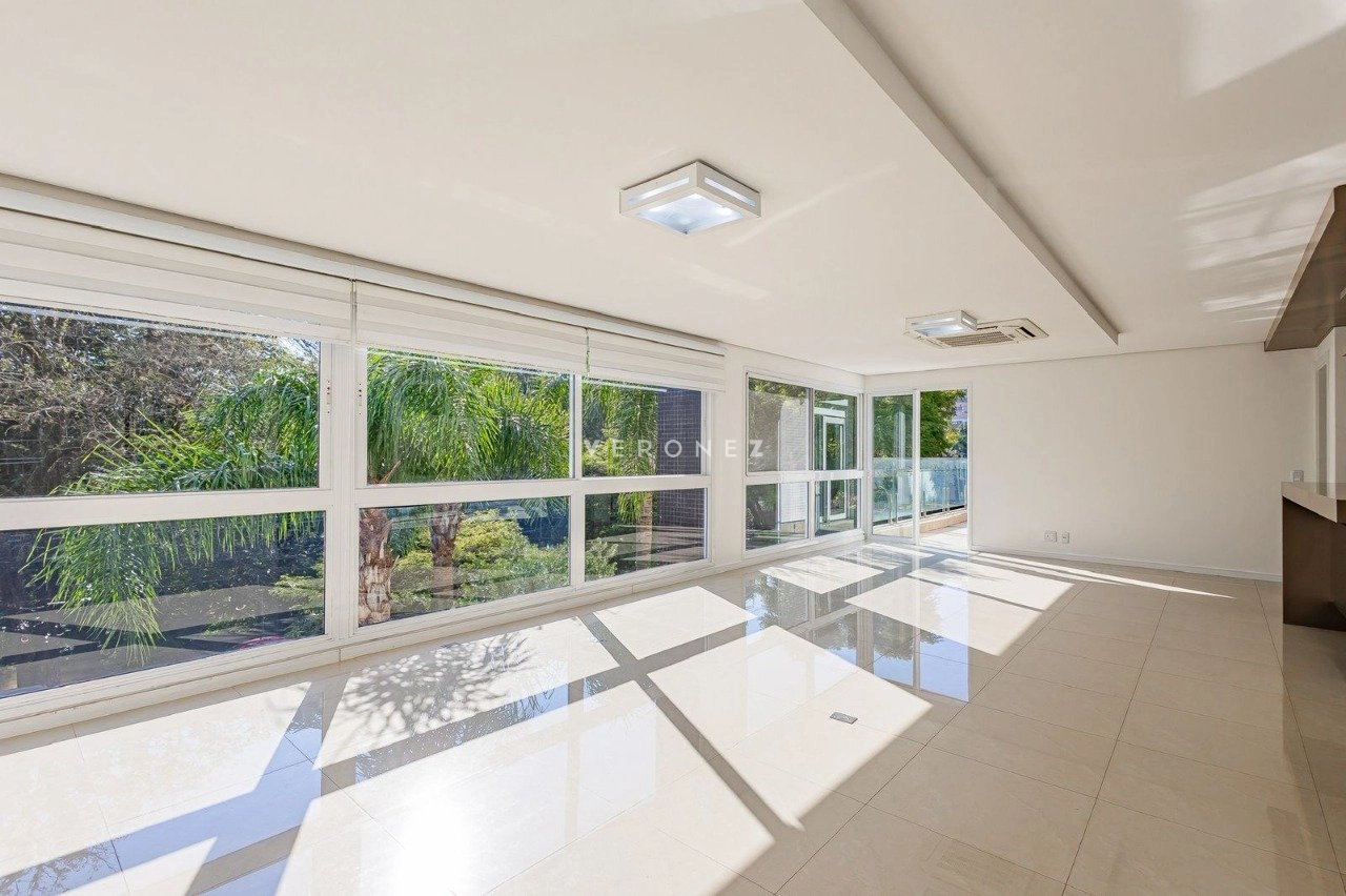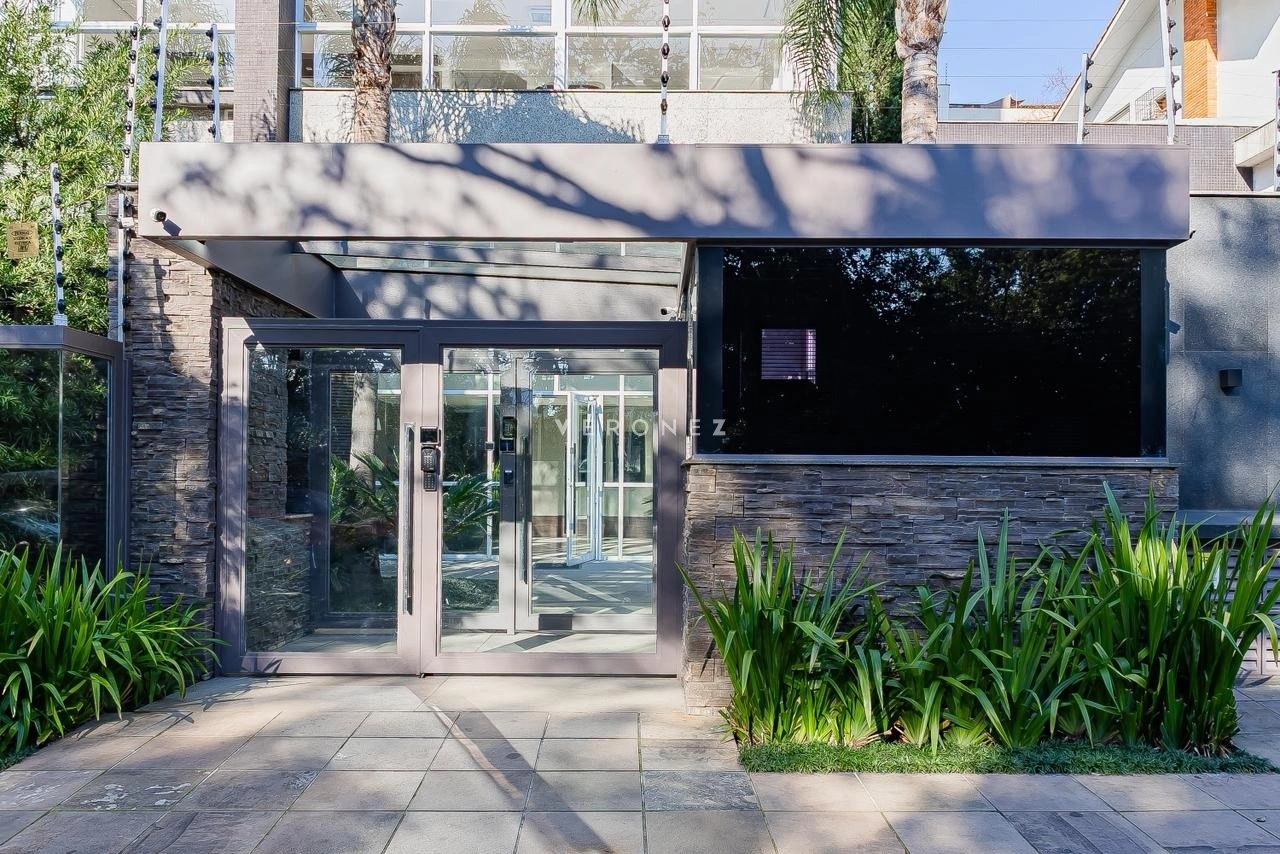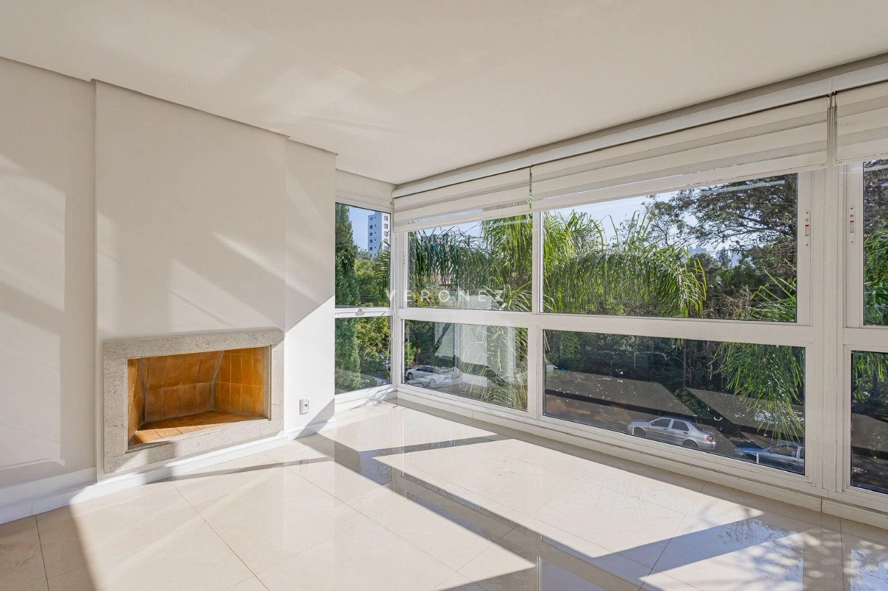 Apartamento de 305m², com 3 suítes. Possui living para dois ambientes com lareira, amplo garden com piscina privativa e 135 m² de pátio, churrasqueira, cozinha, área de serviço, 5 banheiros, 4 vagas de garagem e dois depósitos individuais.