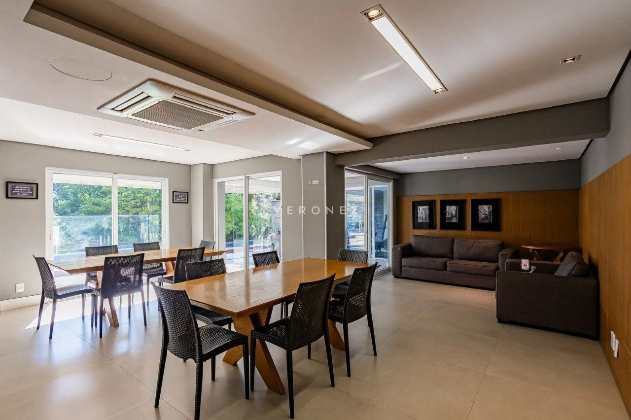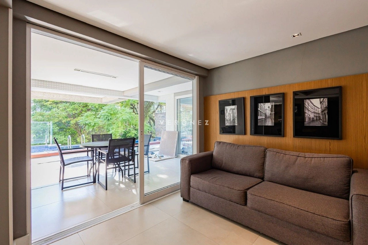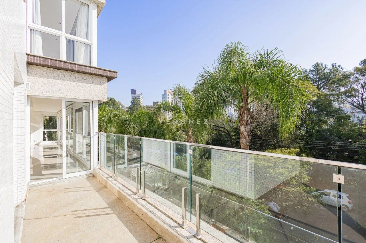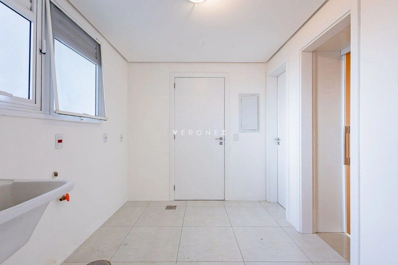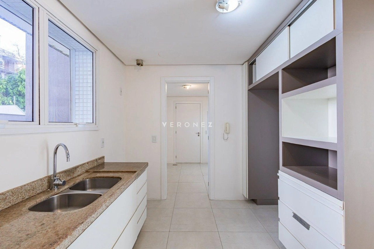 Apartamento de 305m², com 3 suítes. Possui living para dois ambientes com lareira, amplo garden com piscina privativa e 135 m² de pátio, churrasqueira, cozinha, área de serviço, 5 banheiros, 4 vagas de garagem e dois depósitos individuais.