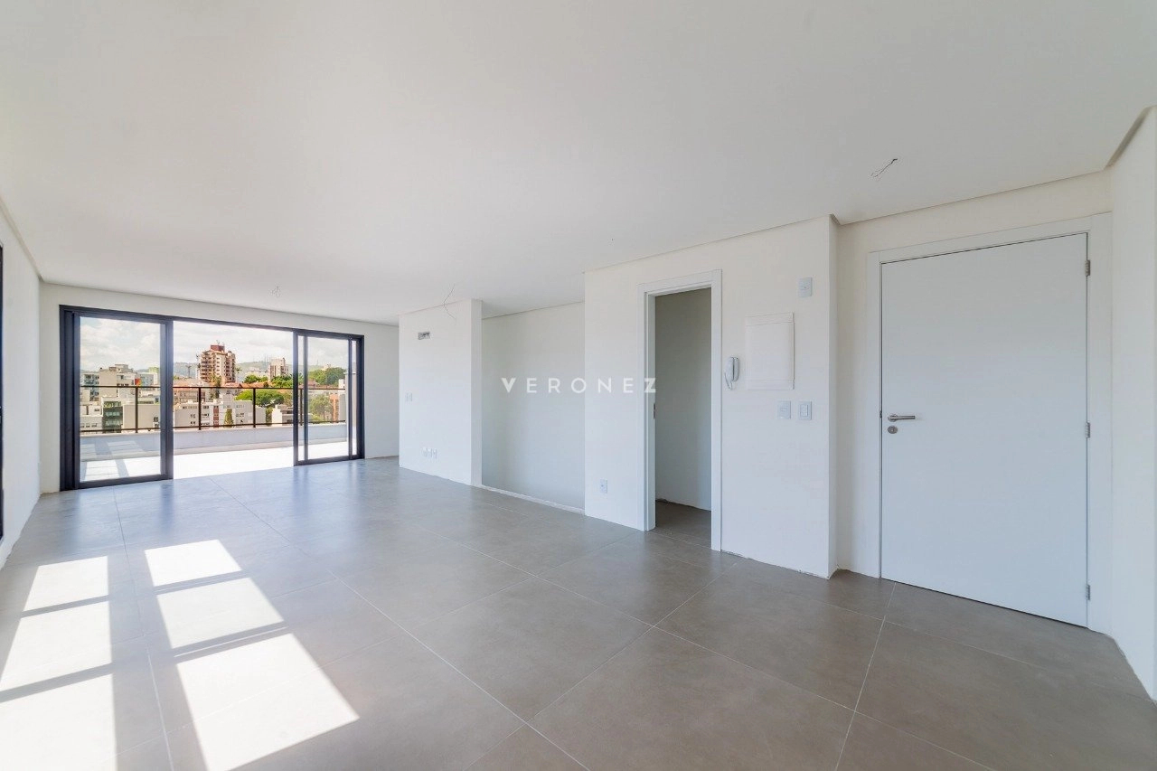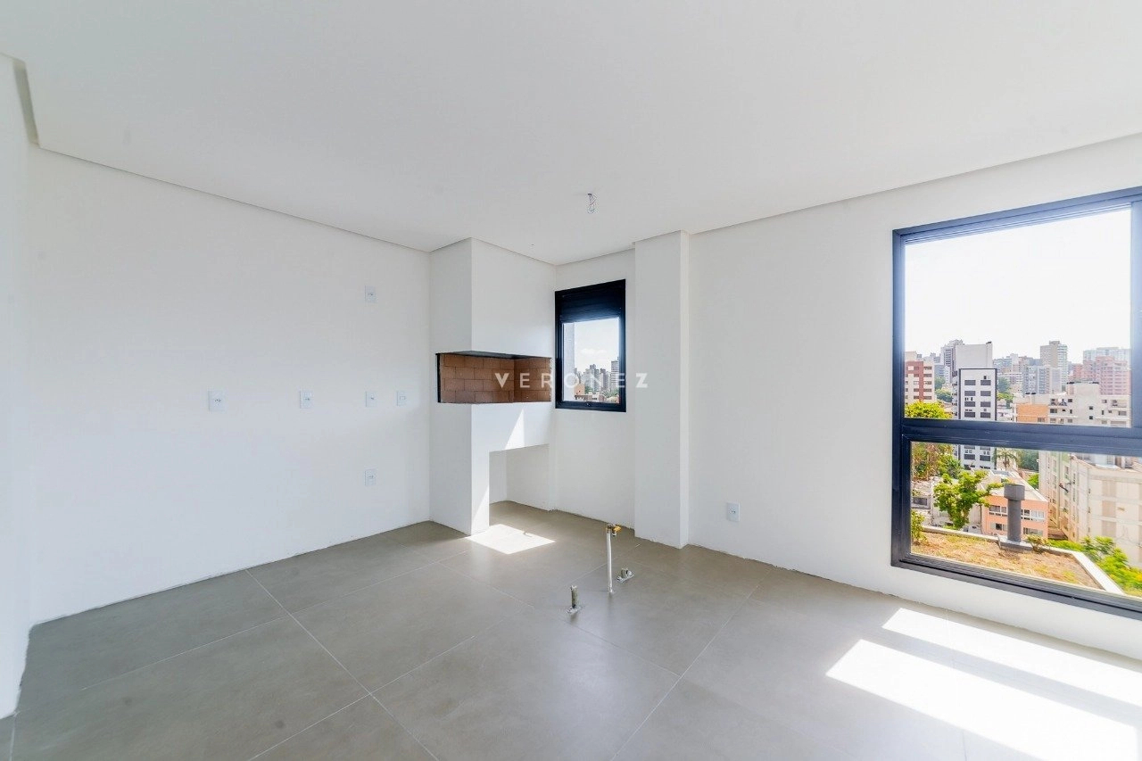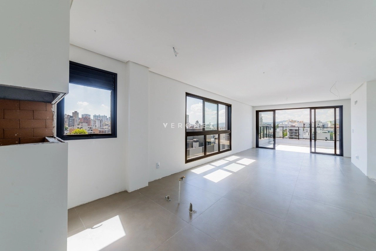 Cobertura duplex de 133 m², com 2 dormitórios, sendo 2 suítes. O living é amplo e conta com lareira e churrasqueira, integrando os ambientes de forma funcional. O imóvel possui ainda cozinha e área de serviço. O terraço oferece ampla vista, e o imóvel conta com espera para jacuzzi e hidromassagem. São 2 vagas de garagem.