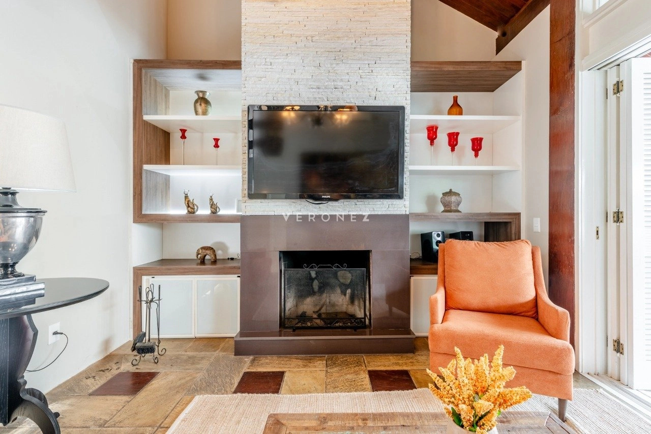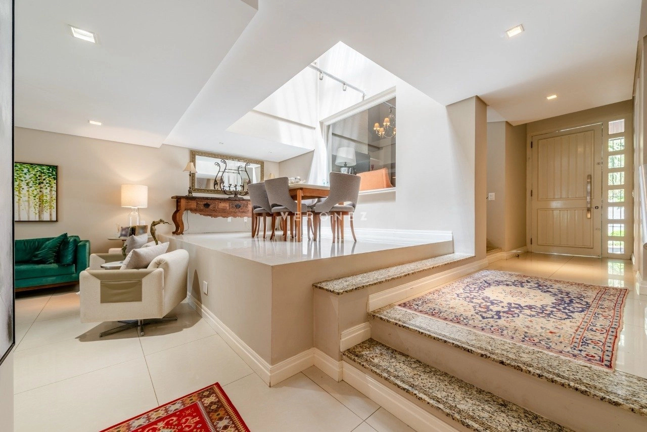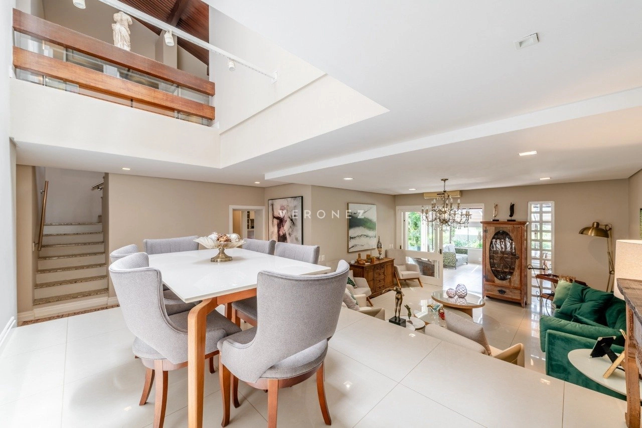 No pavimento inferior, o imóvel oferece um living amplo e acolhedor, com lareira, integrado à sala de jantar, criando um ambiente ideal para receber. A cozinha planejada possui acesso direto à área de serviço independente, trazendo praticidade ao dia a dia. O espaço gourmet com churrasqueira complementa a área social, além de contar com depósito e garagem para até 4 veículos, sendo 2 vagas cobertas.
